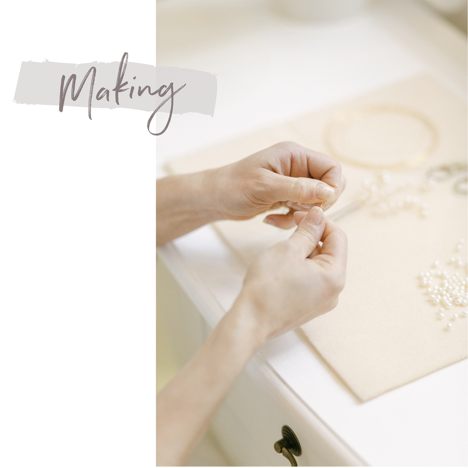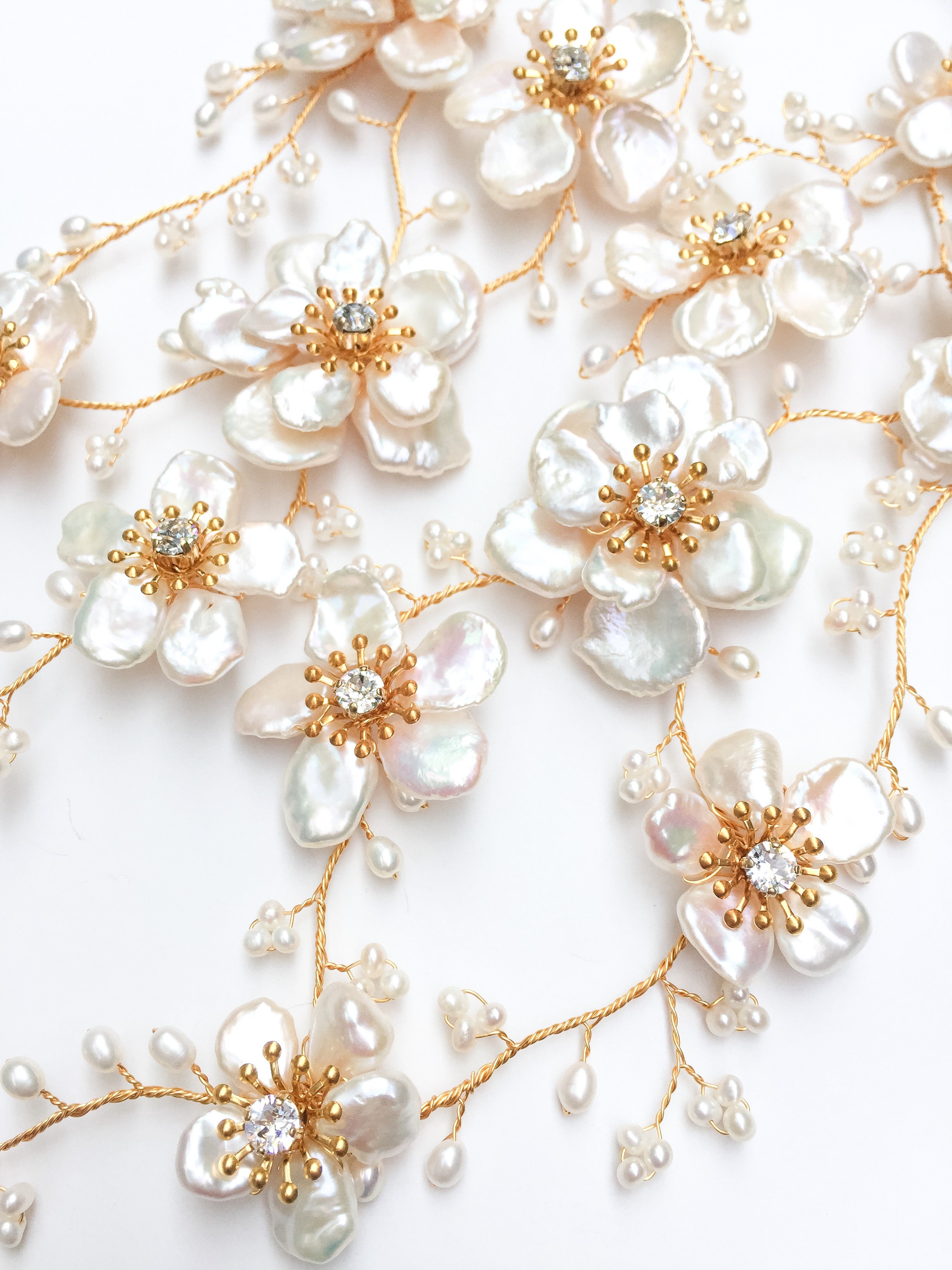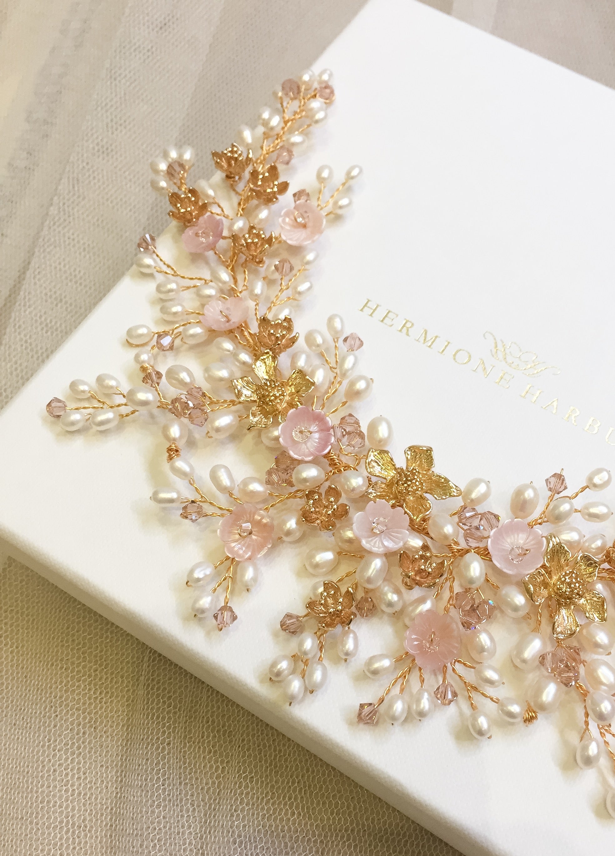 Your designs will be handmade in Hermione’s beautiful showroom studio. Each piece starts it’s life as heavenly little piles of loose freshwater pearls, Swarovski crystals, and gemstones. Hermione also uses 24ct gold plated flowers and leaves, alongside sheets of brass that are hand cut and shaped into blooms and organic shapes.