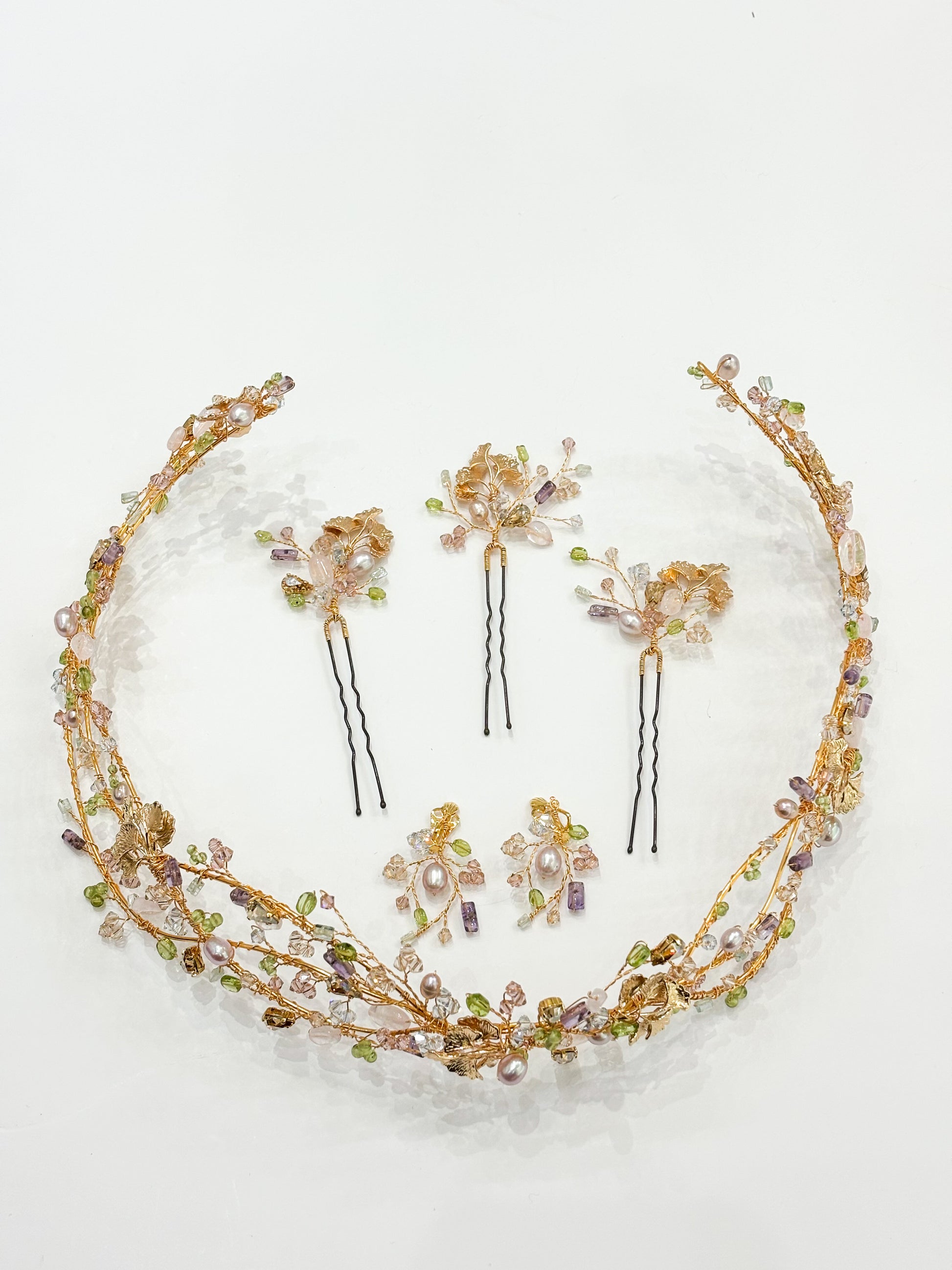 A stunning trio created from golden wires, embellished with golden leaves, Swarovski crystals, pearls, and soft pastel tones. Pale green peridot, lilac amethyst, blush rose quartz and ice blue and champagne Swarovski. A matching item to the Ariel Meadow Circlet Crown and Earrings (see images). This beautiful one of a kind hairpin set was inspired by wildflowers in English Meadows.