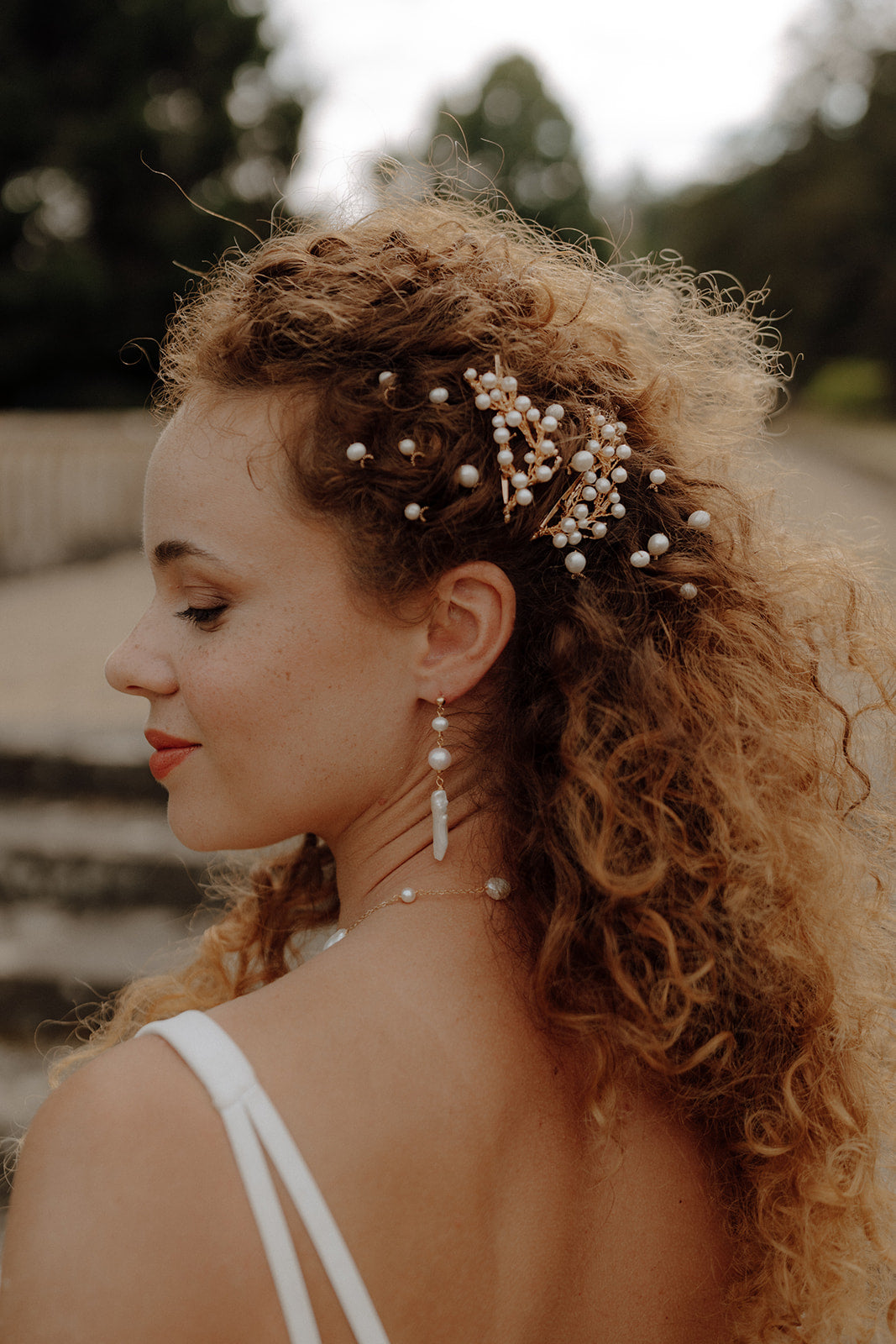 Two elegant hair slides composed of golden tendrils and embellished with freshwater pearls for the most chic finish to your bridal look.