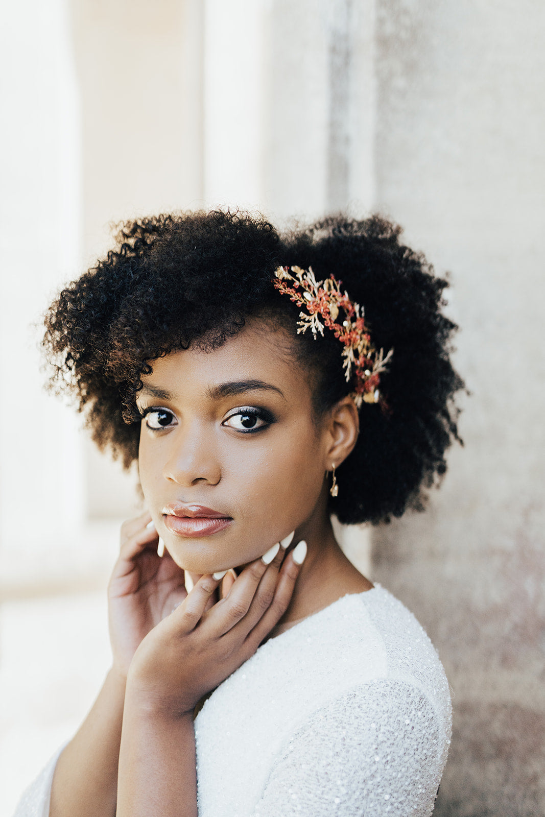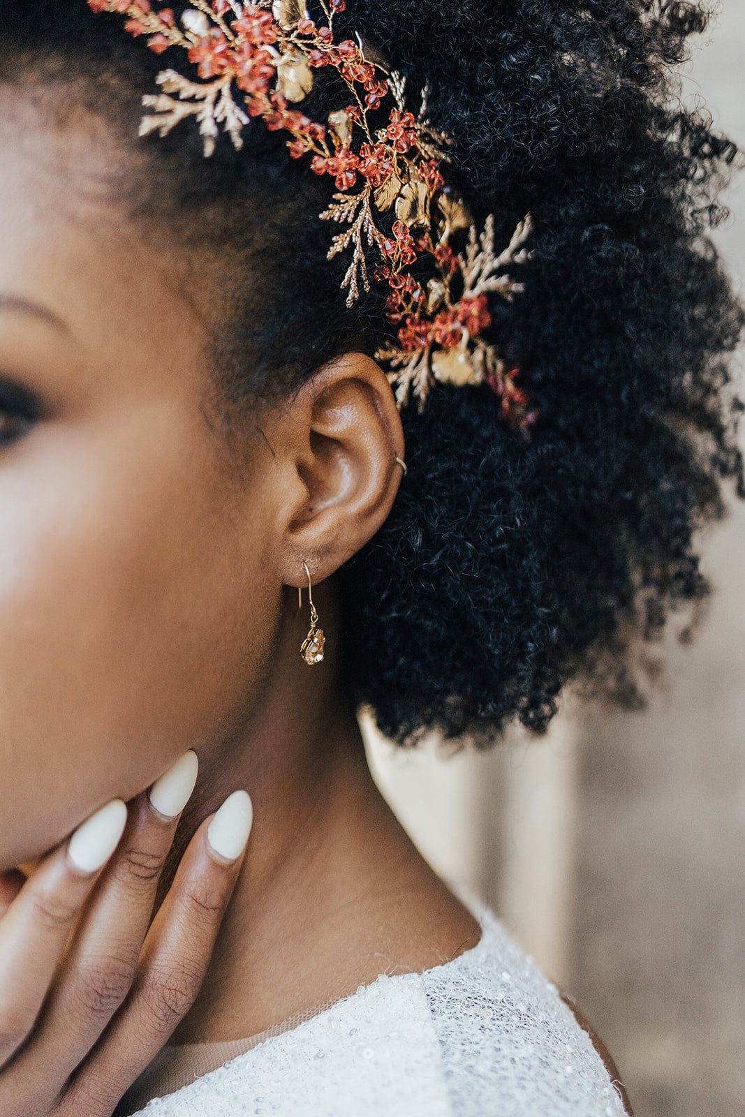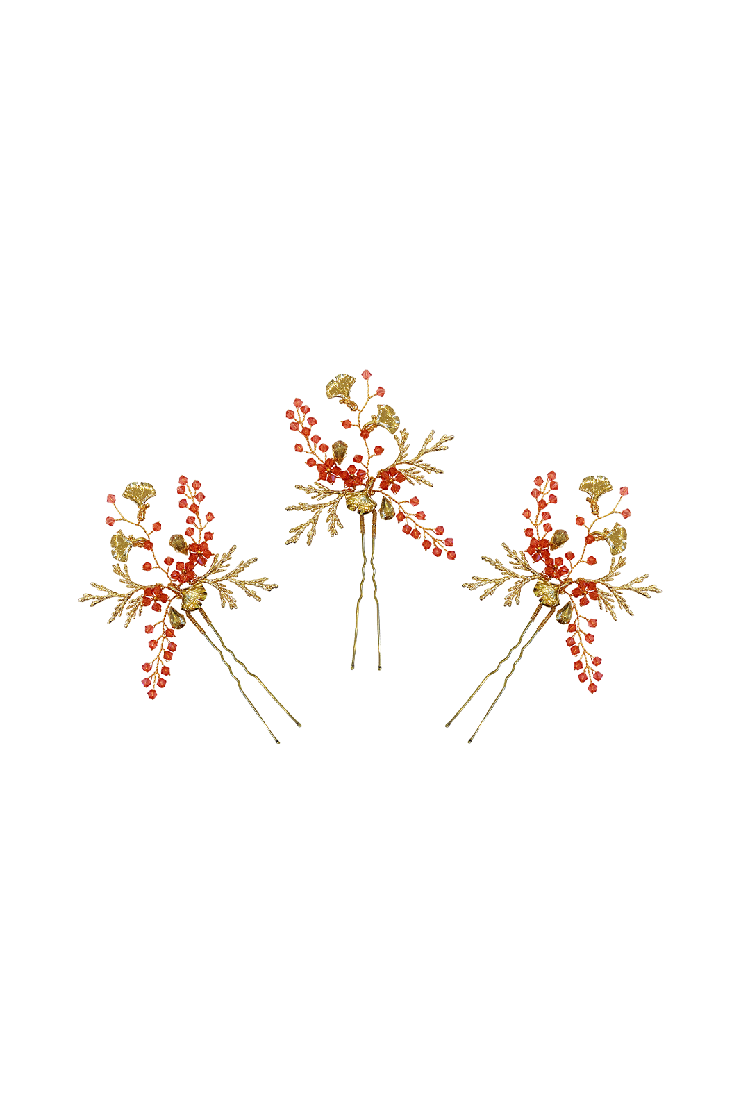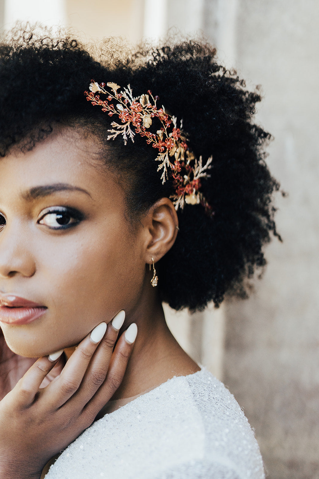 Coral and Champagne tonal Swarovski crystals are the showcase amongst the luxurious golden blossoms and leaves of this versatile hair accessory.