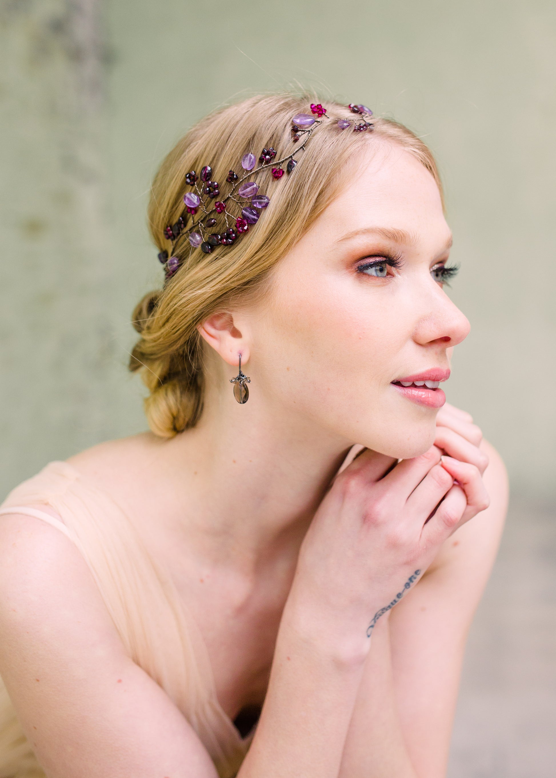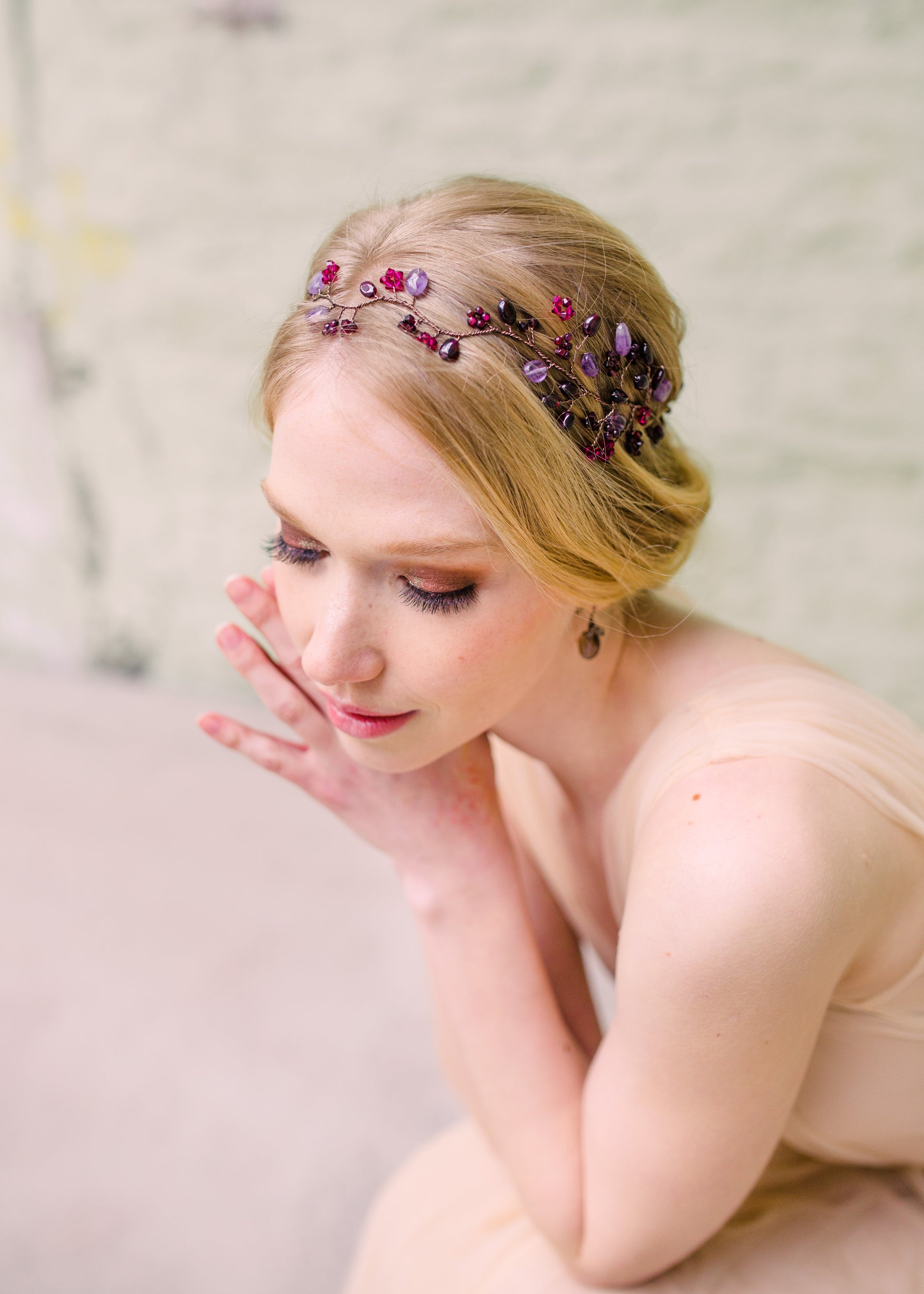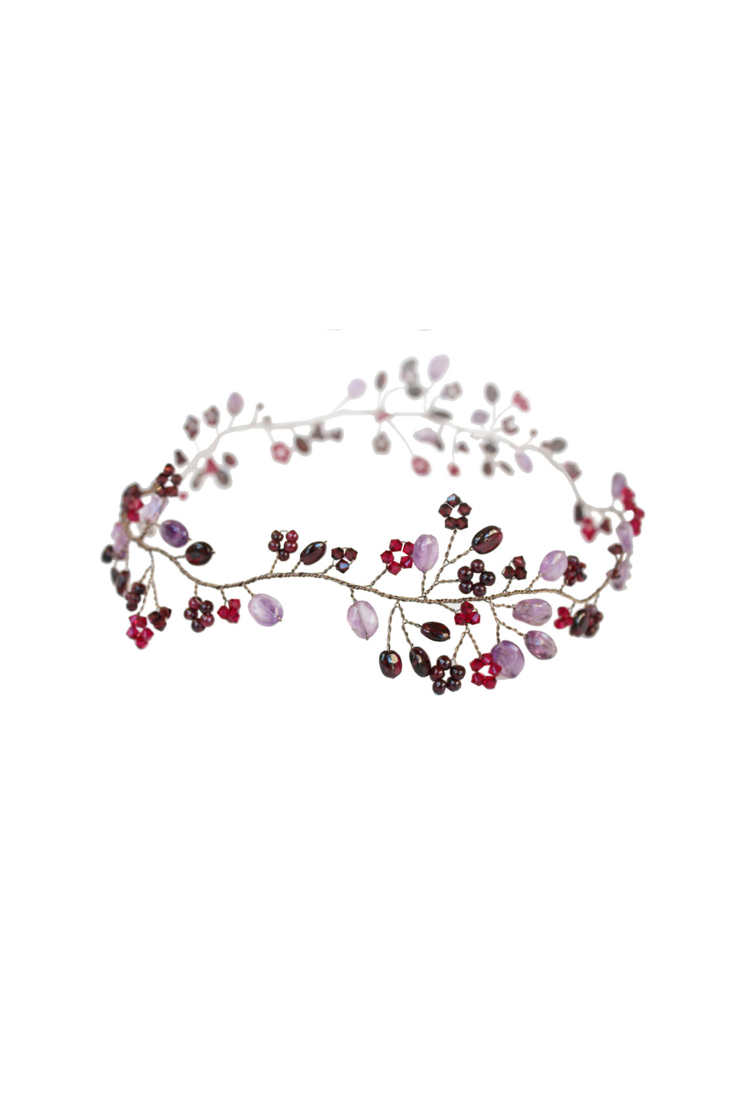 Tonal purple blossom inspired garland embellished with Swarovski crystals and semi precious gemstones of garnet and amethyst stones. Organic and light, this versatile piece is easy to wear with a variety of hairstyles.