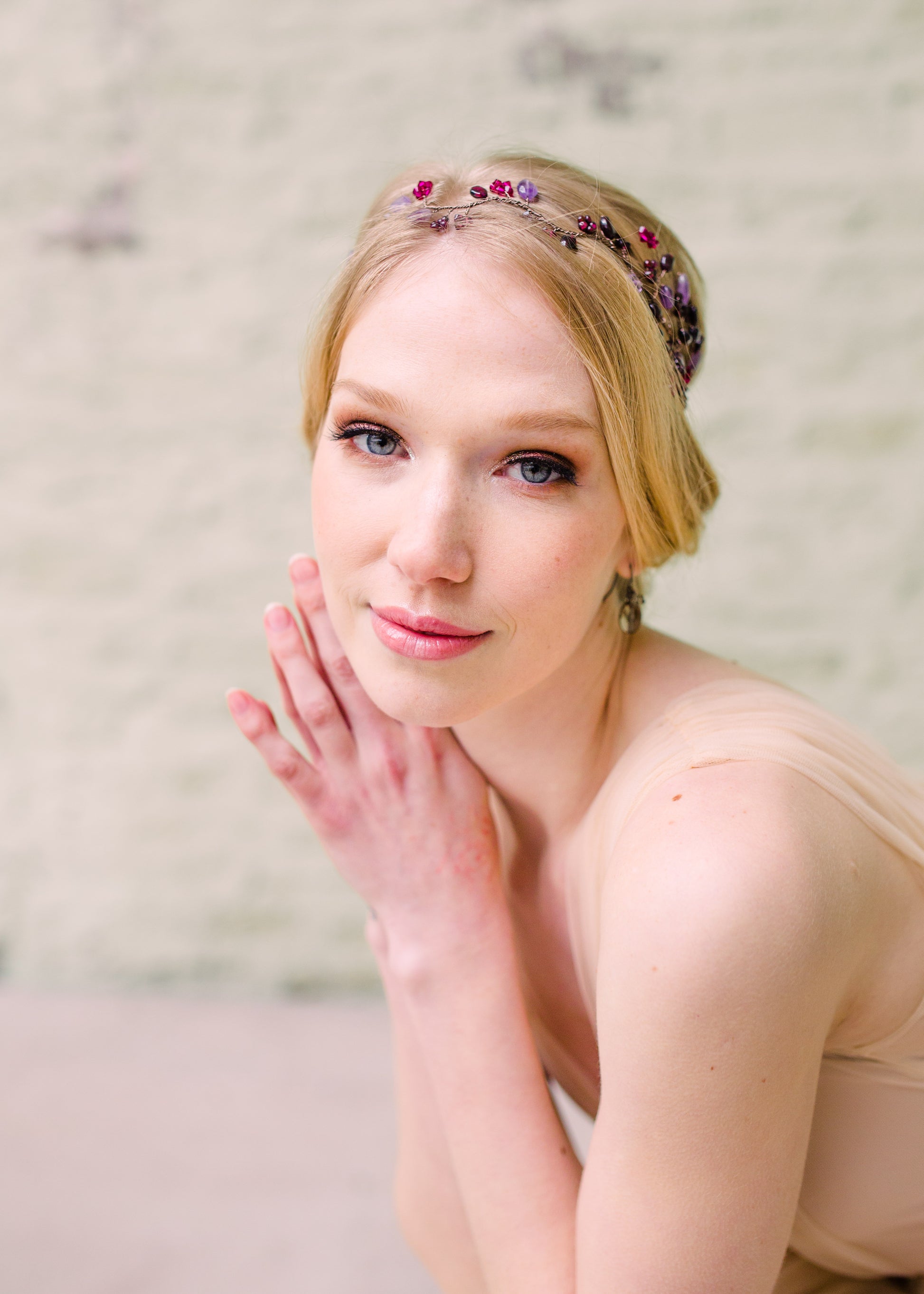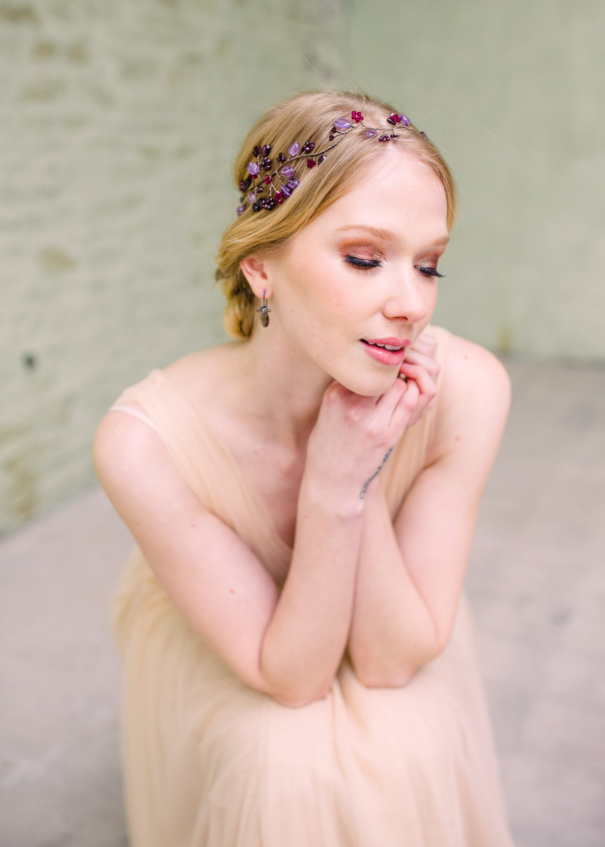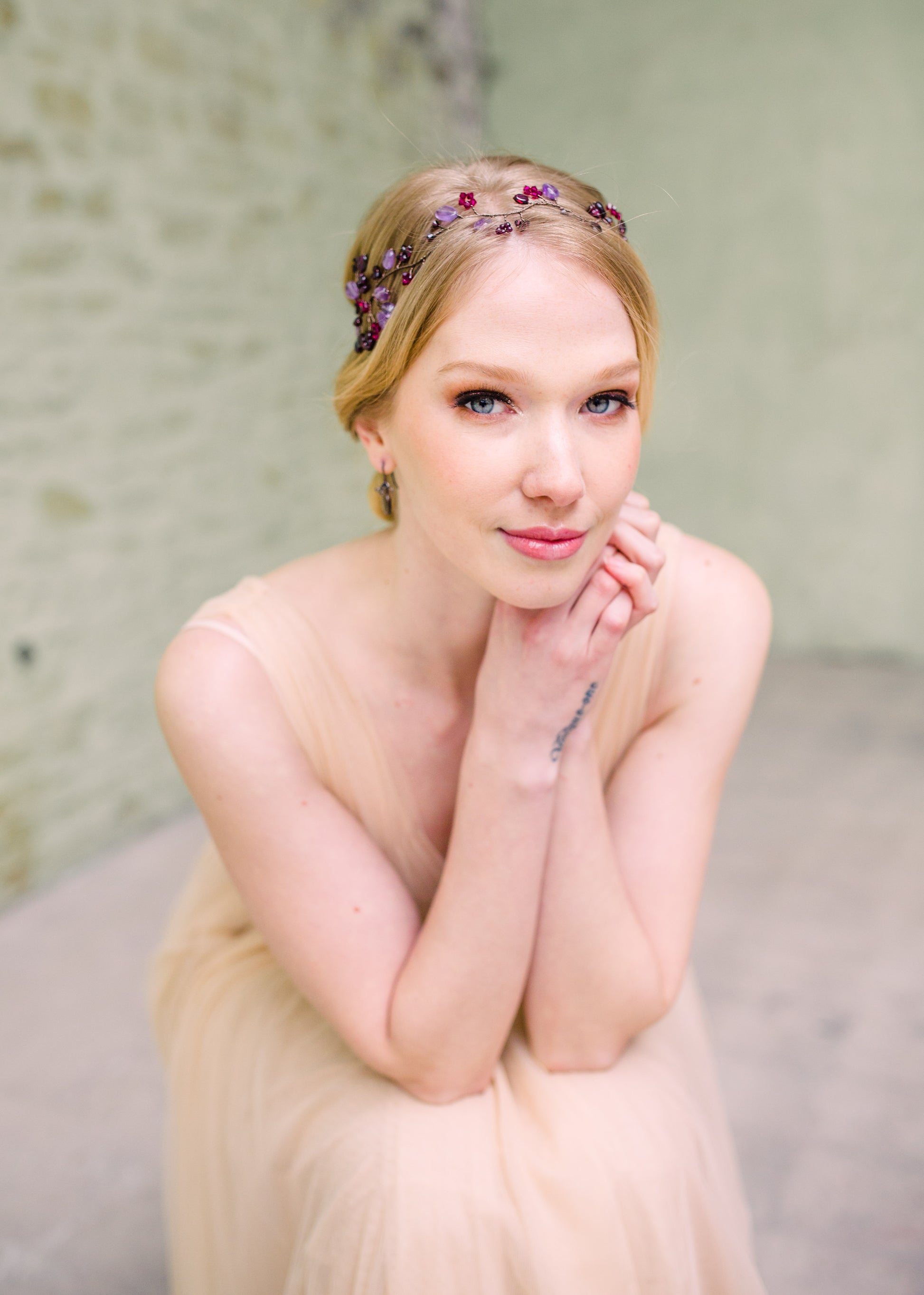 Tonal purple blossom inspired garland embellished with Swarovski crystals and semi precious gemstones of garnet and amethyst stones. Organic and light, this versatile piece is easy to wear with a variety of hairstyles.