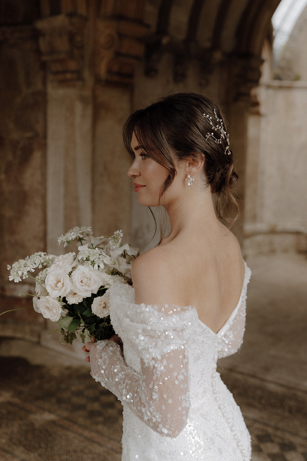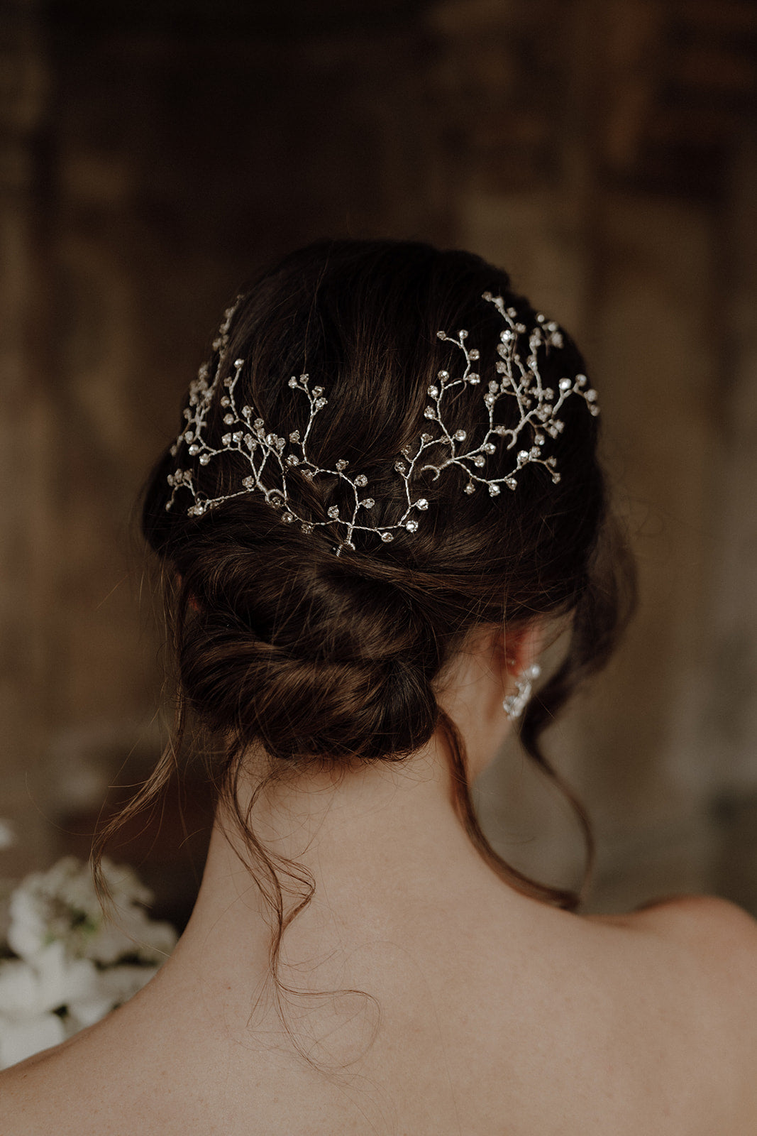 Delicate tendrils of sparkling set Swarovski crystals giving the effect of dewdrops in the hair. Perfect for arranging on the side, above the veil or dotted to each side of the hair.
