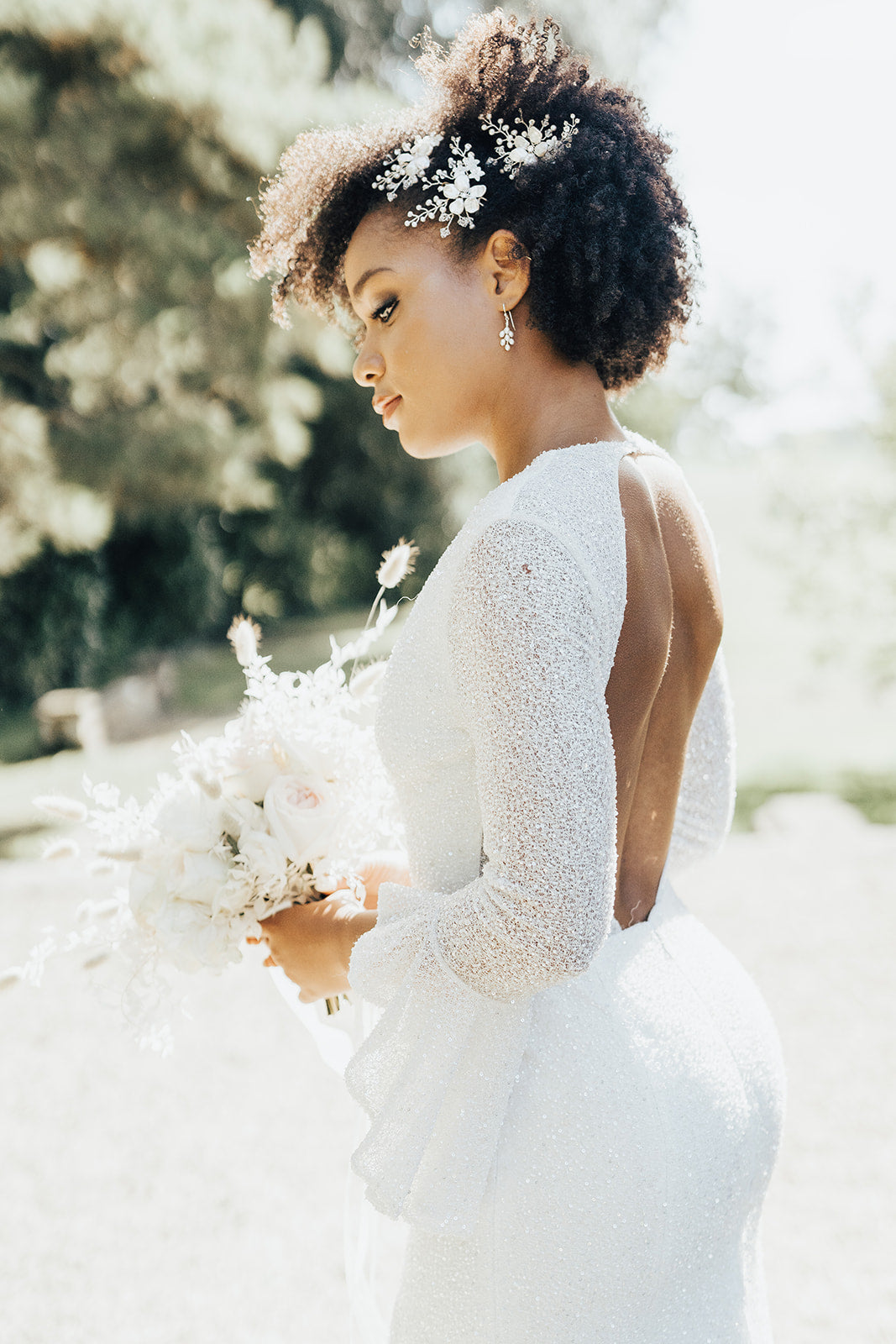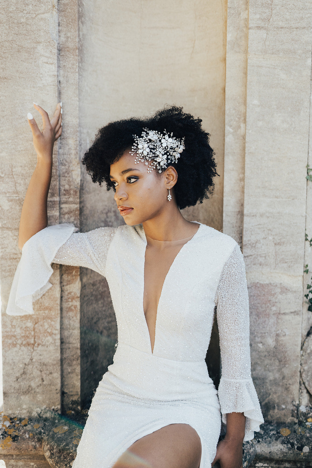 Pearl blooms with Swarovski crystal accents surrounded by freshwater pearl clusters on delicate vines. Cluster together above a veil or wear to the side.