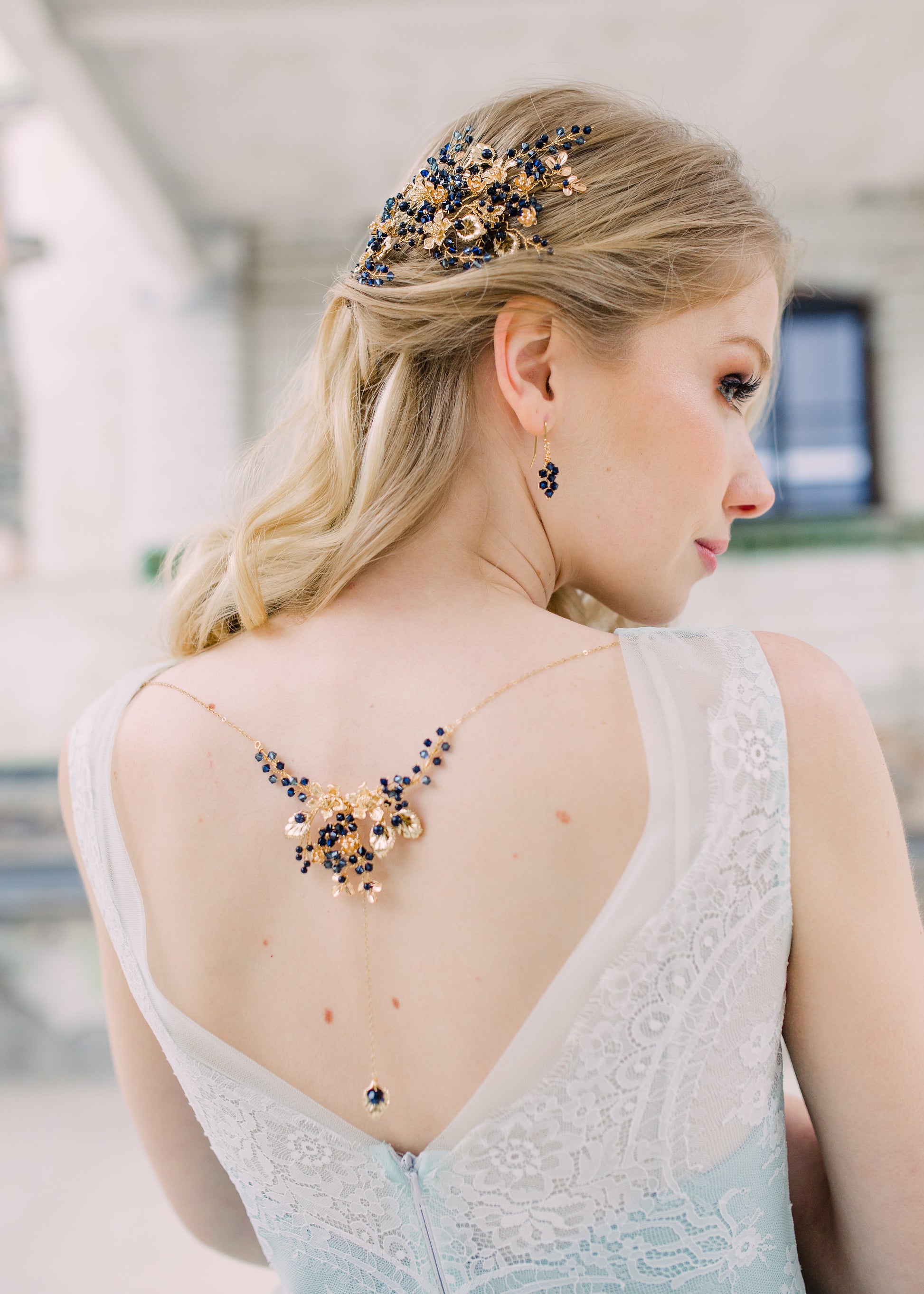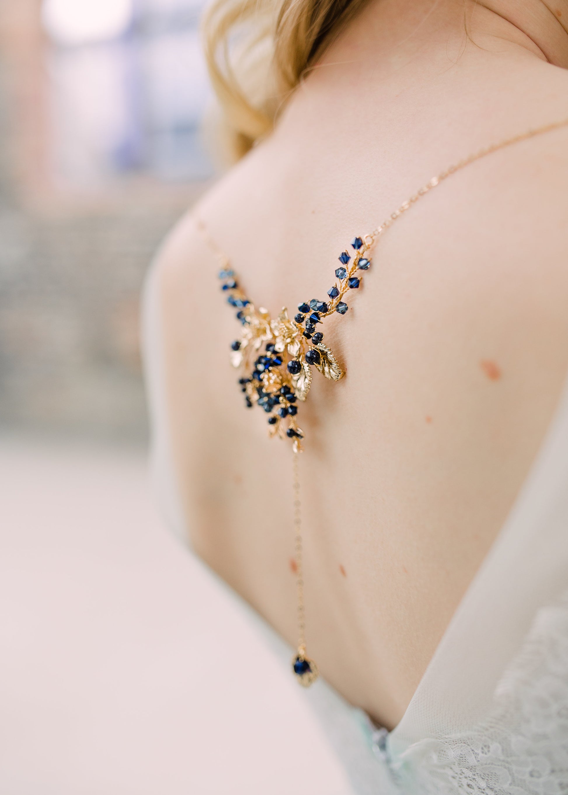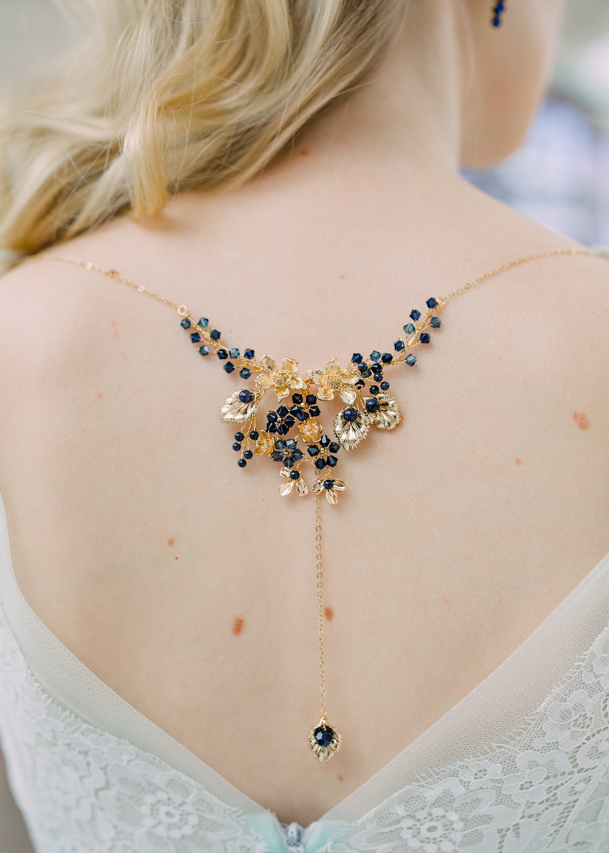 Showcase a backless dress or open back design with this stunning back necklace. Suspended from thin golden chains to attach to the shoulders of any garment, the deep midnight blue Swarovski crystals are the centred showcase amongst luxurious golden blossoms and leaves and a single chain droplet feature giving extra charm.