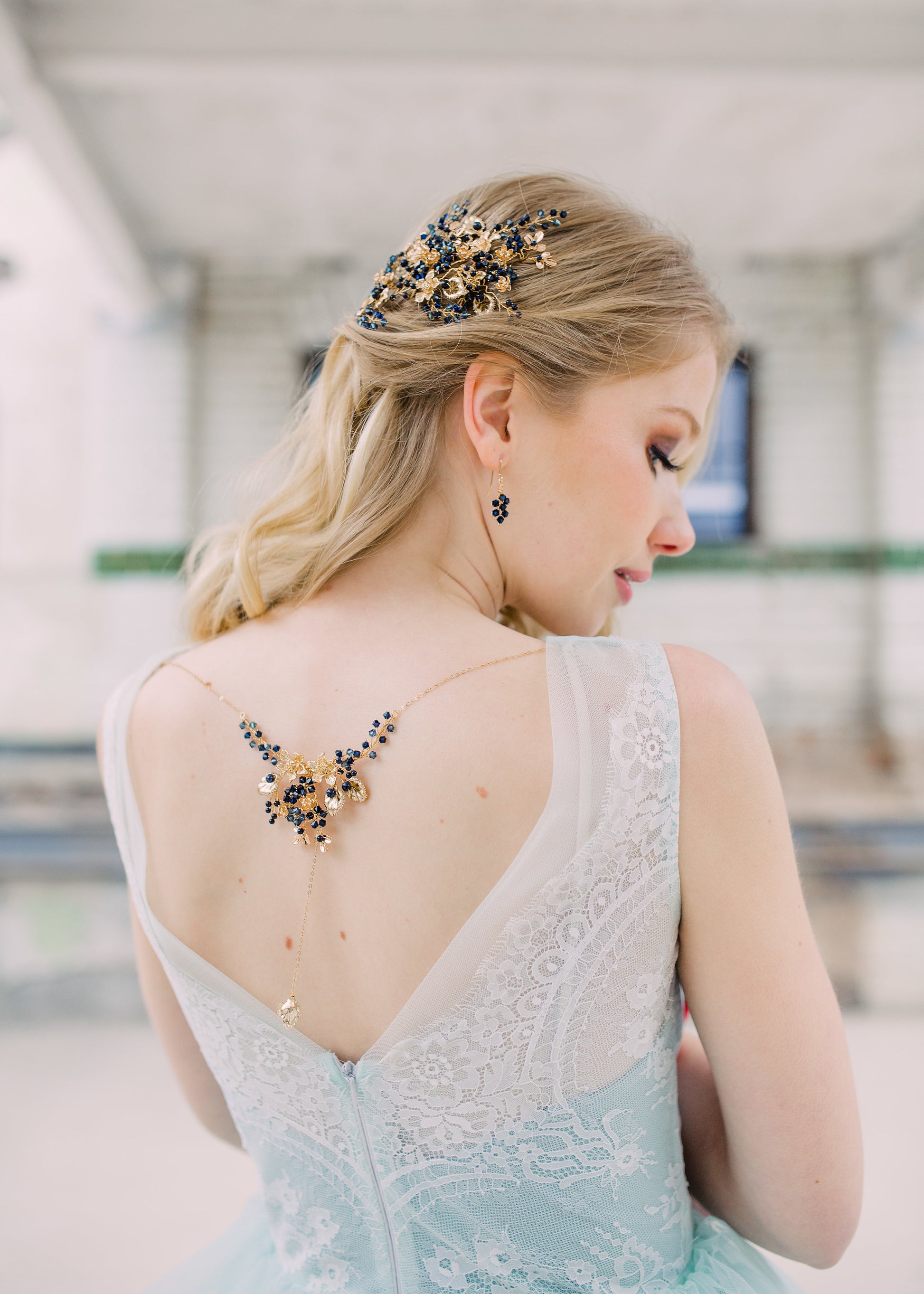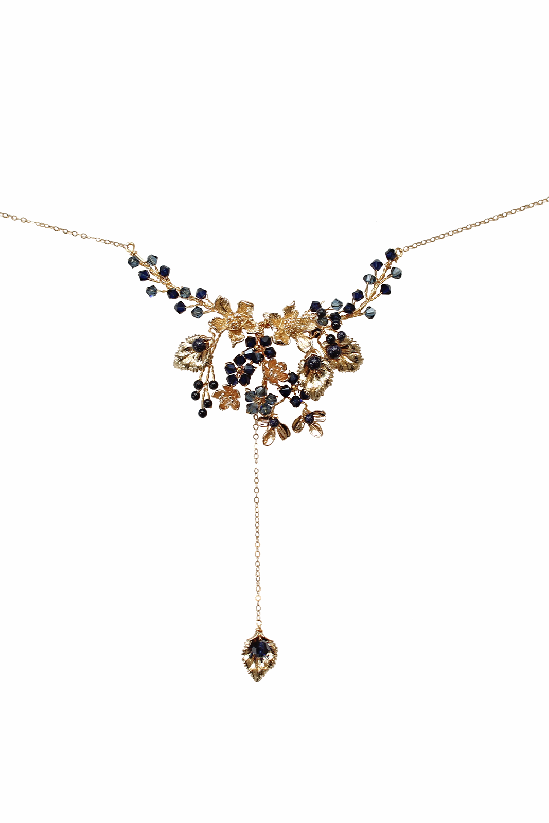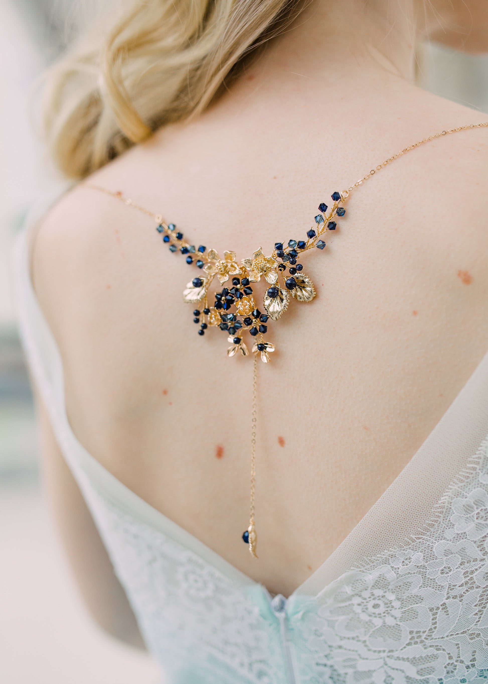 Showcase a backless dress or open back design with this stunning back necklace. Suspended from thin golden chains to attach to the shoulders of any garment, the deep midnight blue Swarovski crystals are the centred showcase amongst luxurious golden blossoms and leaves and a single chain droplet feature giving extra charm.
