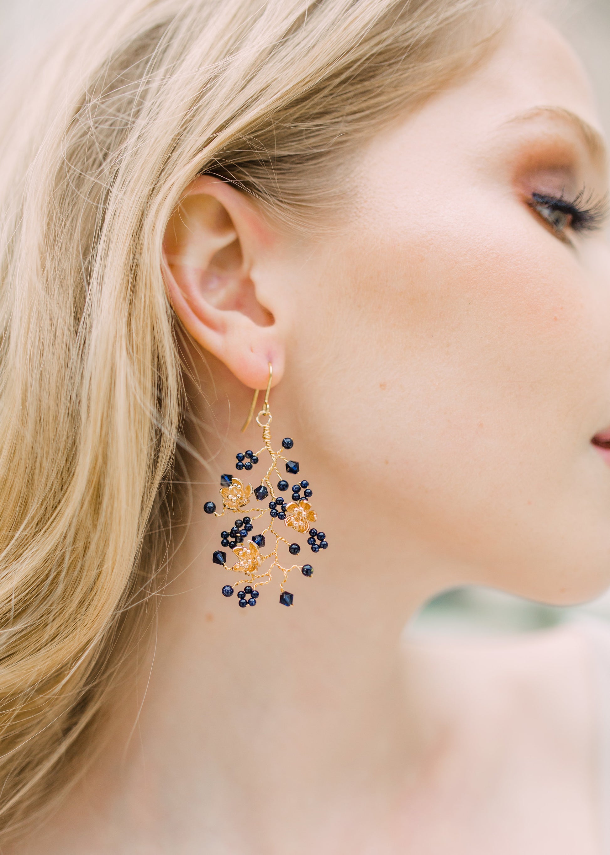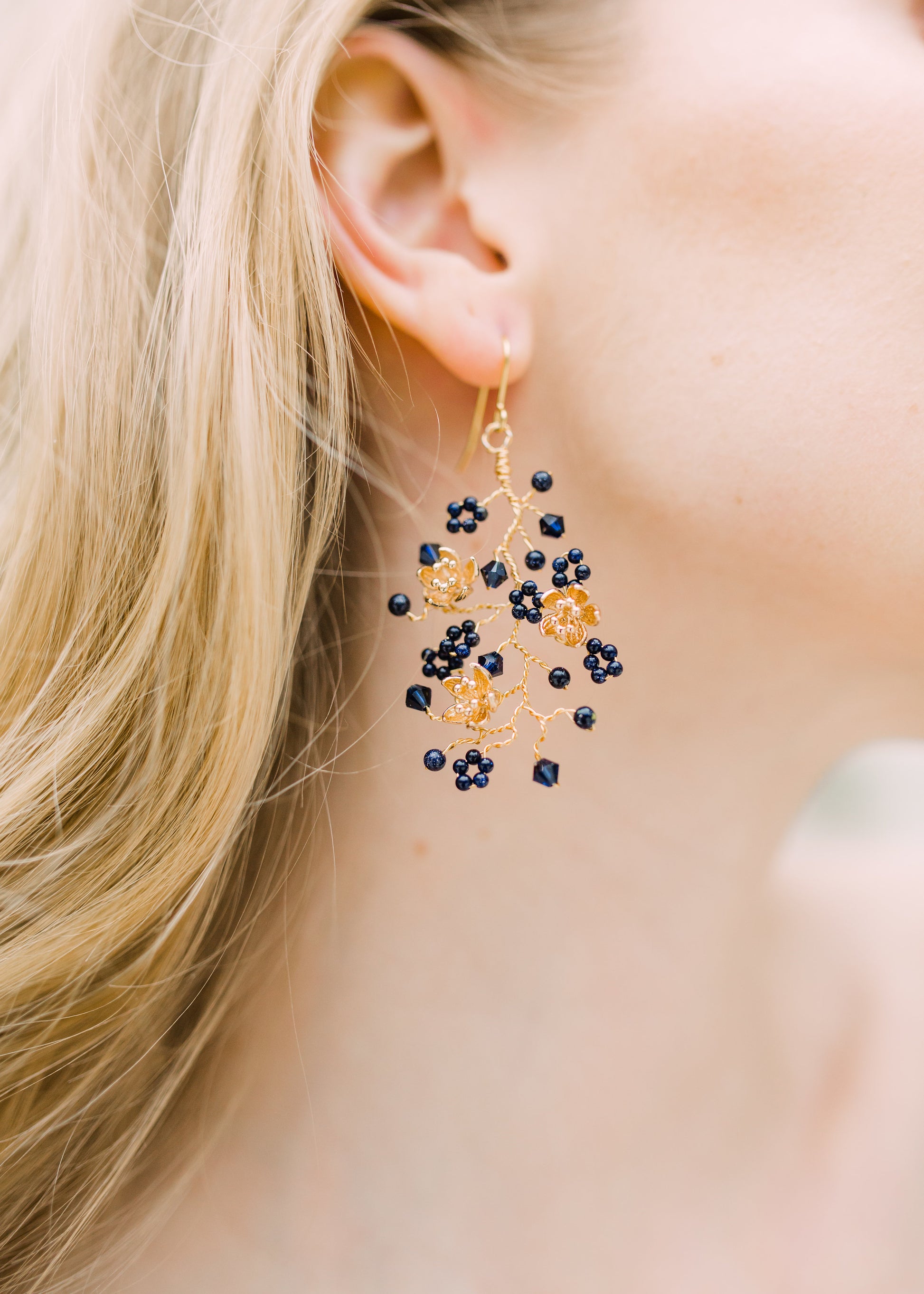 A gorgeous clustered chandelier of golden blossoms and rich navy blue Swarovski crystals and beads on a slim hook.