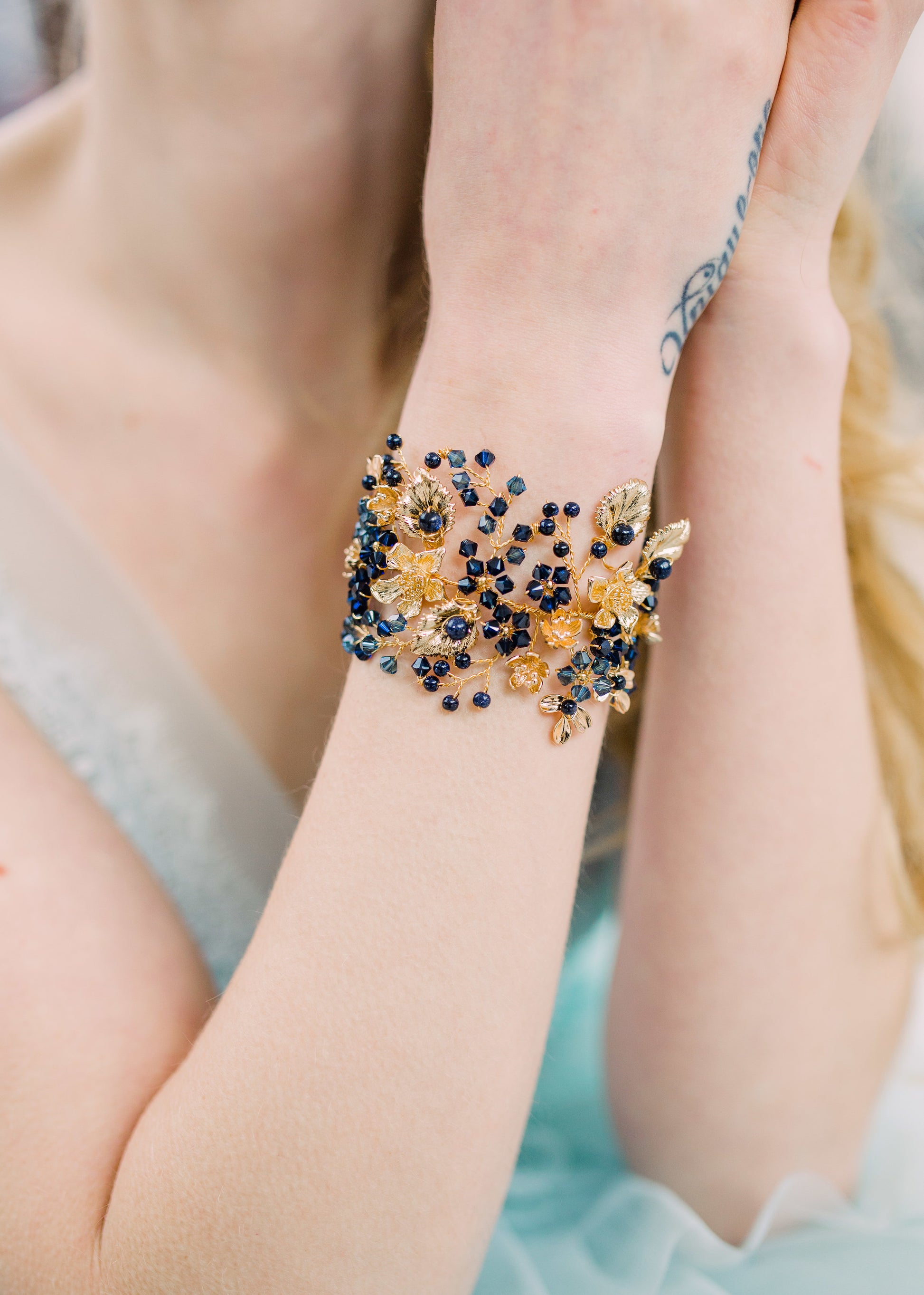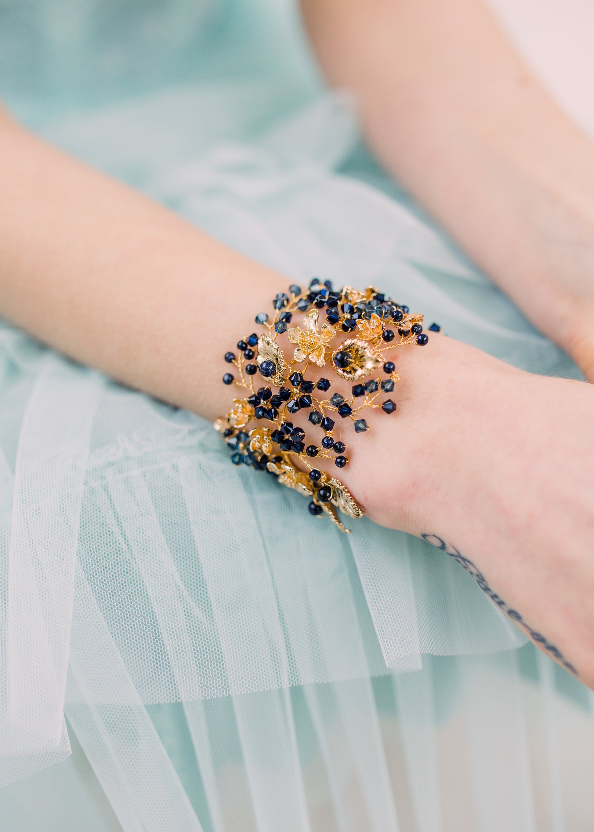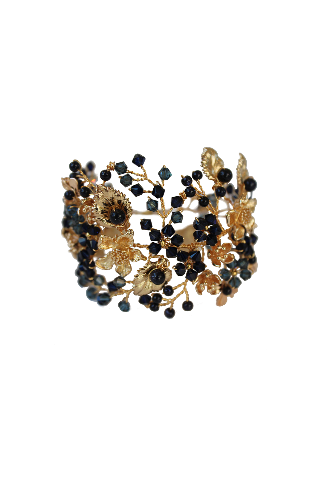 Deep midnight blue Swarovski crystals are the showcase amongst the luxurious golden blossoms and leaves of this stunning wrist adornment.