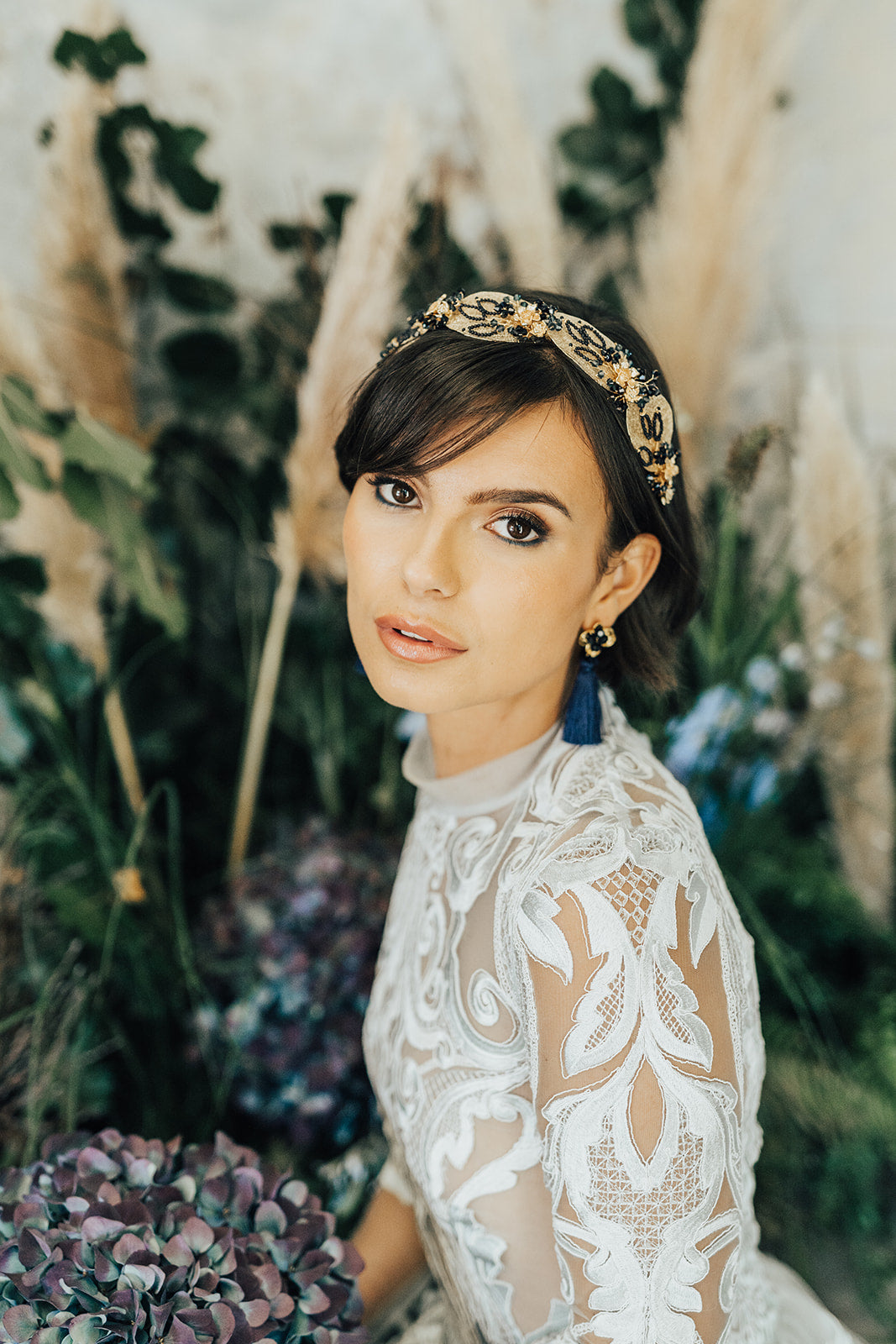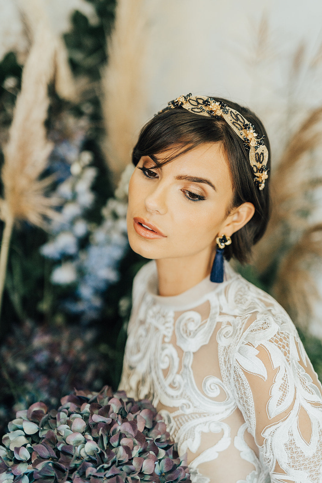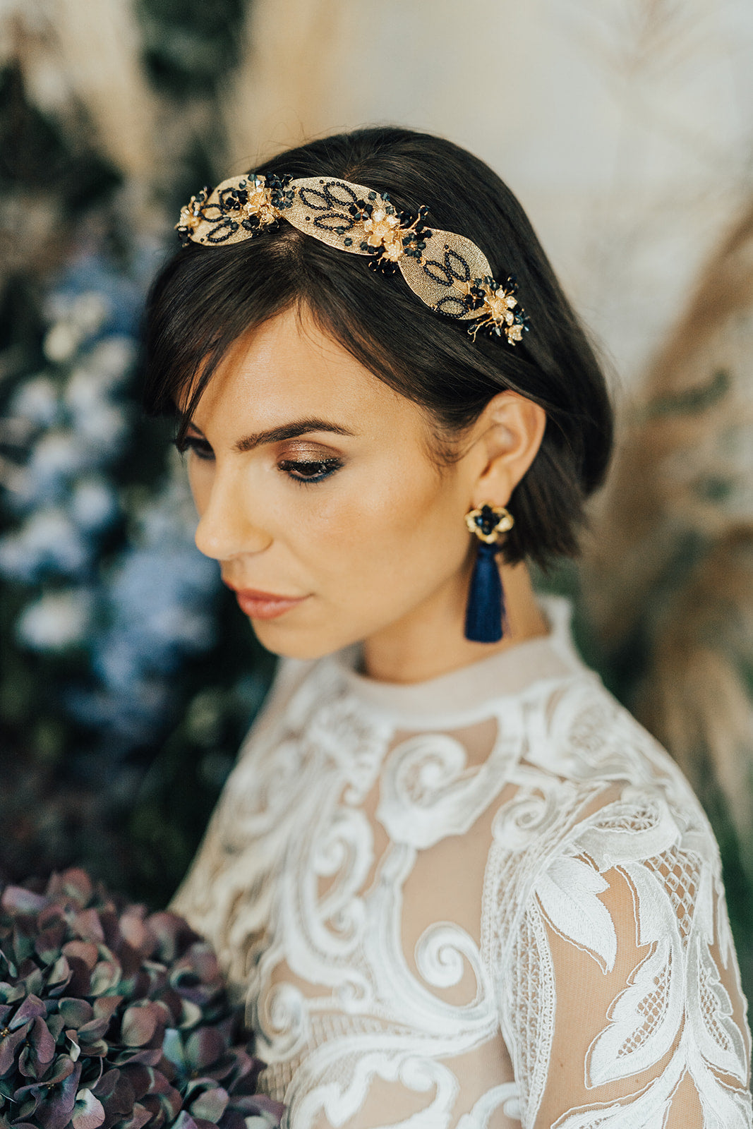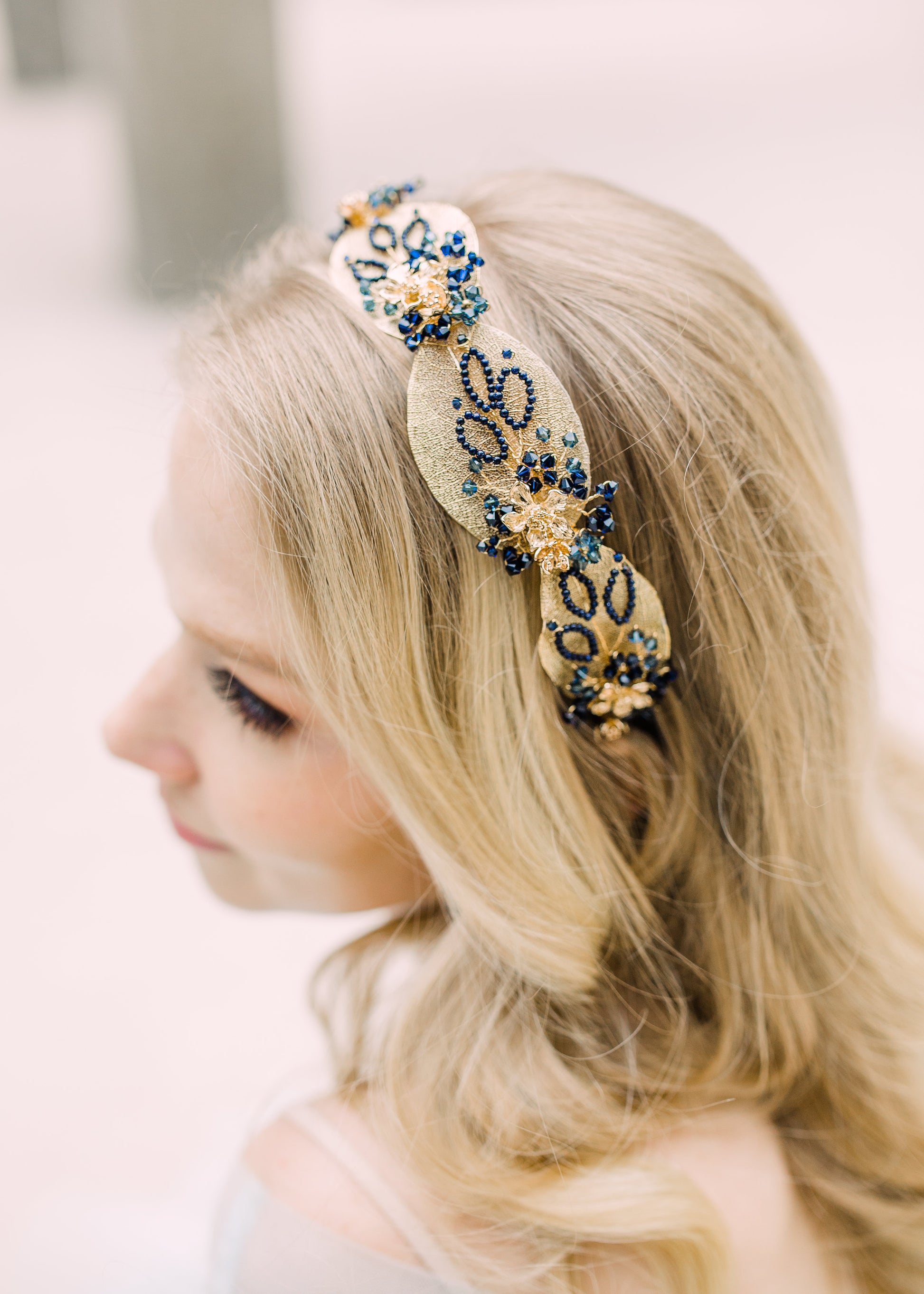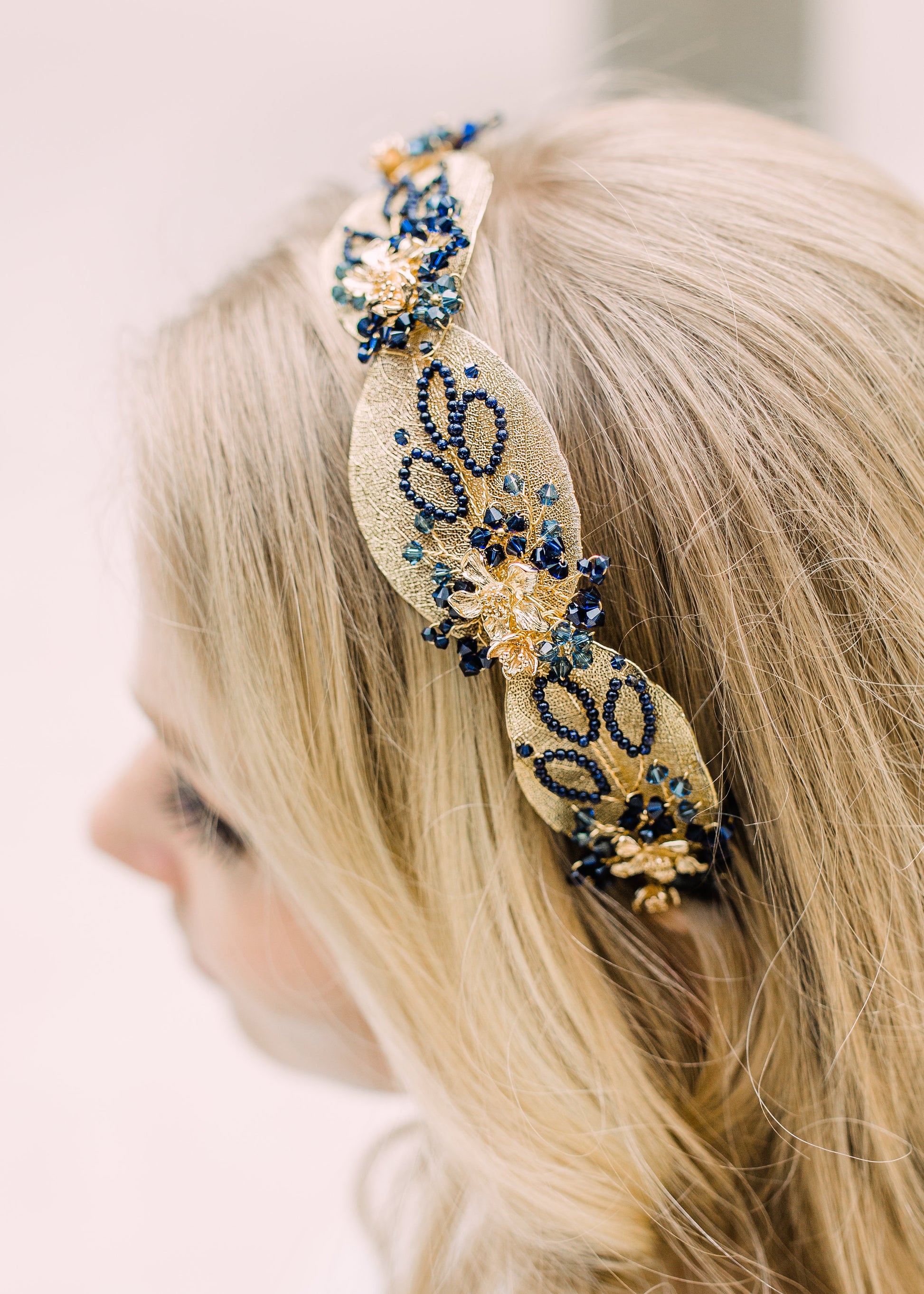 A stunning crown of golden leaves embellished with blossoms and vines of tonal blue Swarovski crystals and gemstones; the ultimate luxe headdress.