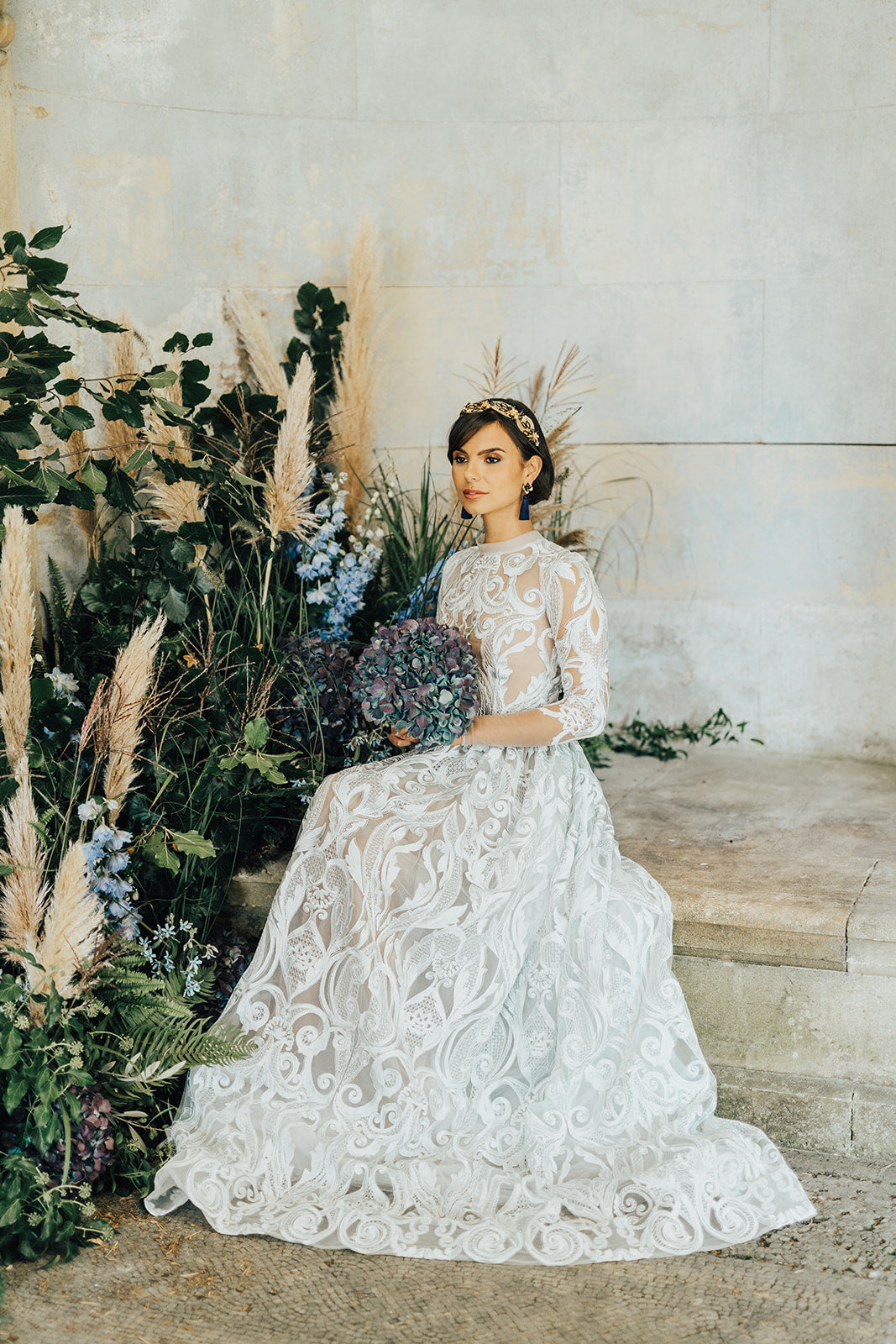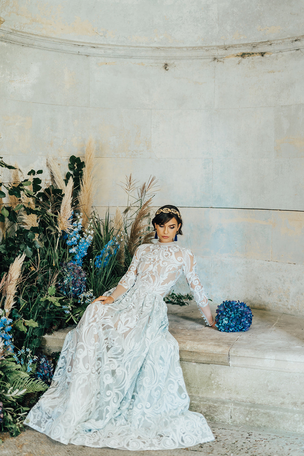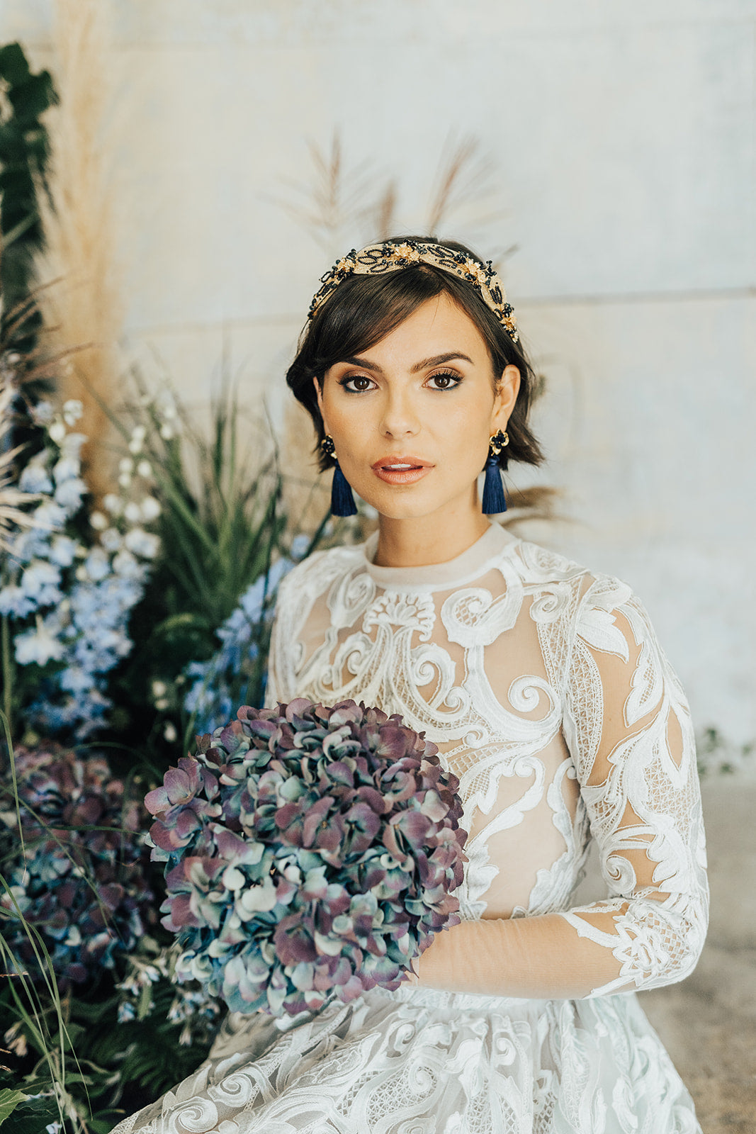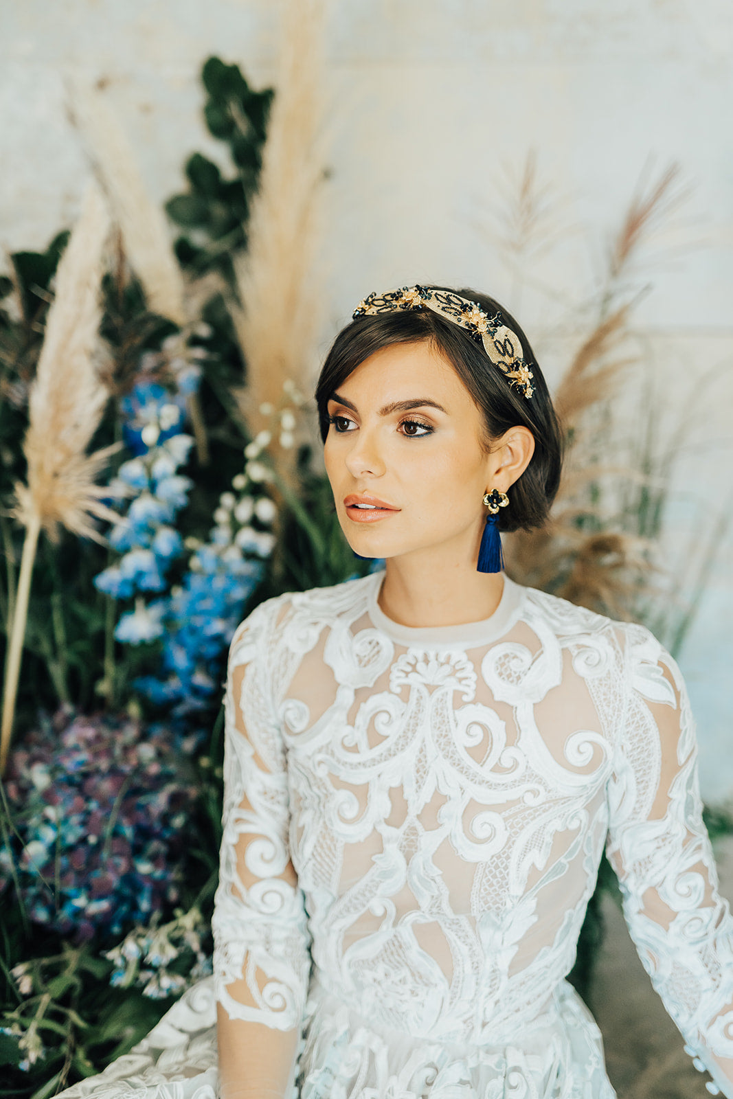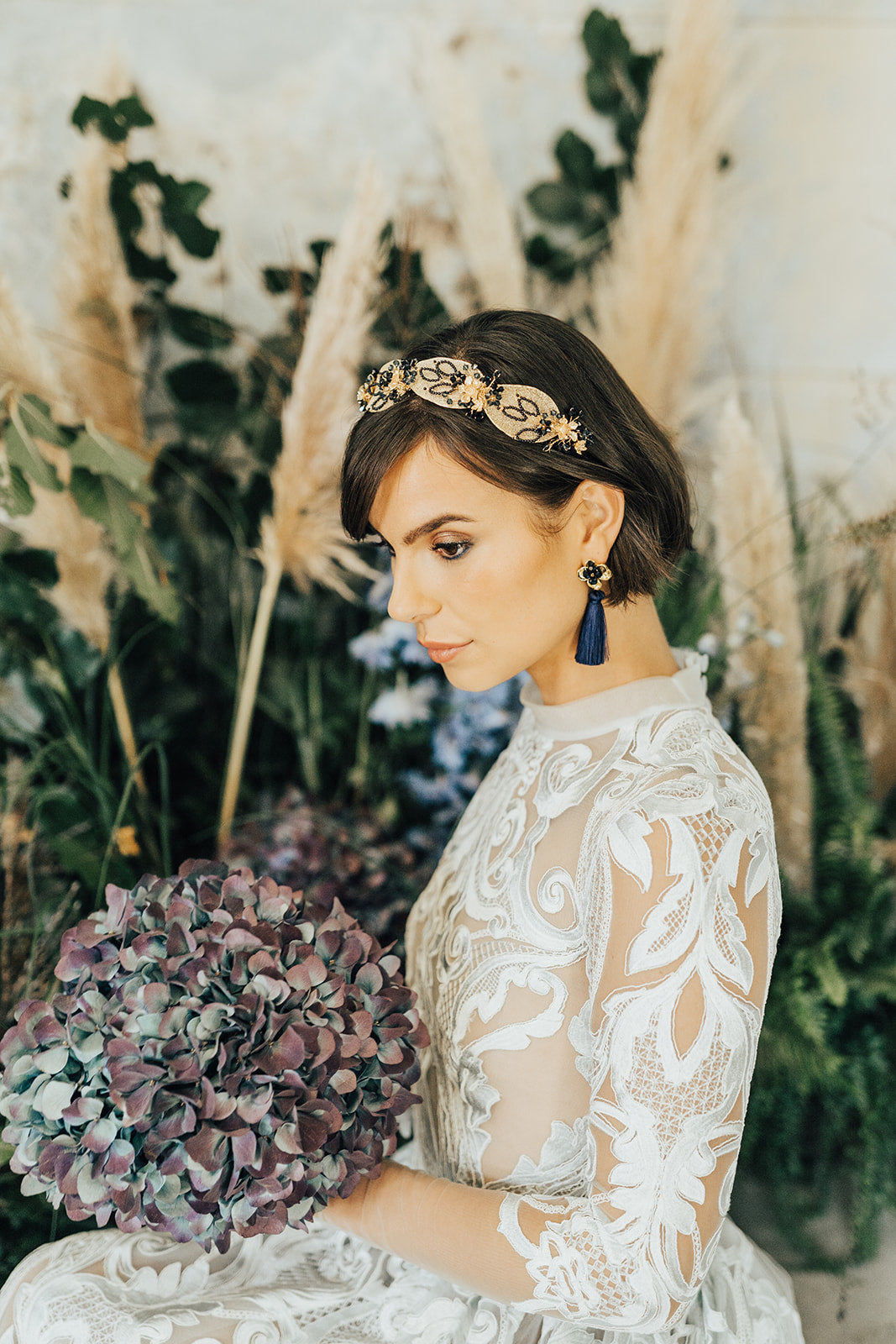 A stunning crown of golden leaves embellished with blossoms and vines of tonal blue Swarovski crystals and gemstones; the ultimate luxe headdress.