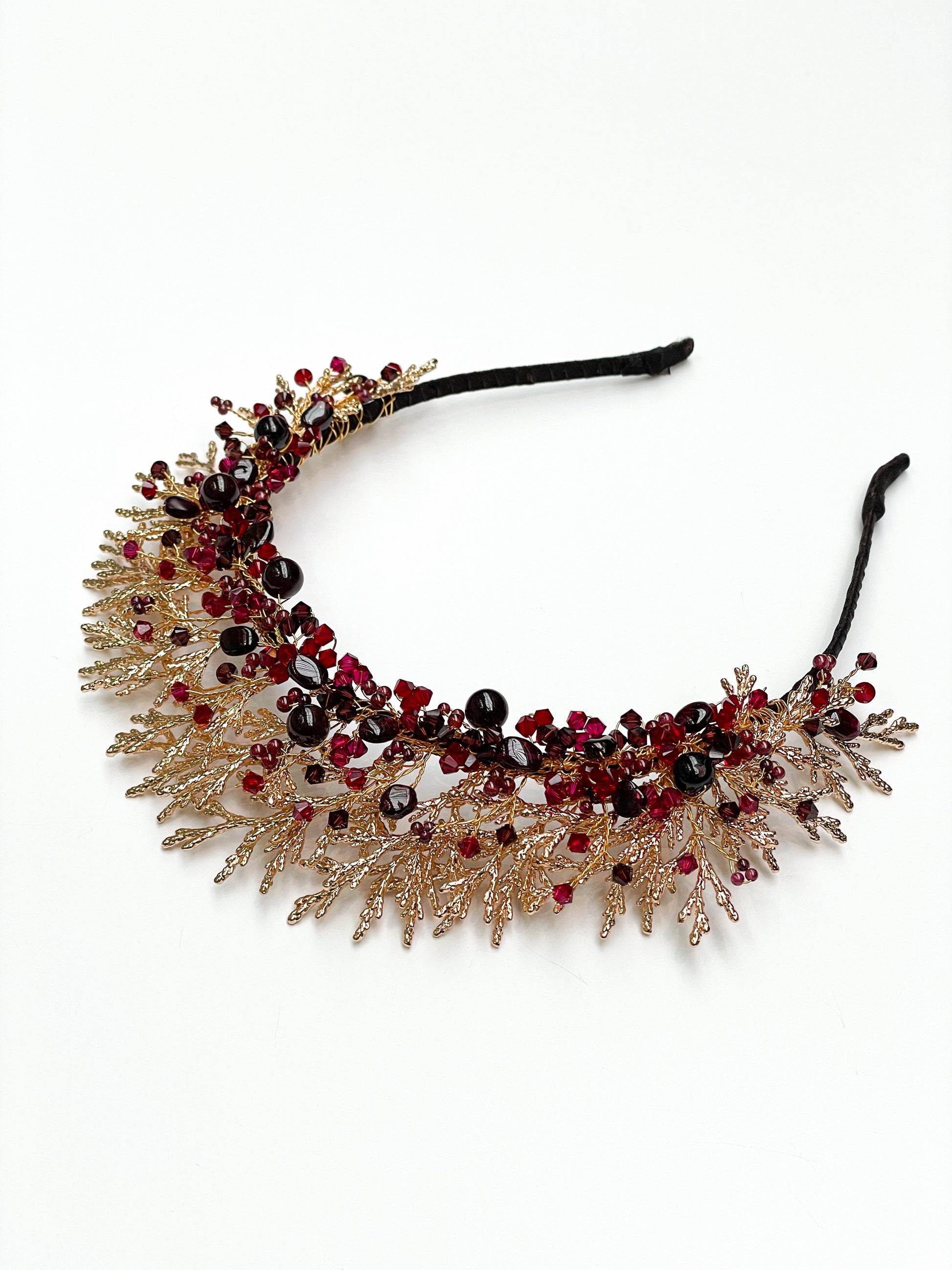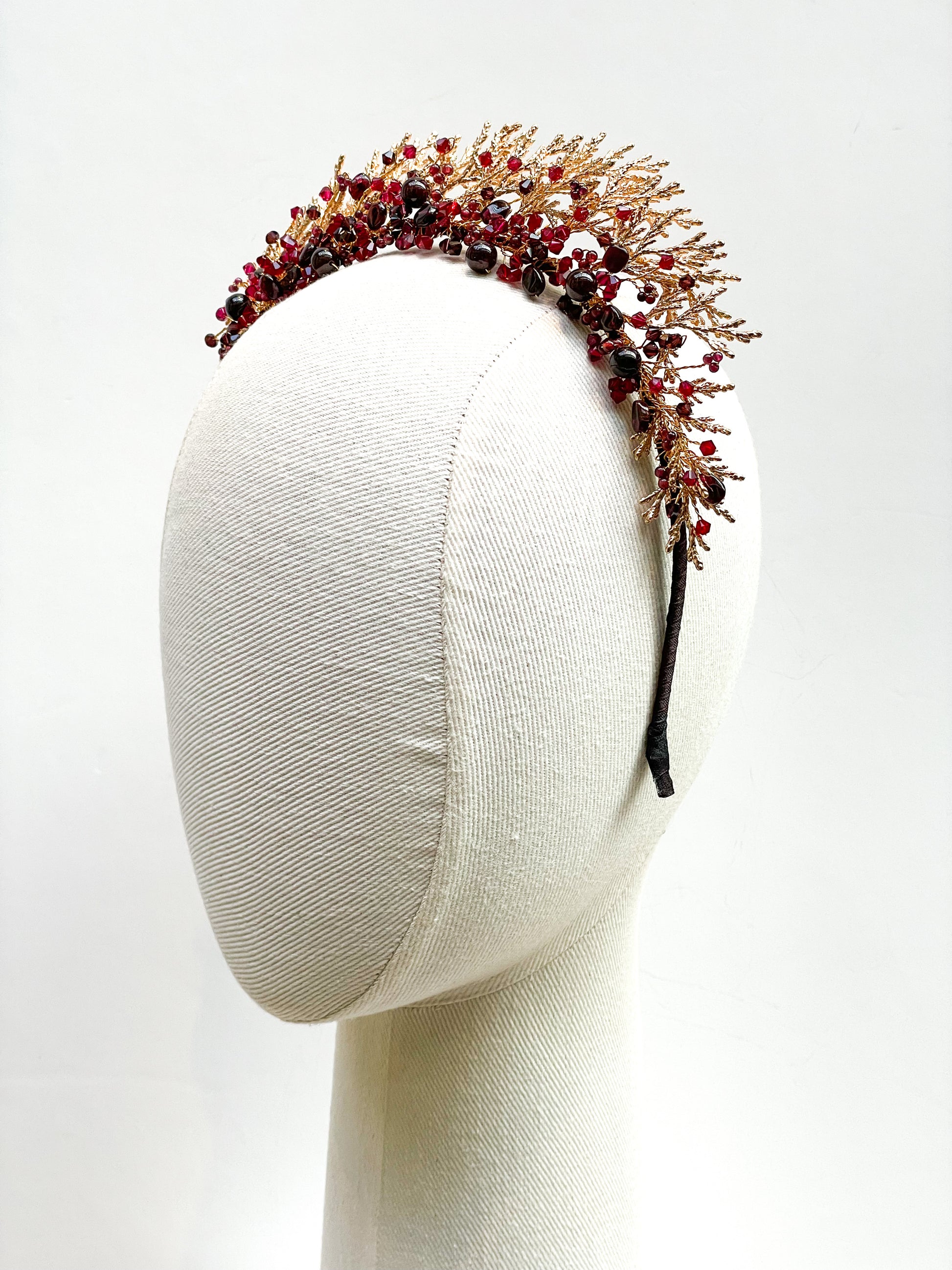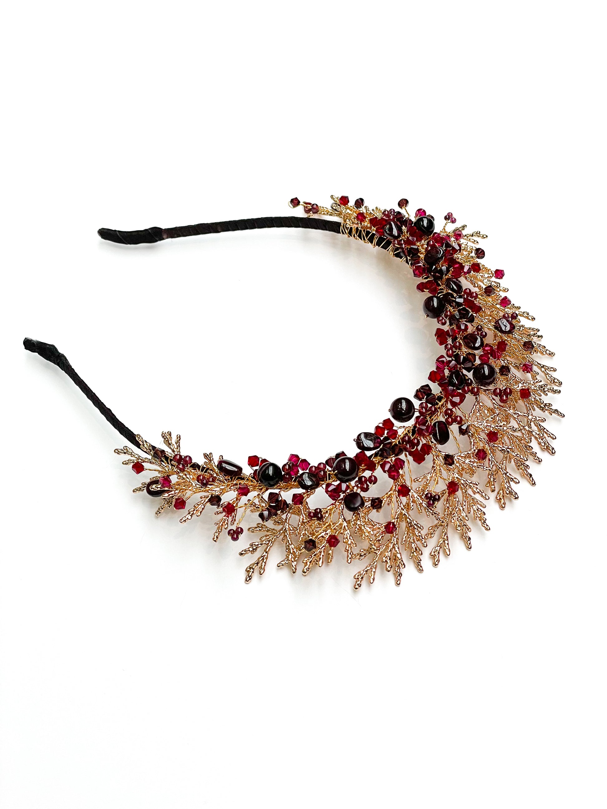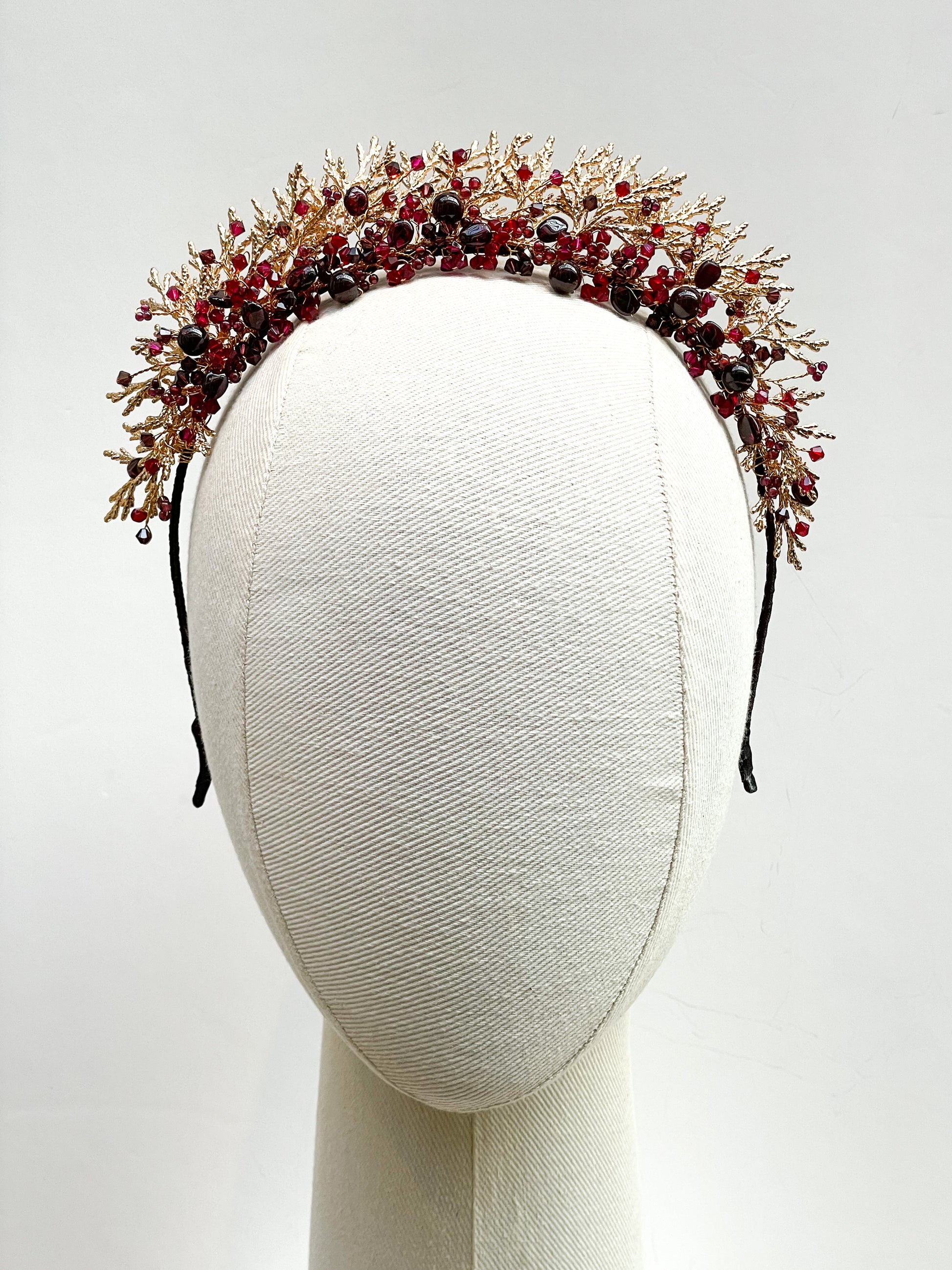 Luxurious clusters of garnet gemstones, deep red and burgundy Swarovski crystals front a halo of golden sprigs creating the statement Mulberry Halo headdress. Mounted onto a discreet ribbon covered band for comfortable wear.