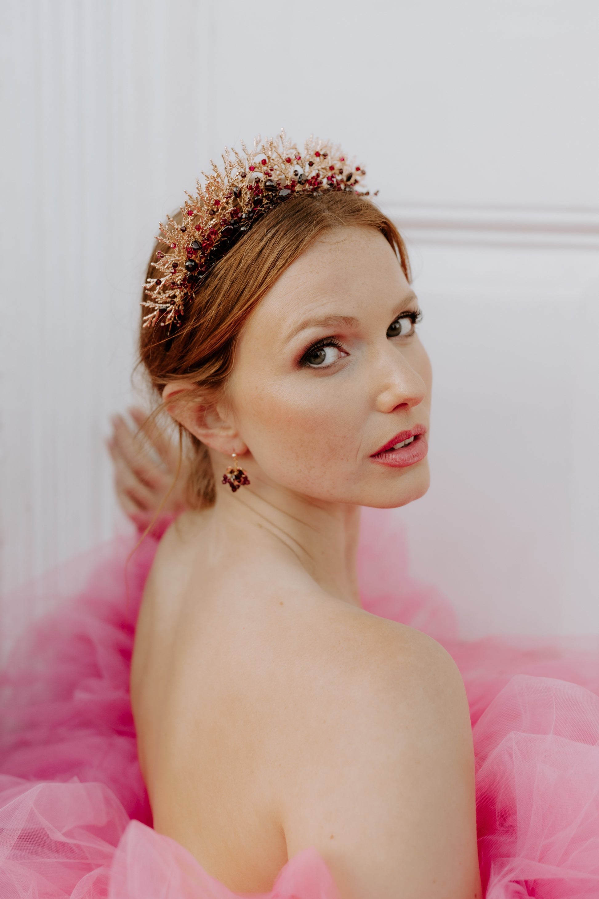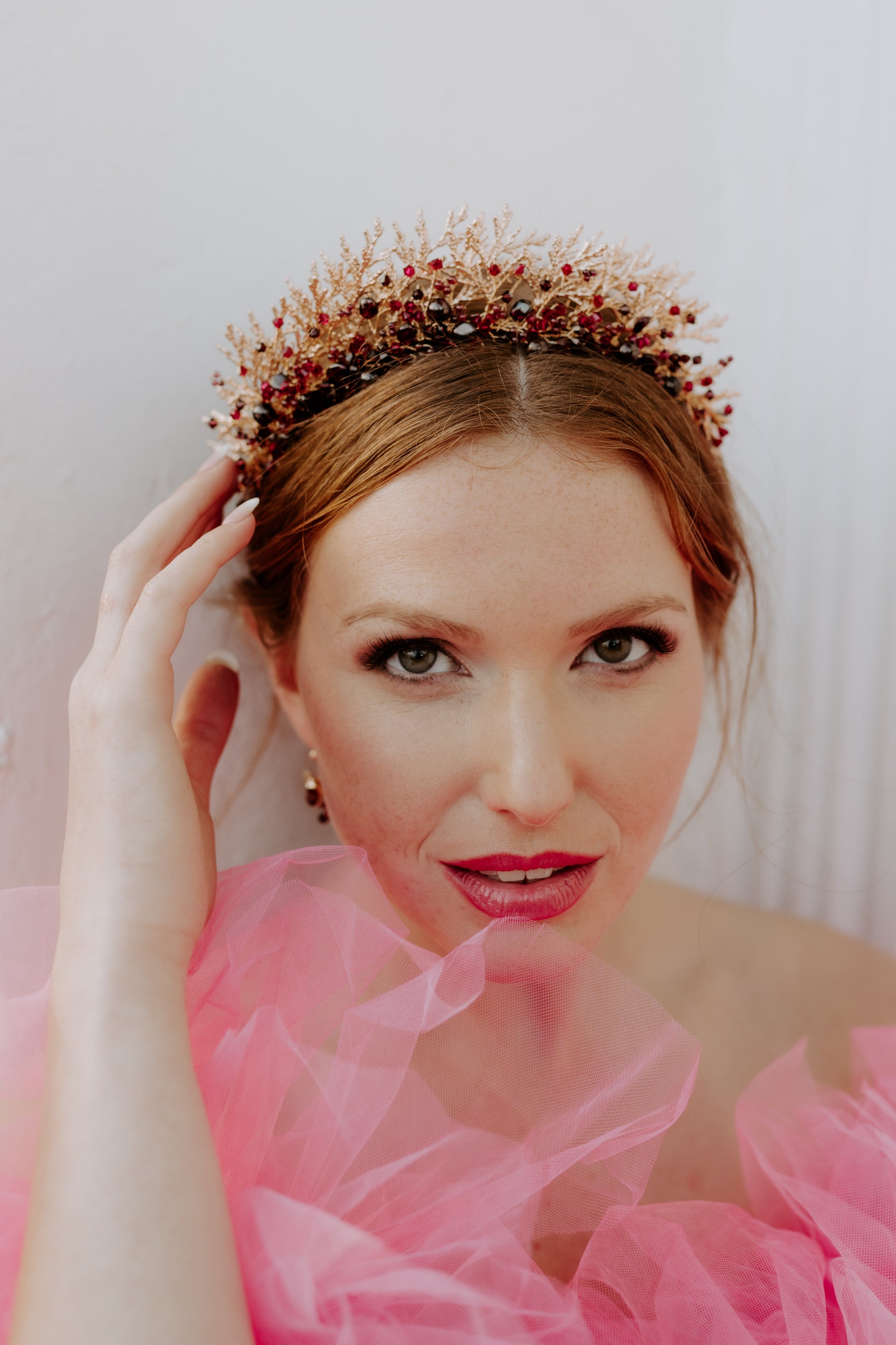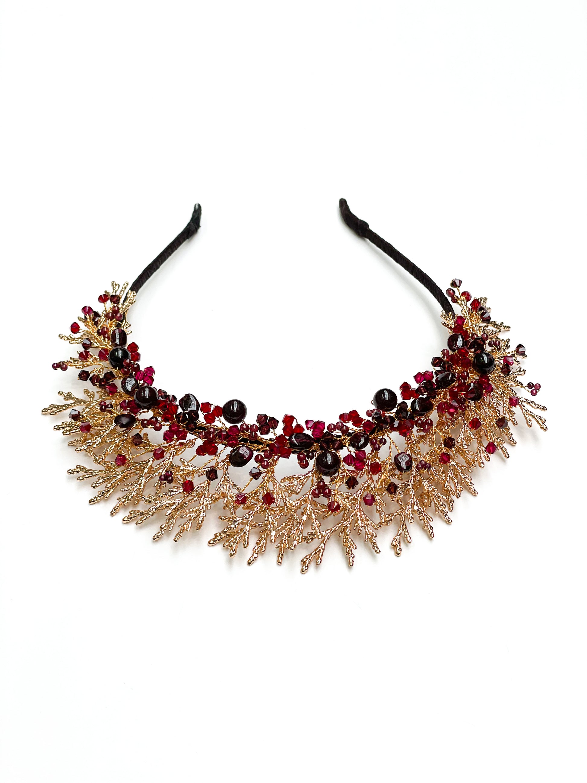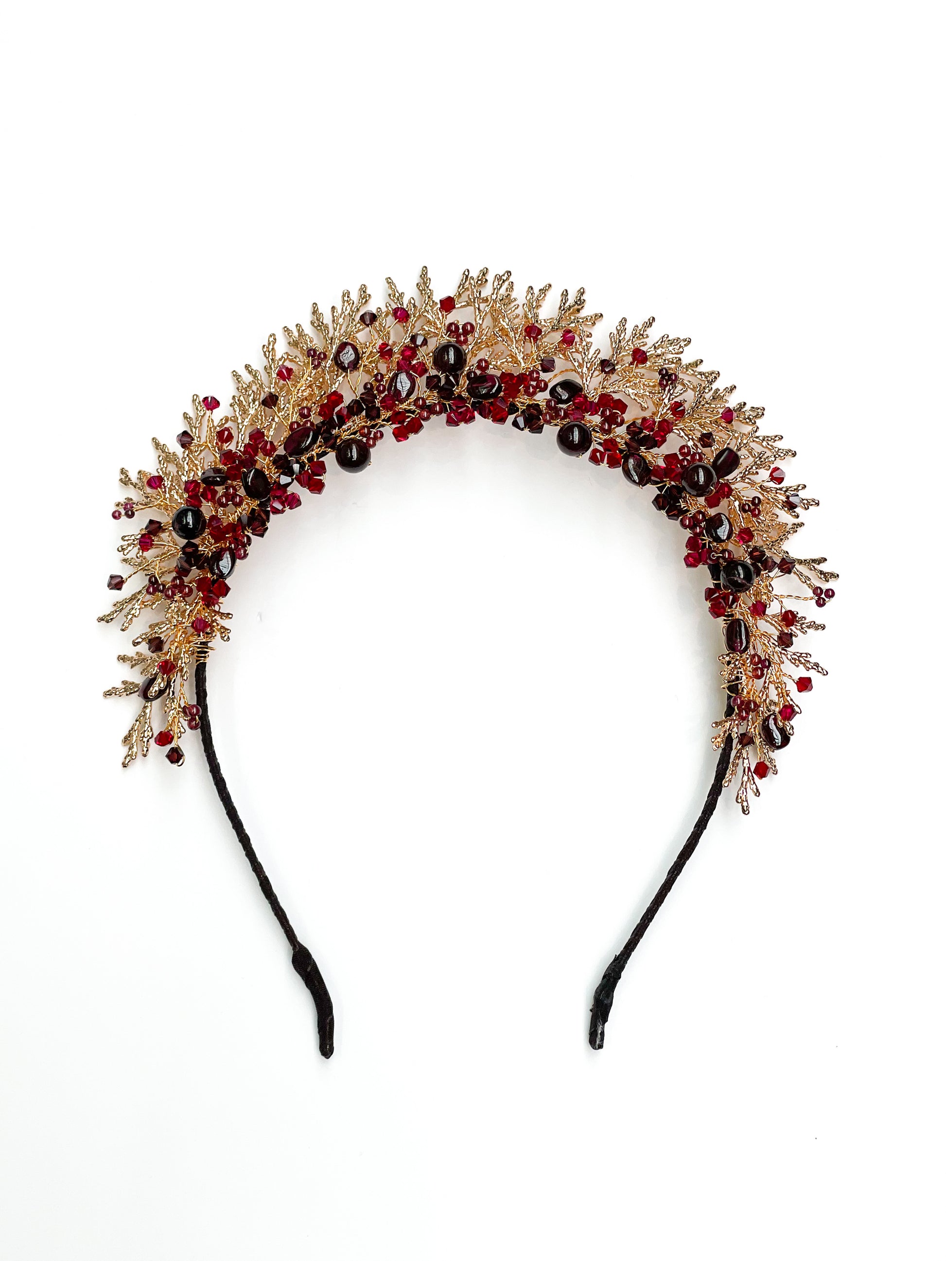 Luxurious clusters of garnet gemstones, deep red and burgundy Swarovski crystals front a halo of golden sprigs creating the statement Mulberry Halo headdress. Mounted onto a discreet ribbon covered band for comfortable wear.