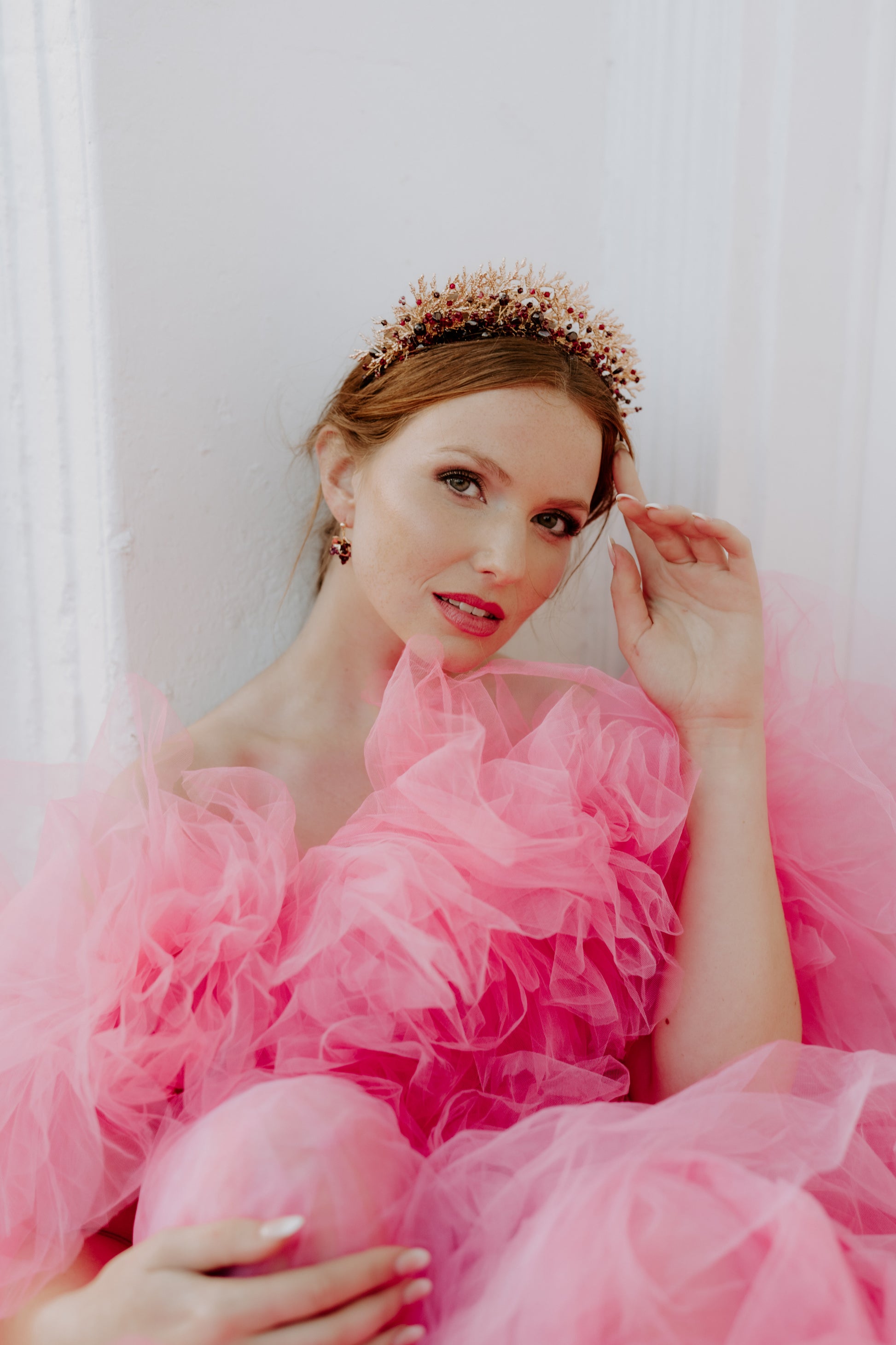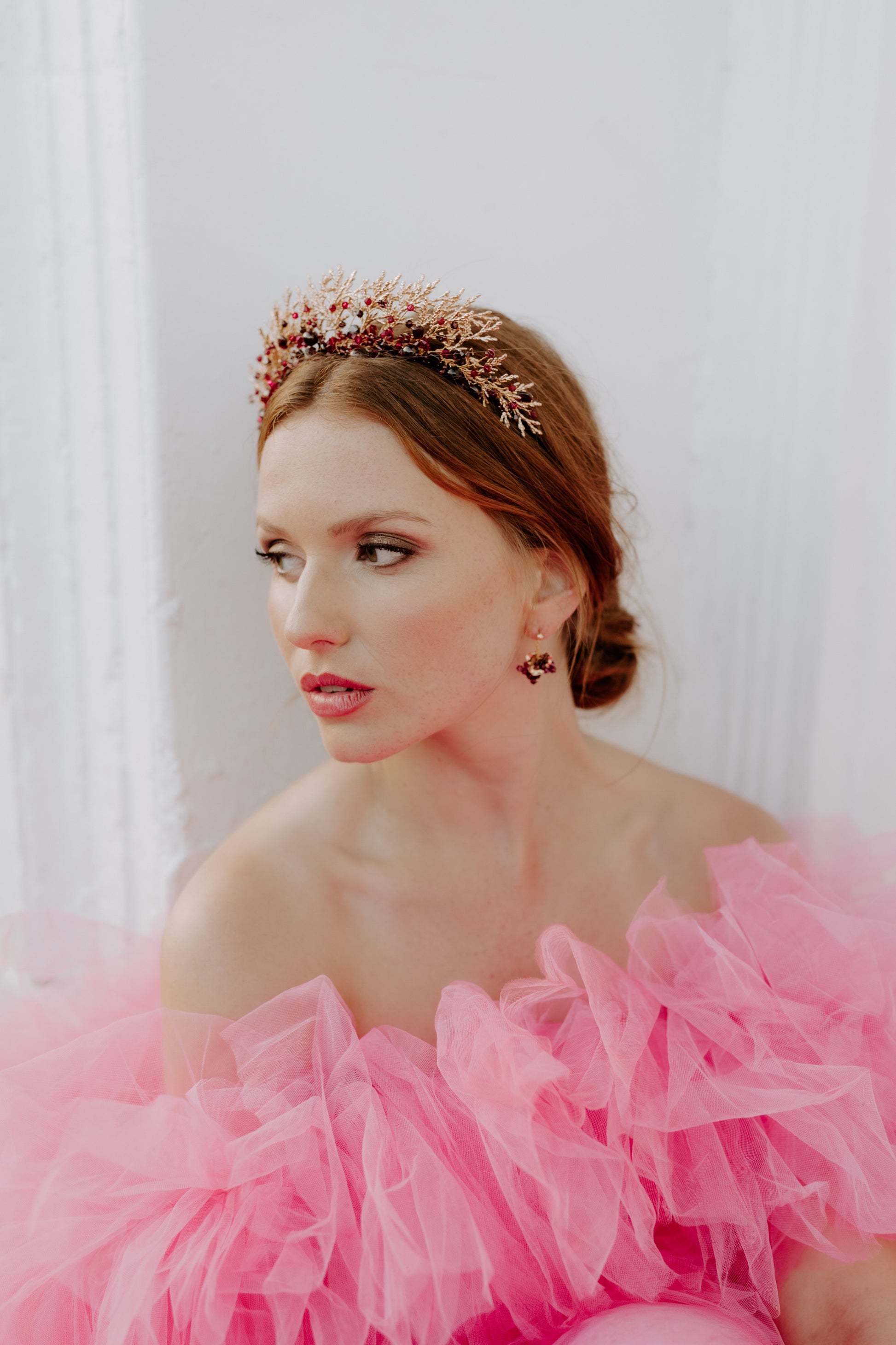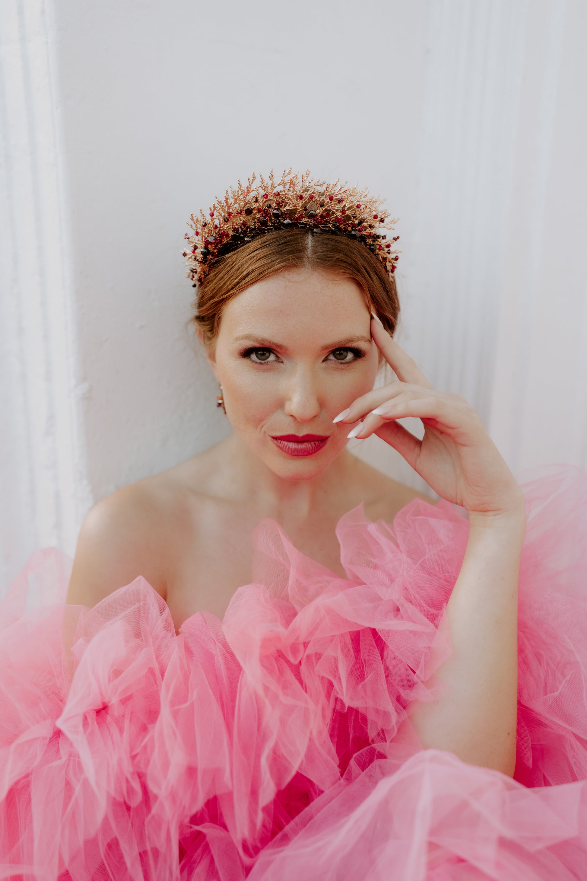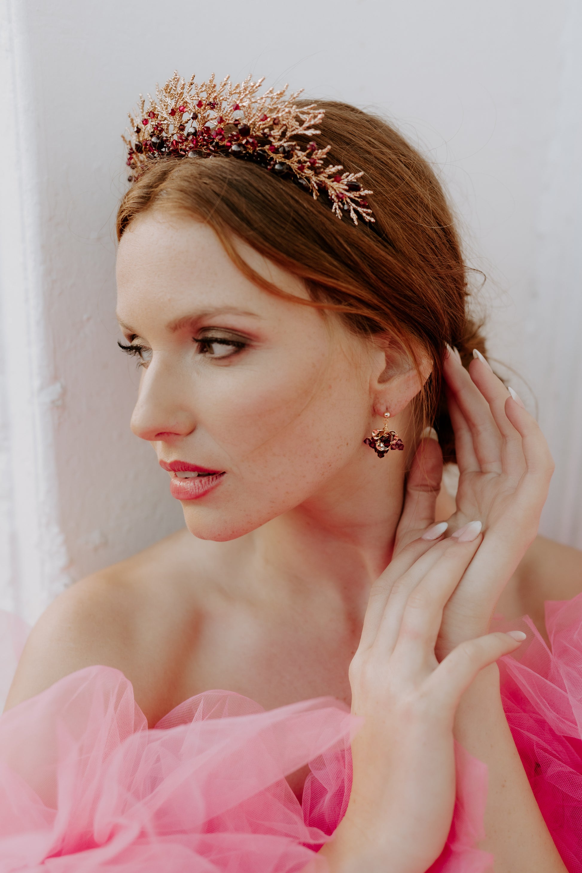 Luxurious clusters of garnet gemstones, deep red and burgundy Swarovski crystals front a halo of golden sprigs creating the statement Mulberry Halo headdress. Mounted onto a discreet ribbon covered band for comfortable wear.