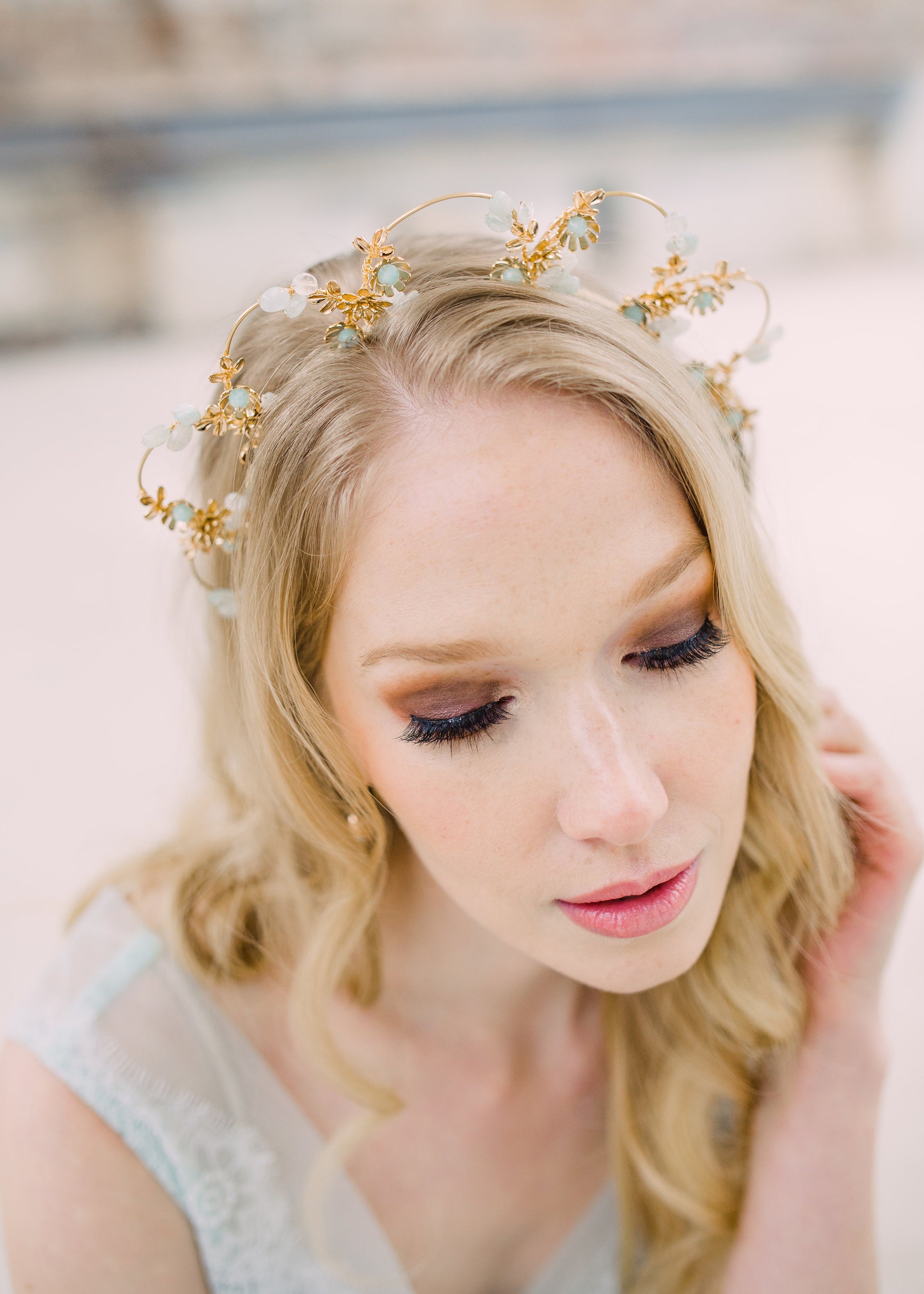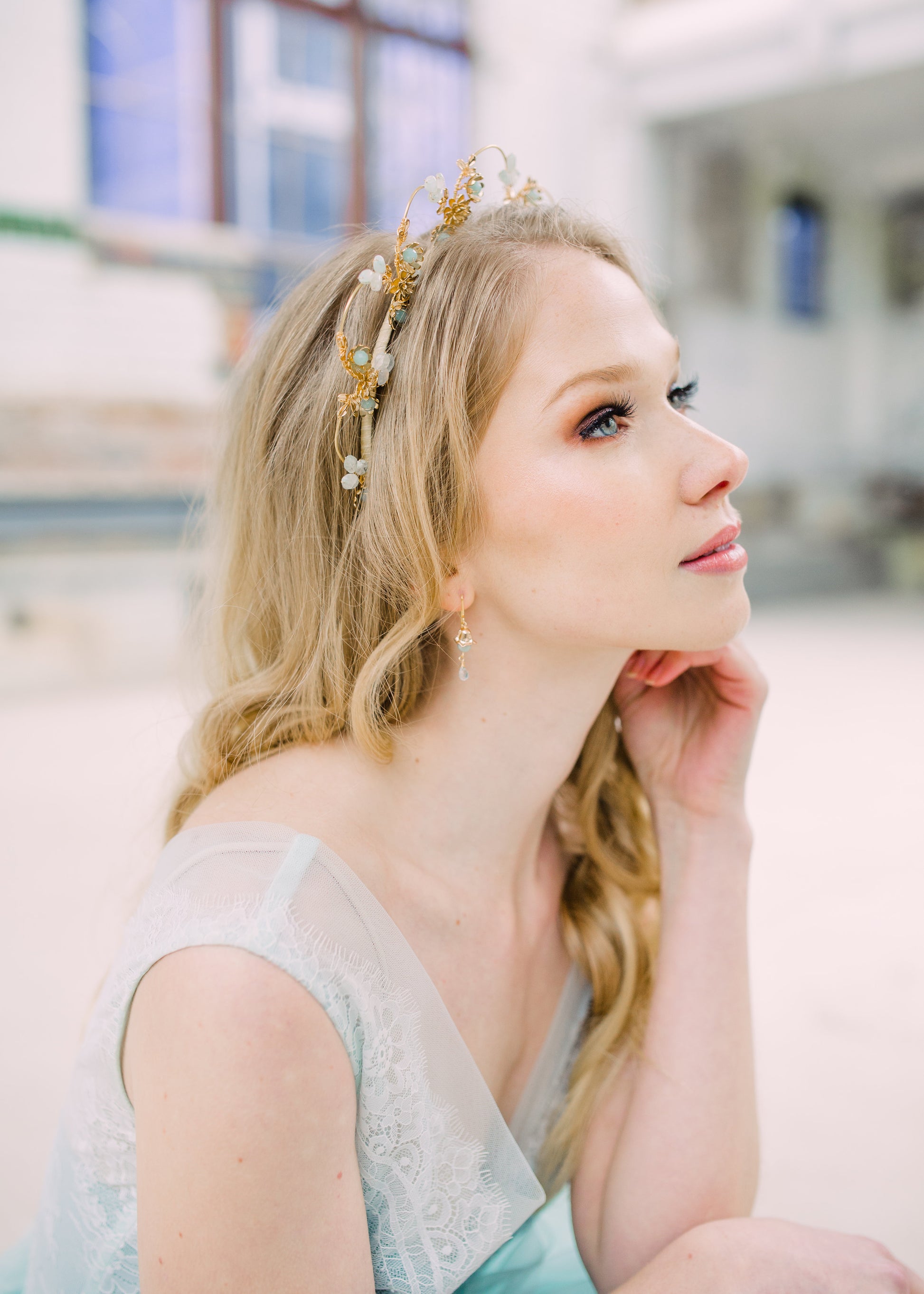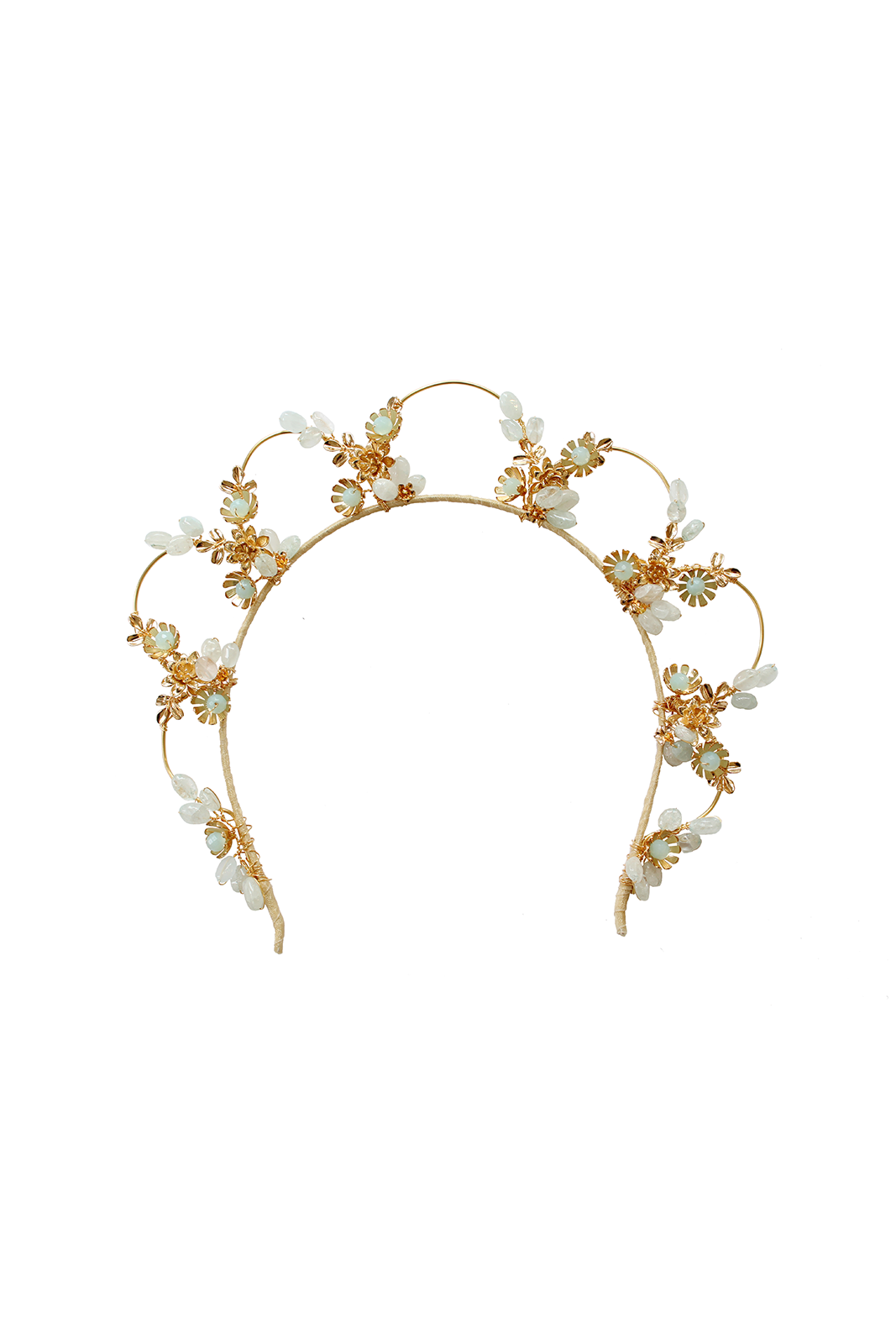A beautiful arched crown embellished with golden blossoms and soft mint and turquoise green Ammonite and Aquamarine gemstones. Constructed on a slim ribbon covered band for a comfortable fit to wear with any hairstyle.