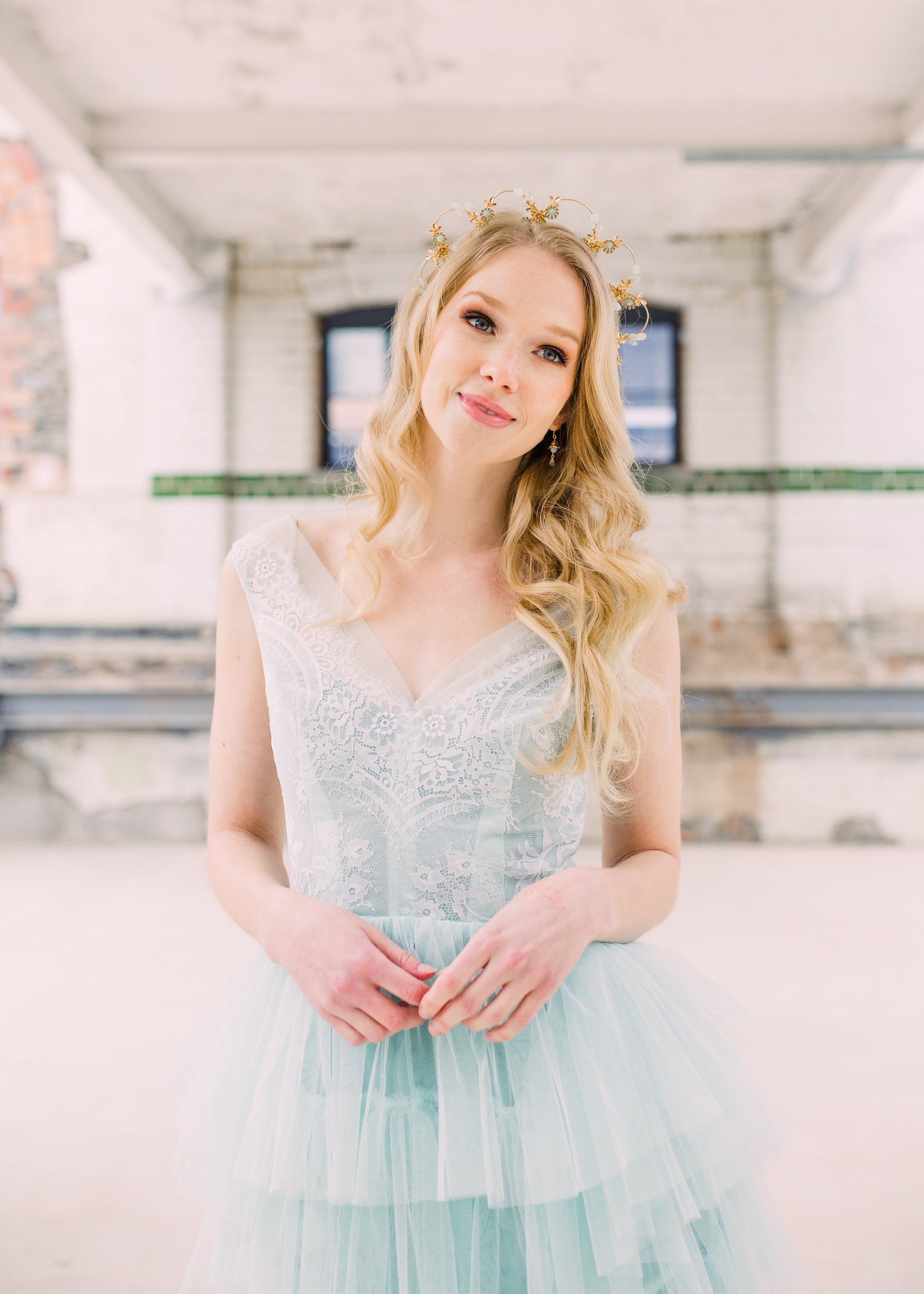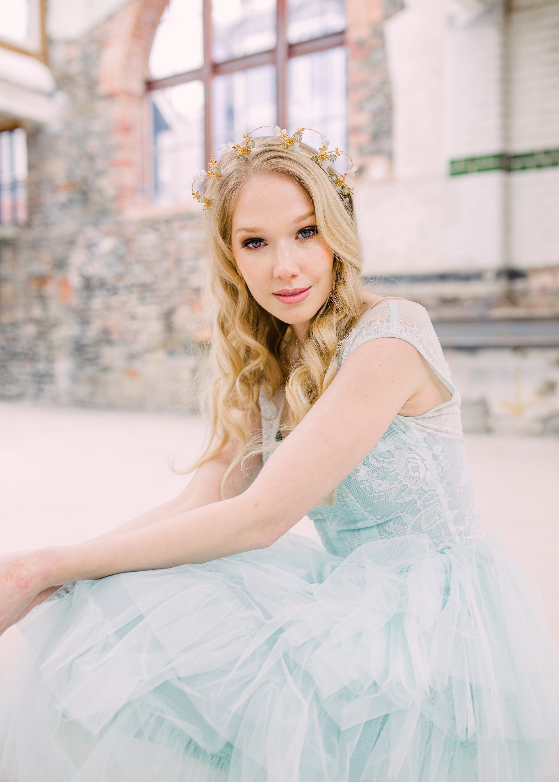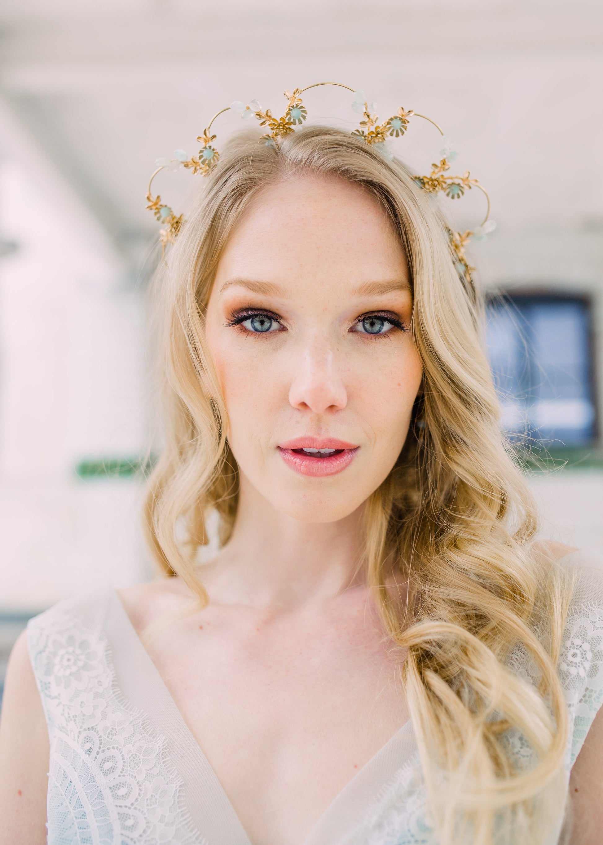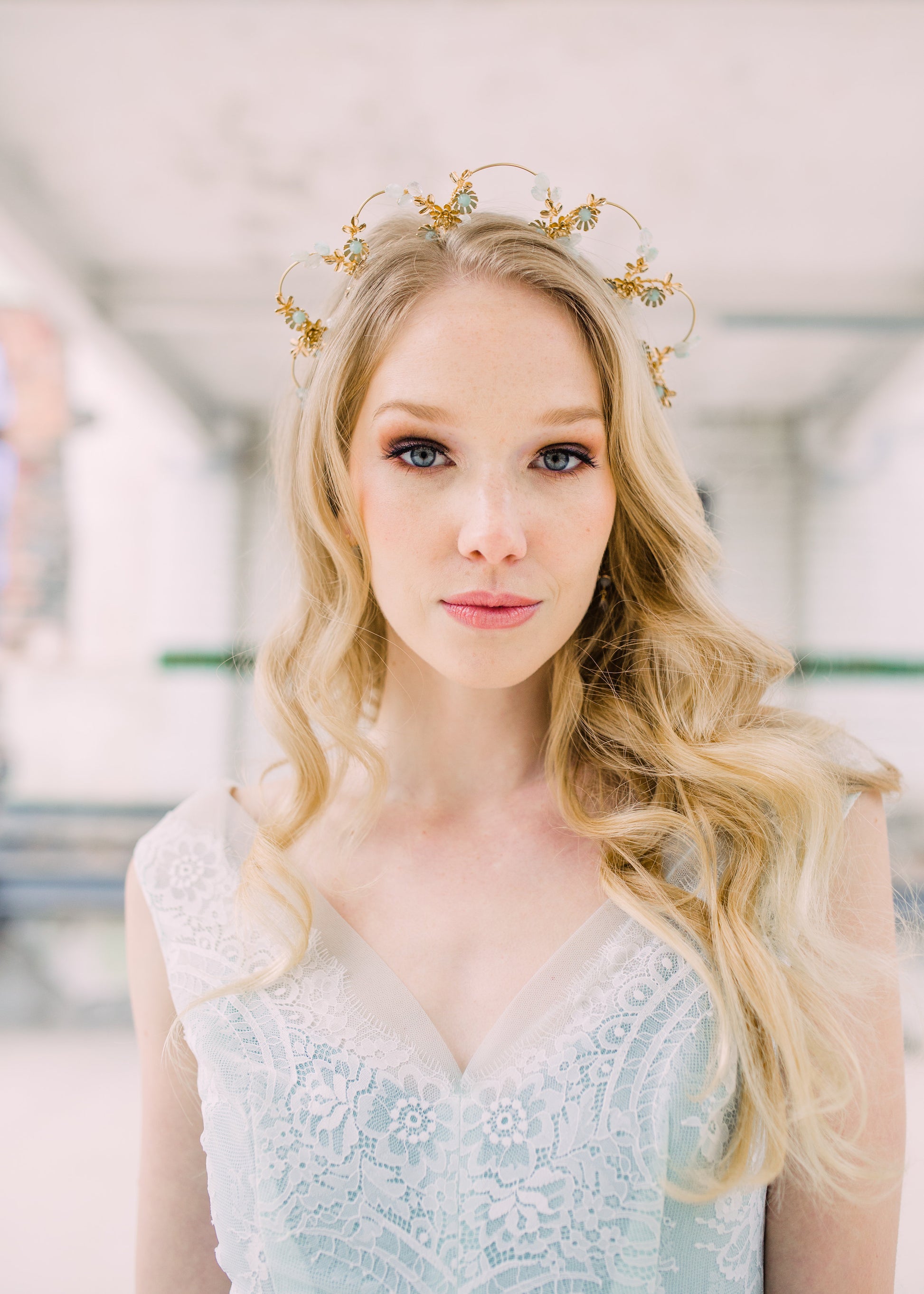 A beautiful arched crown embellished with golden blossoms and soft mint and turquoise green Ammonite and Aquamarine gemstones. Constructed on a slim ribbon covered band for a comfortable fit to wear with any hairstyle.