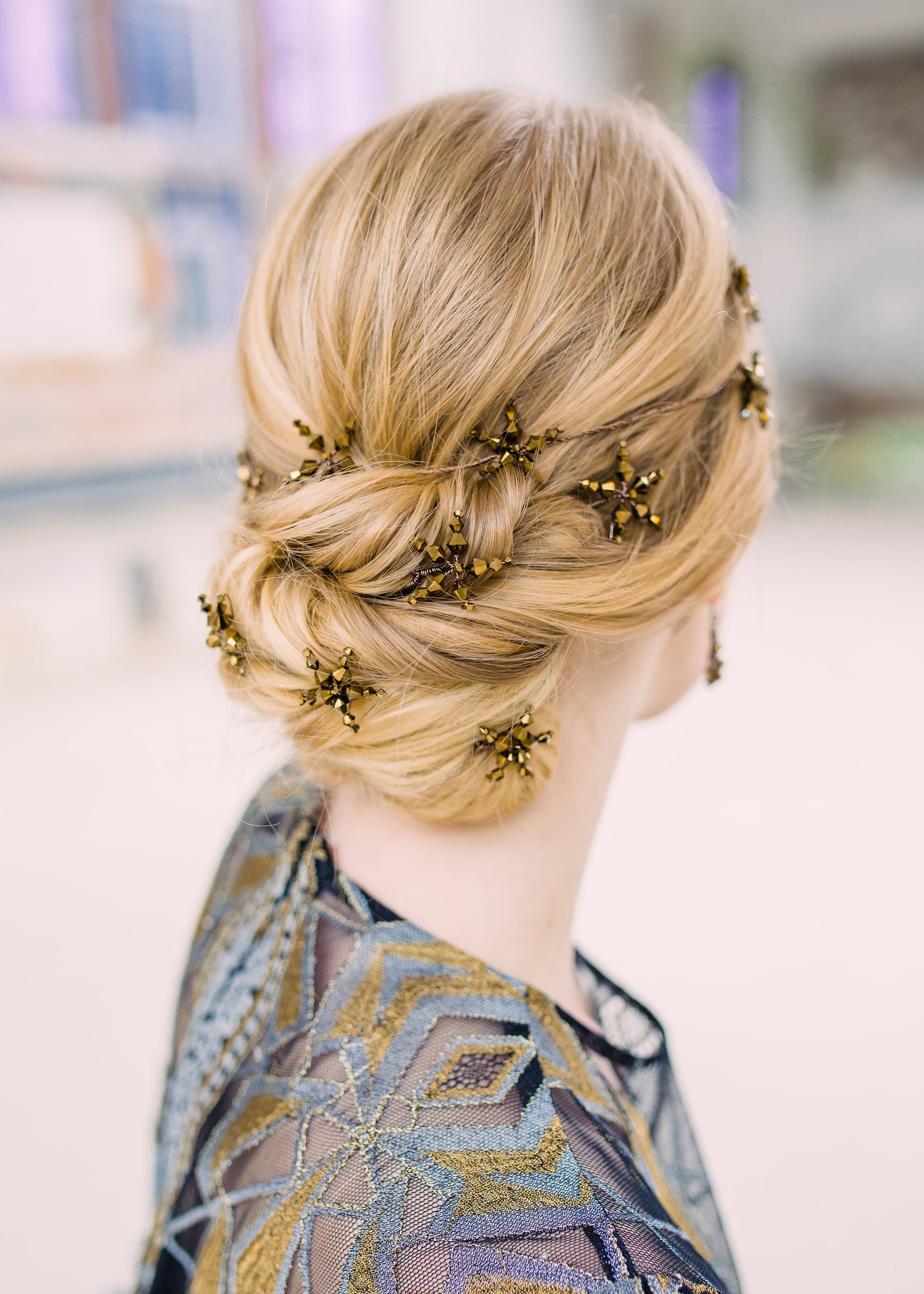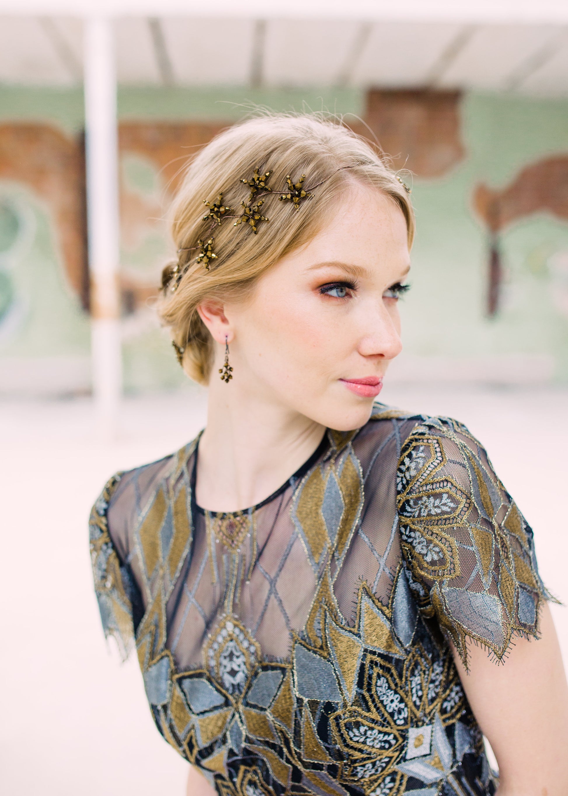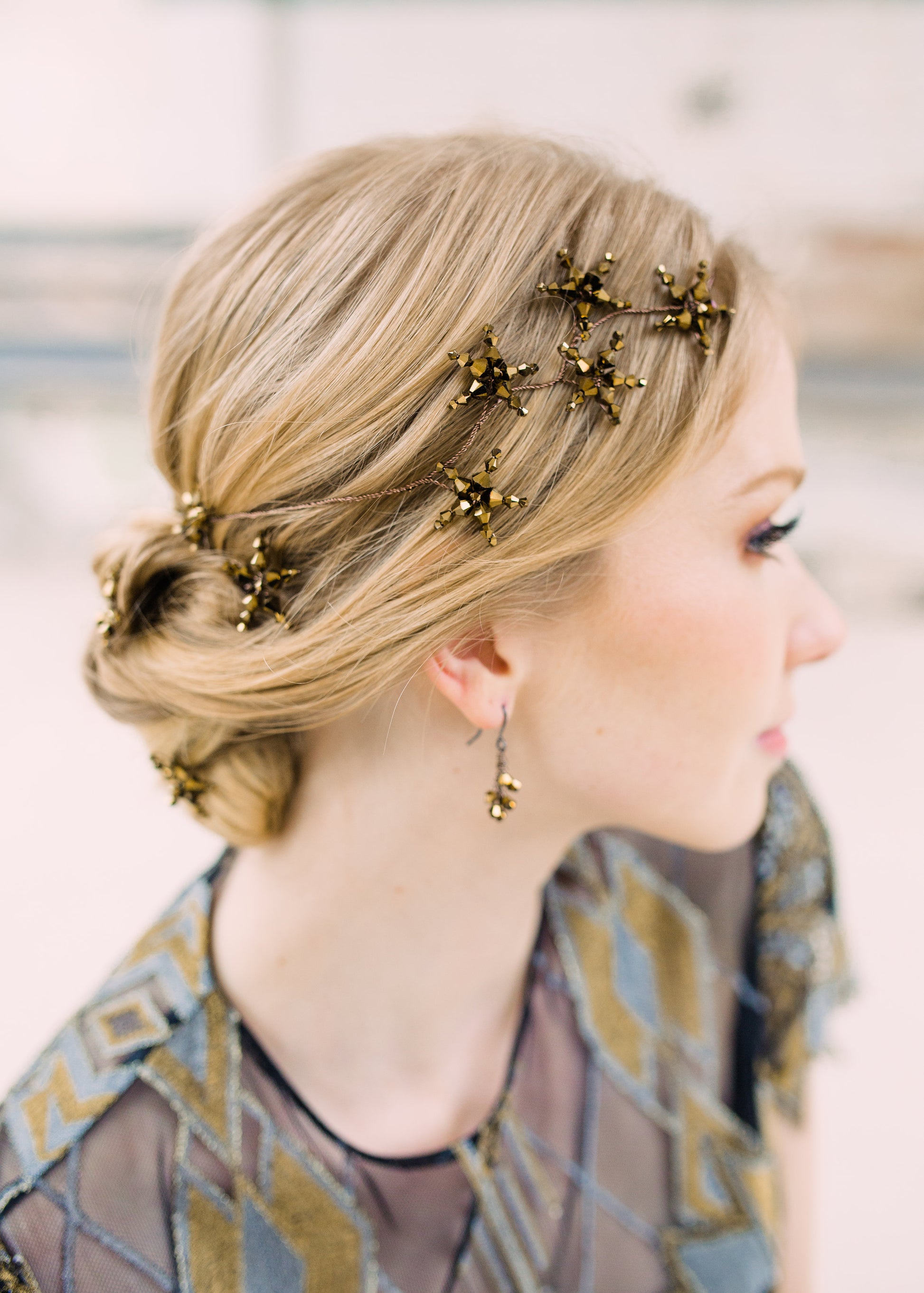 Rich dark gold Swarovski crystal stars glistening on a copper wire garland to adorn the hair for that very special occasion. Pair with the dazzling Orion Hairpins for the ultimate starry showcase.