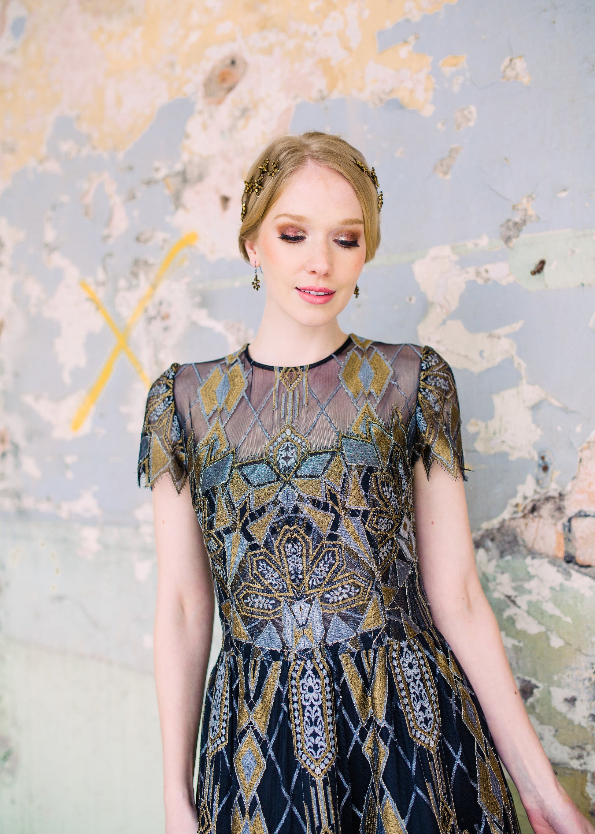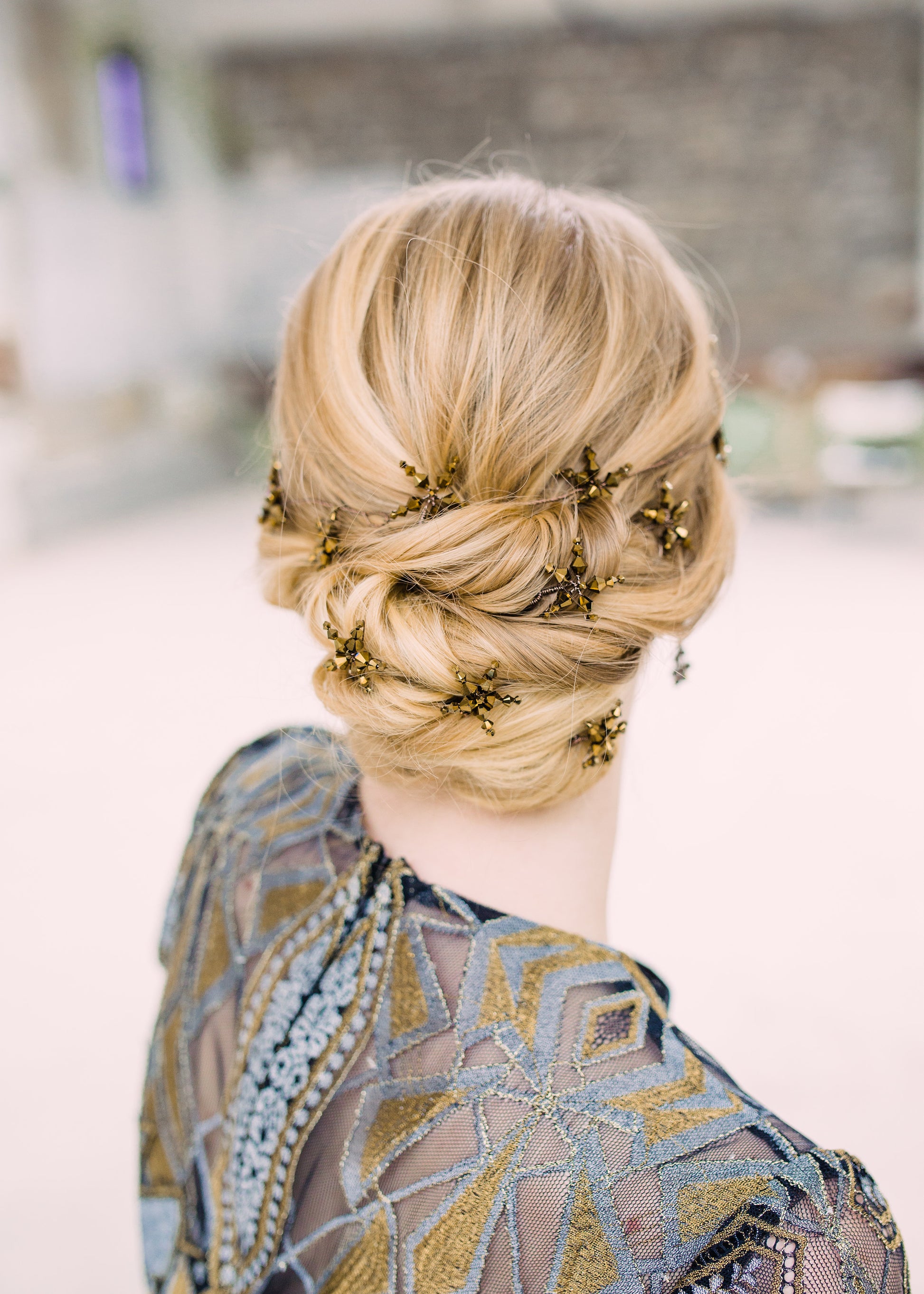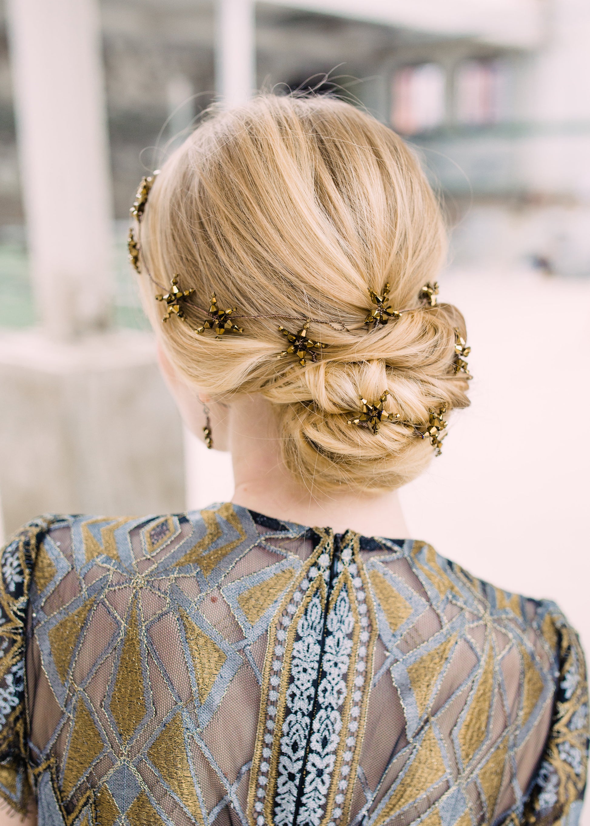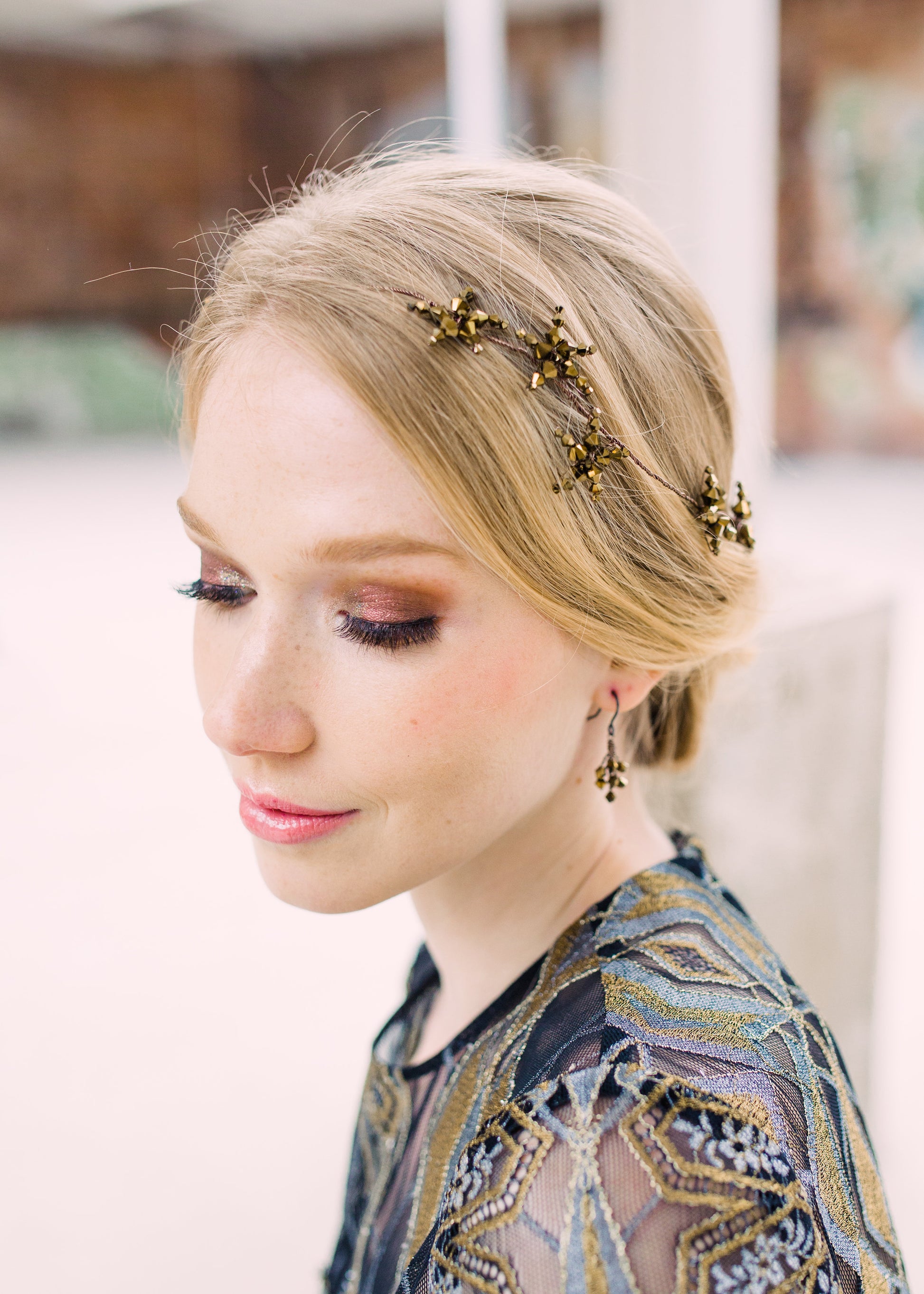 Rich dark gold Swarovski crystal stars glistening on a copper wire garland to adorn the hair for that very special occasion. Pair with the dazzling Orion Hairpins for the ultimate starry showcase.