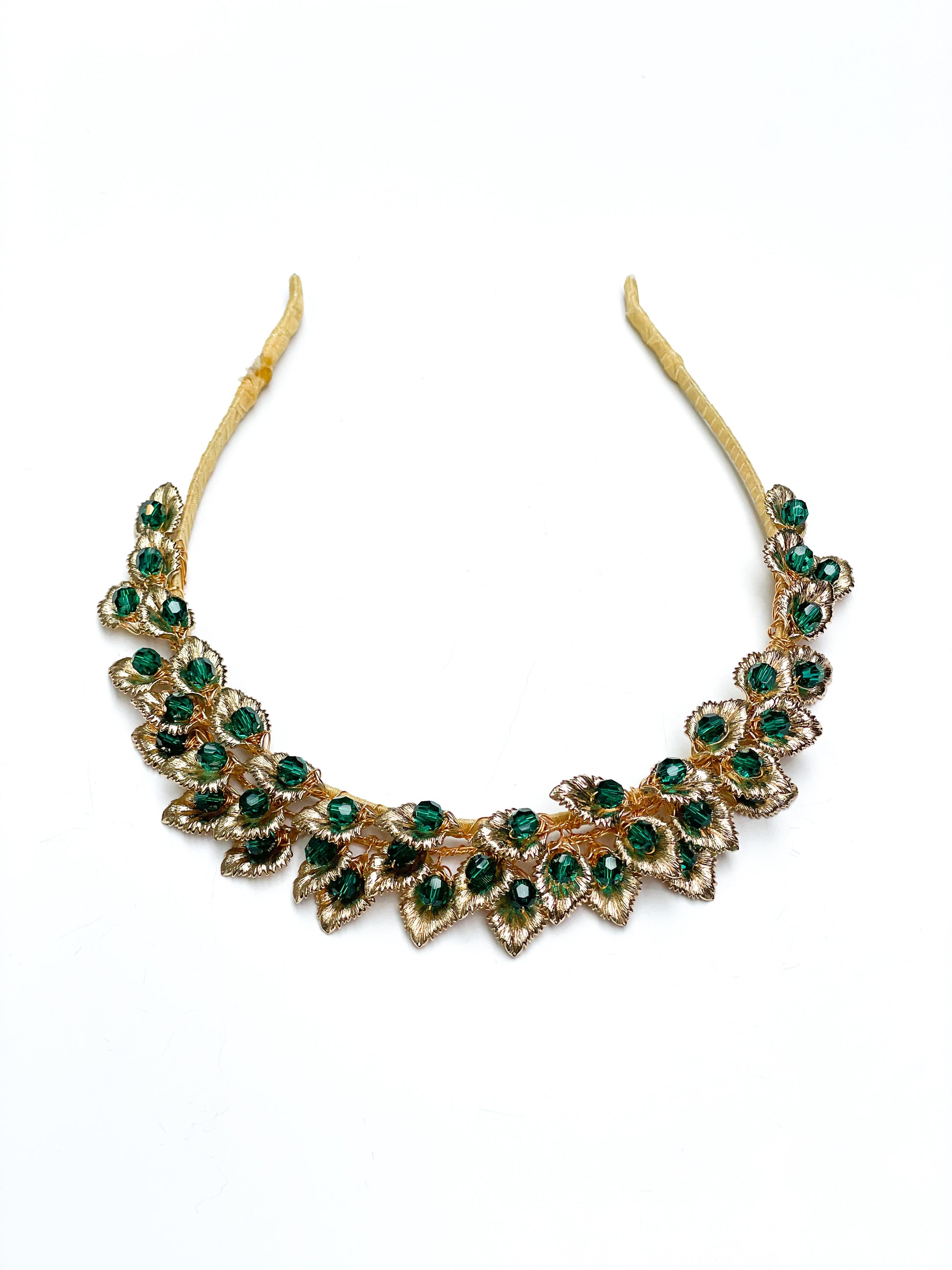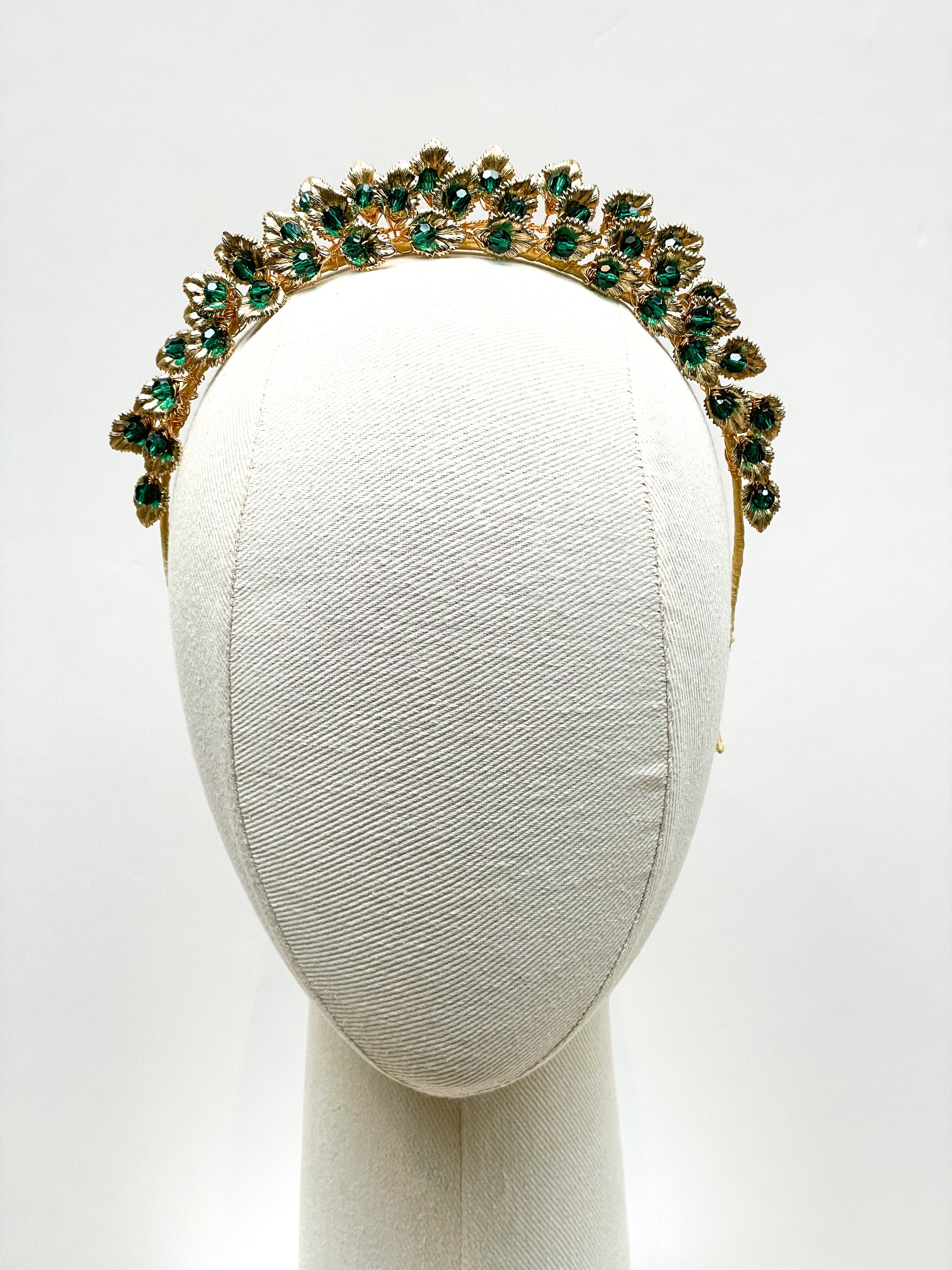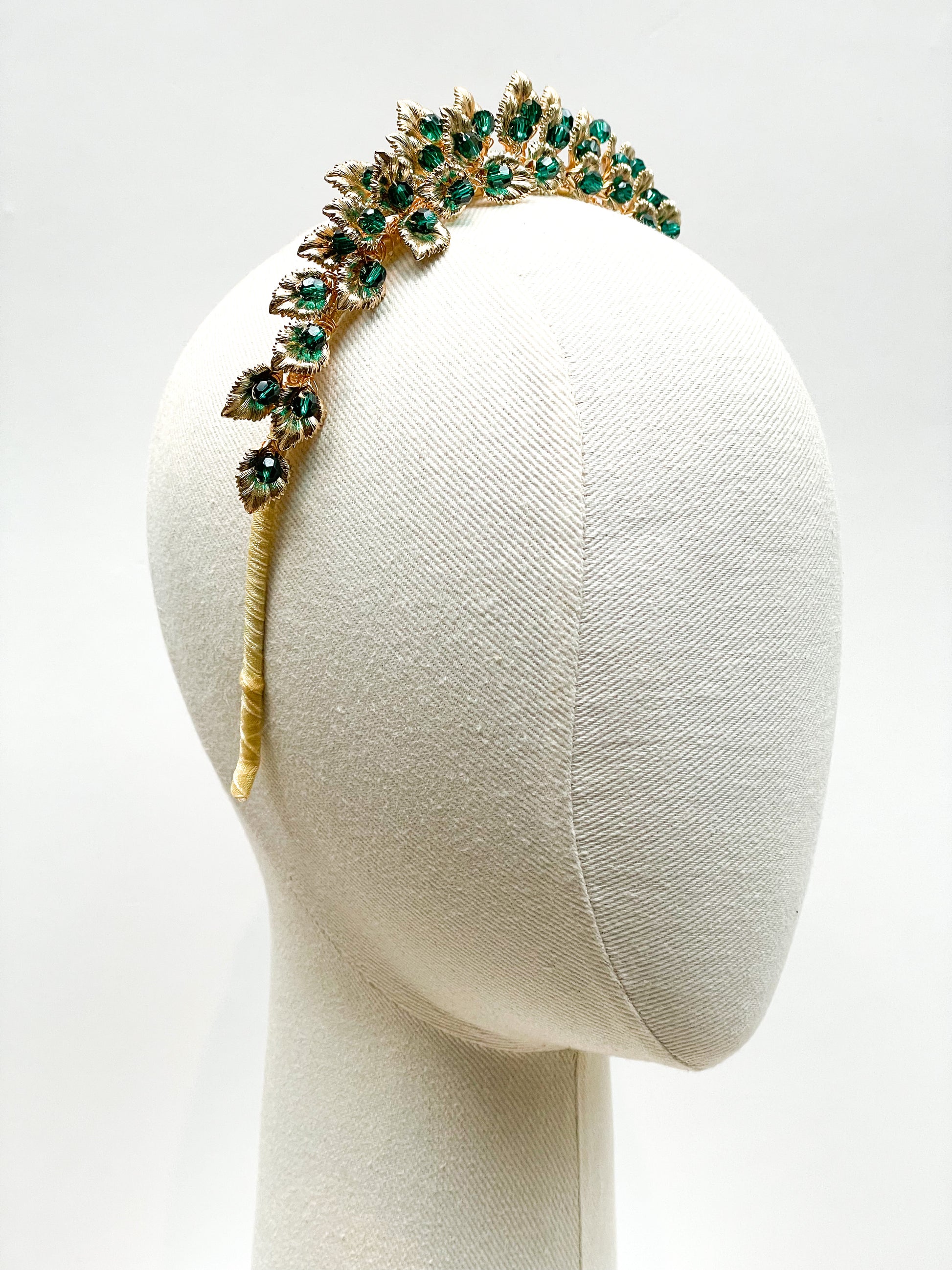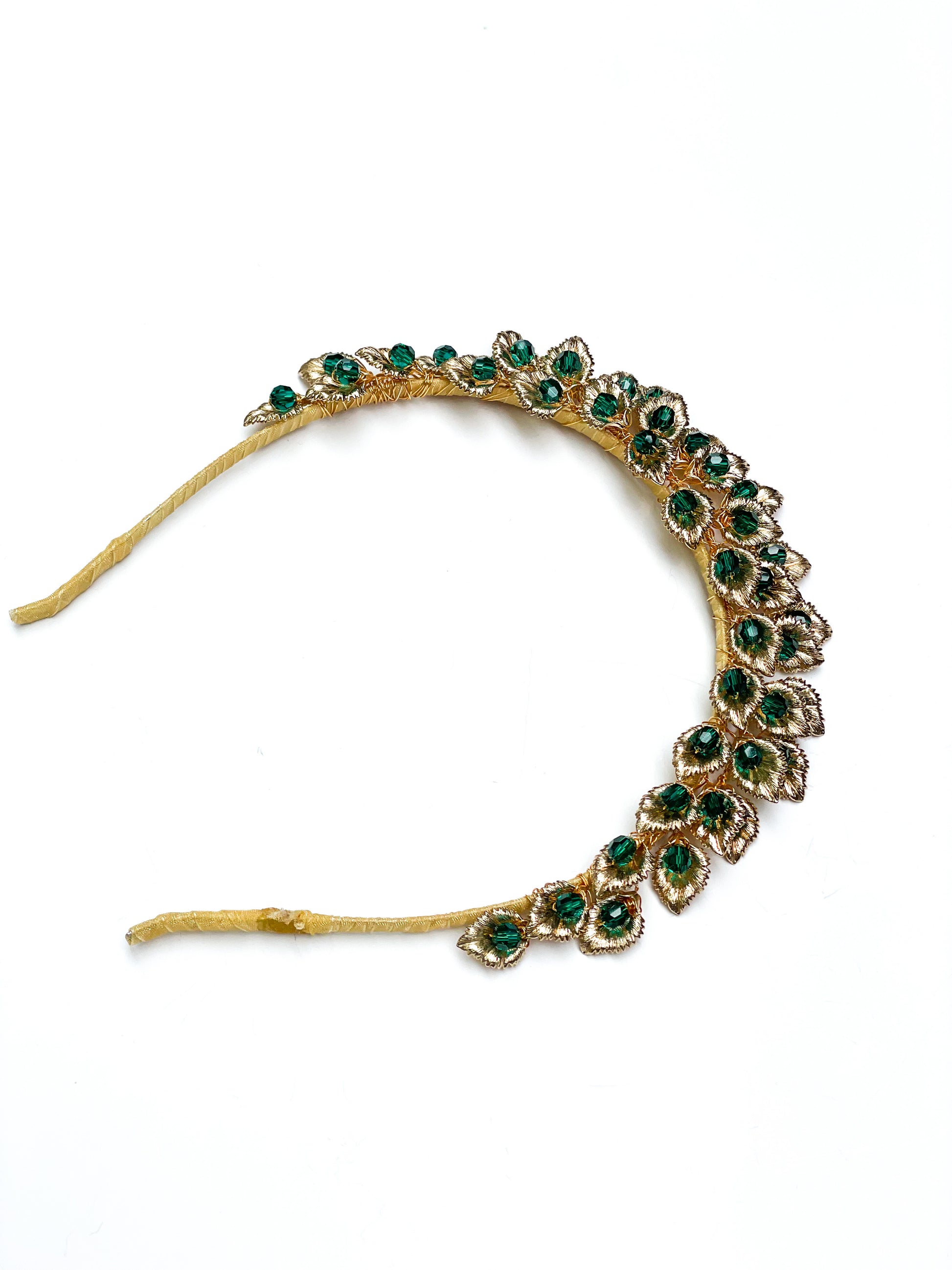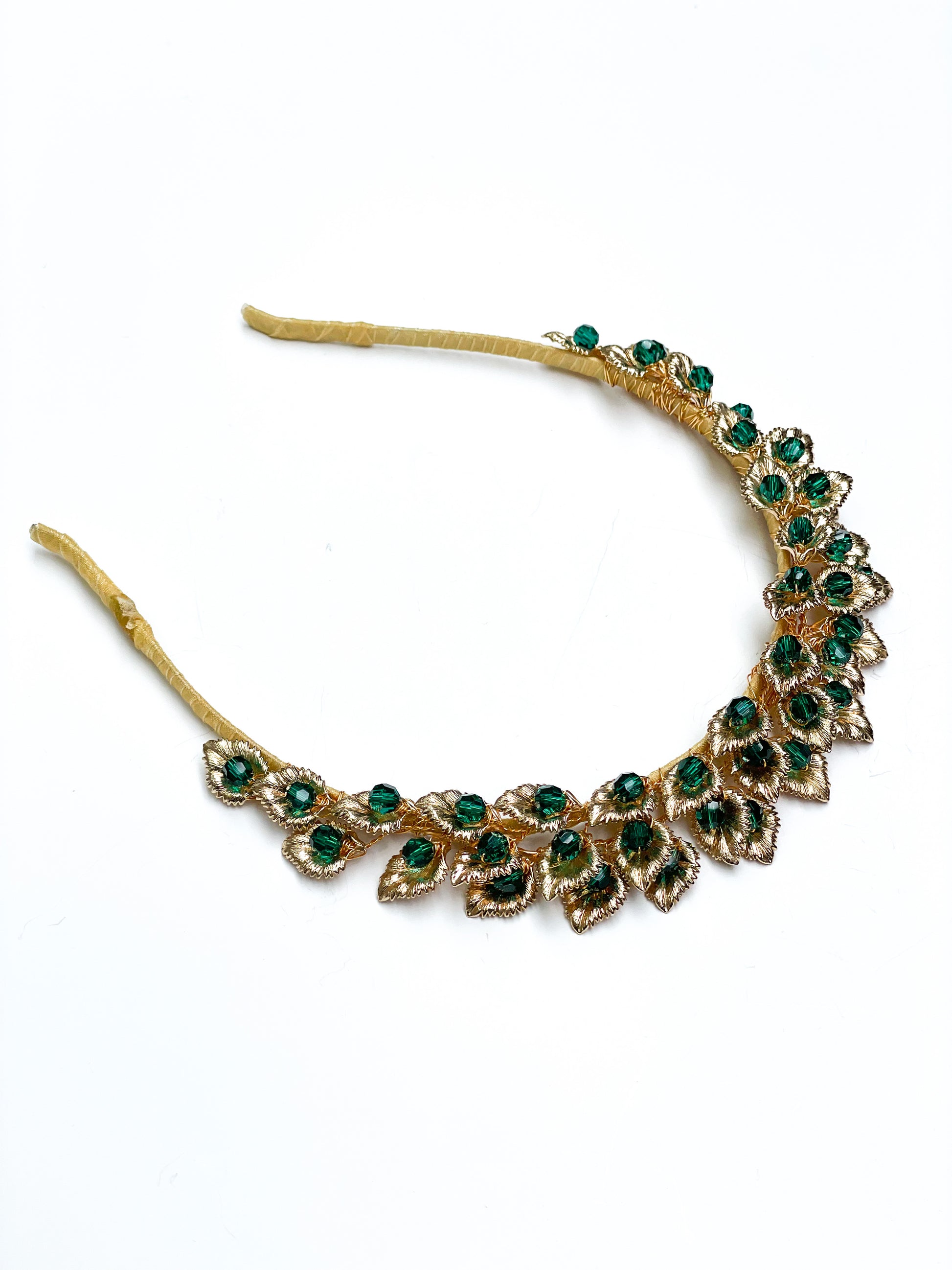 Emerald Swarovski crystals set within 24k gold plated leaves arranged into a stunning halo. Mounted onto a discreet ribbon covered band for comfortable wear.