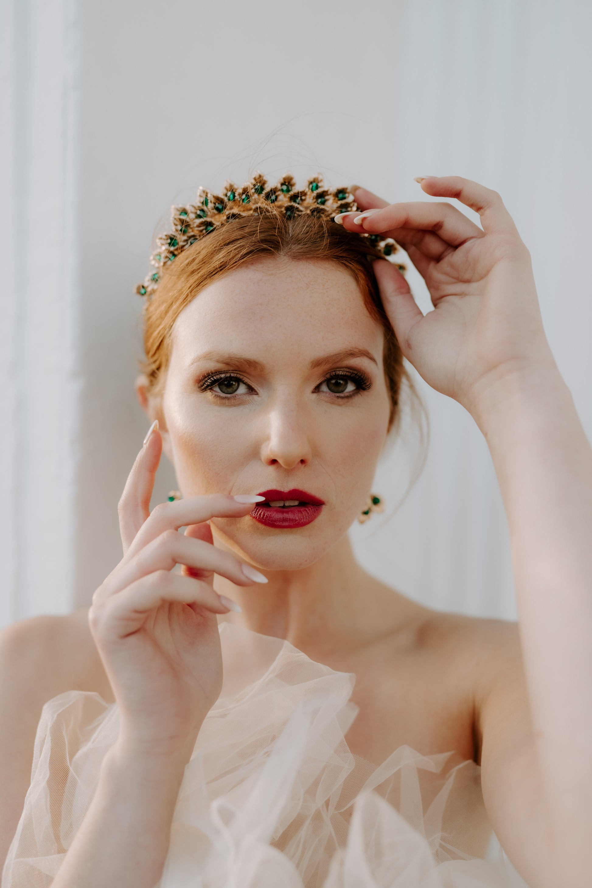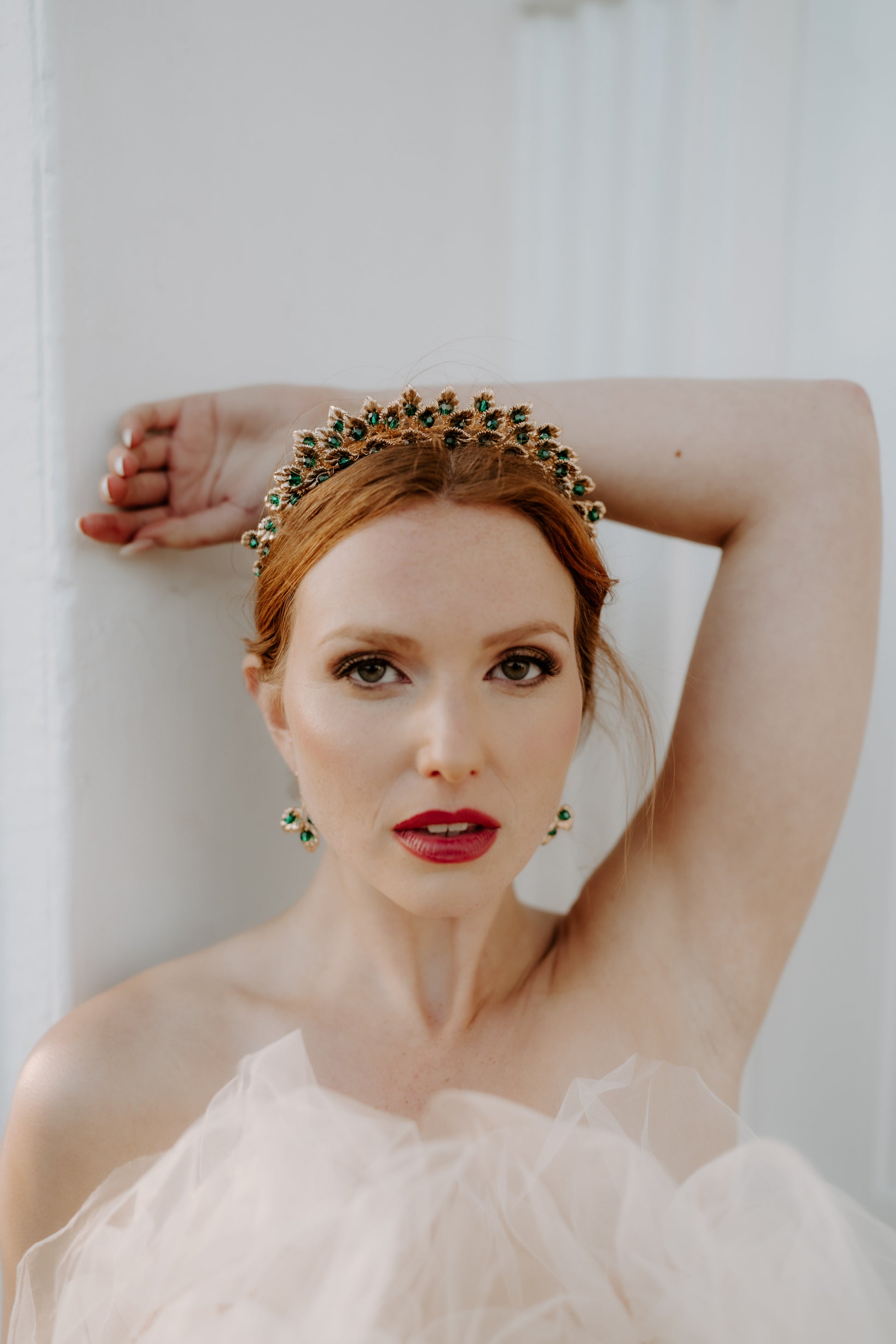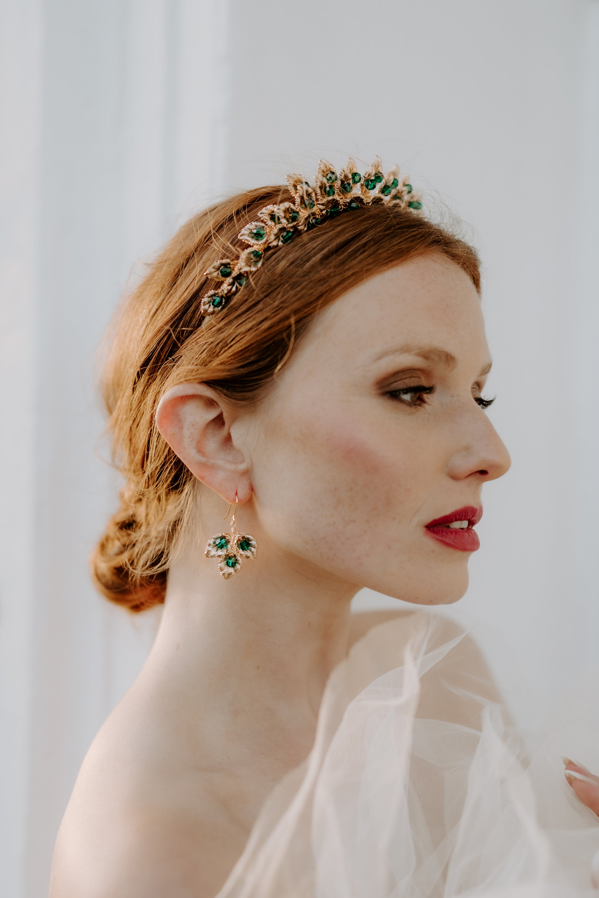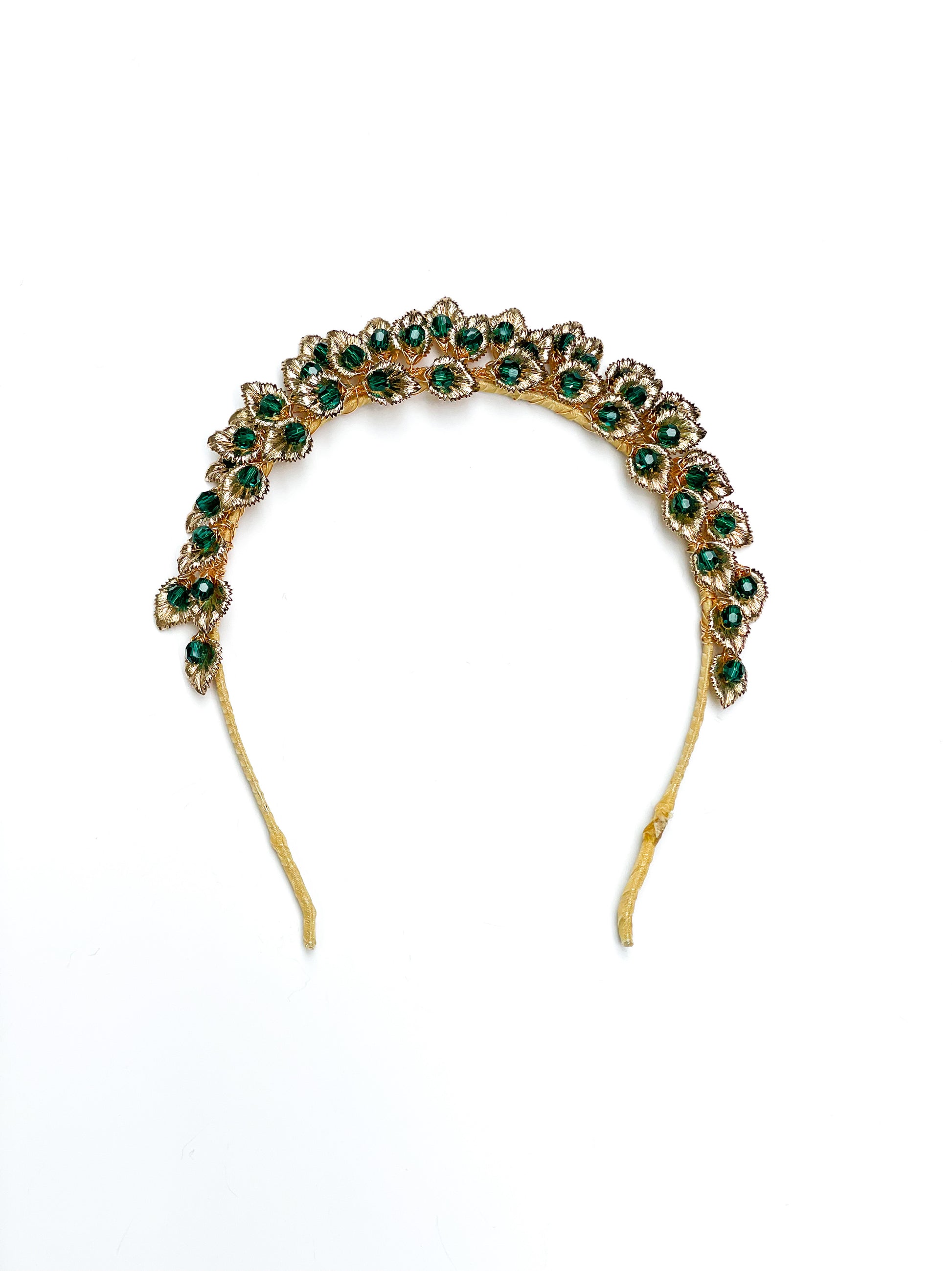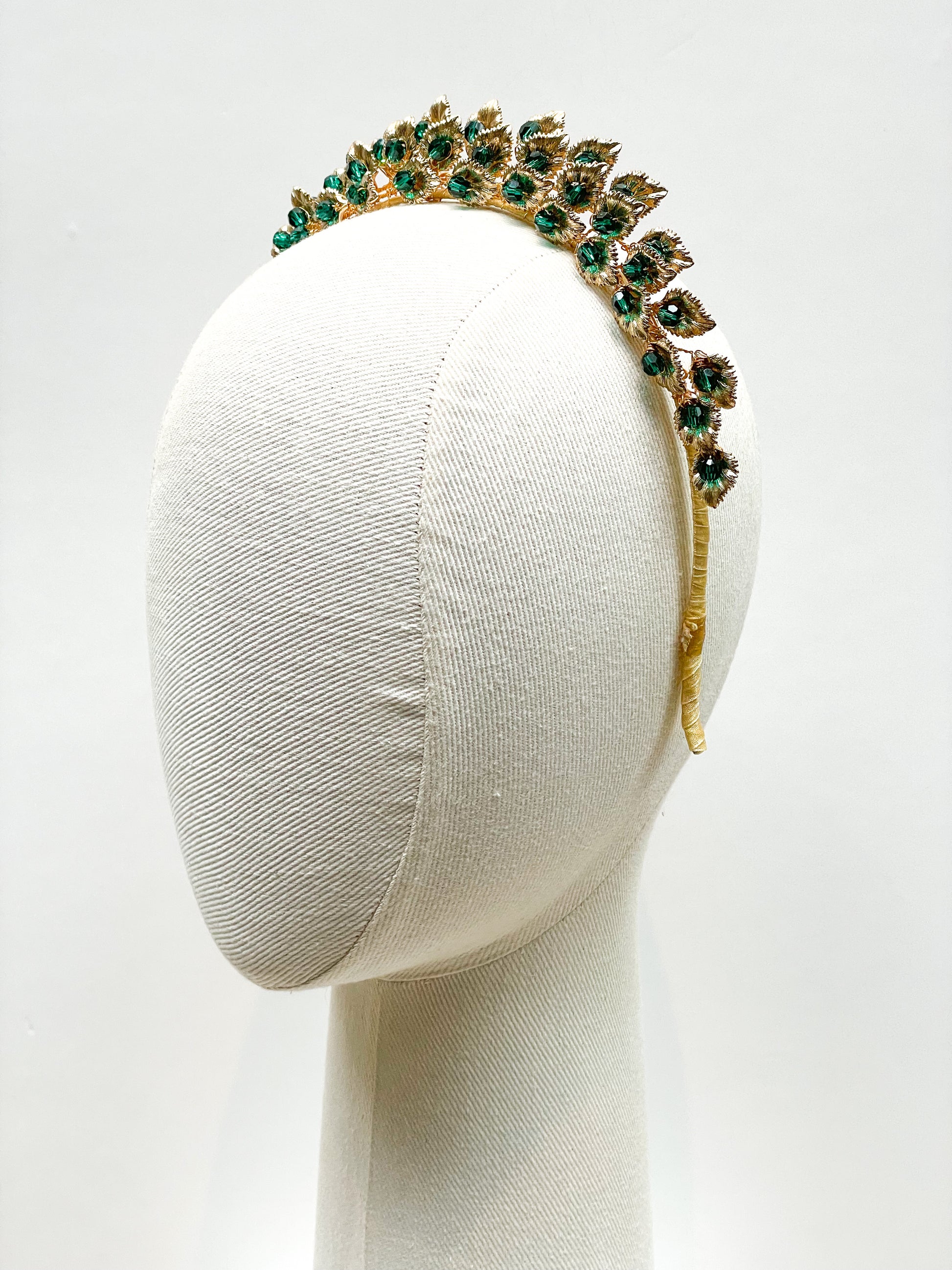 Emerald Swarovski crystals set within 24k gold plated leaves arranged into a stunning halo. Mounted onto a discreet ribbon covered band for comfortable wear.