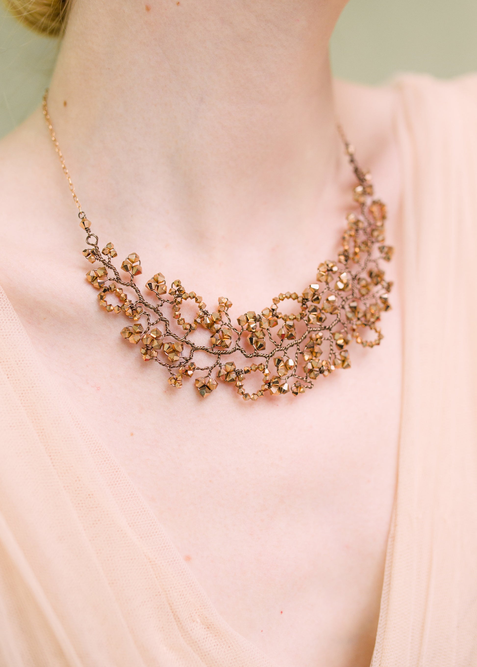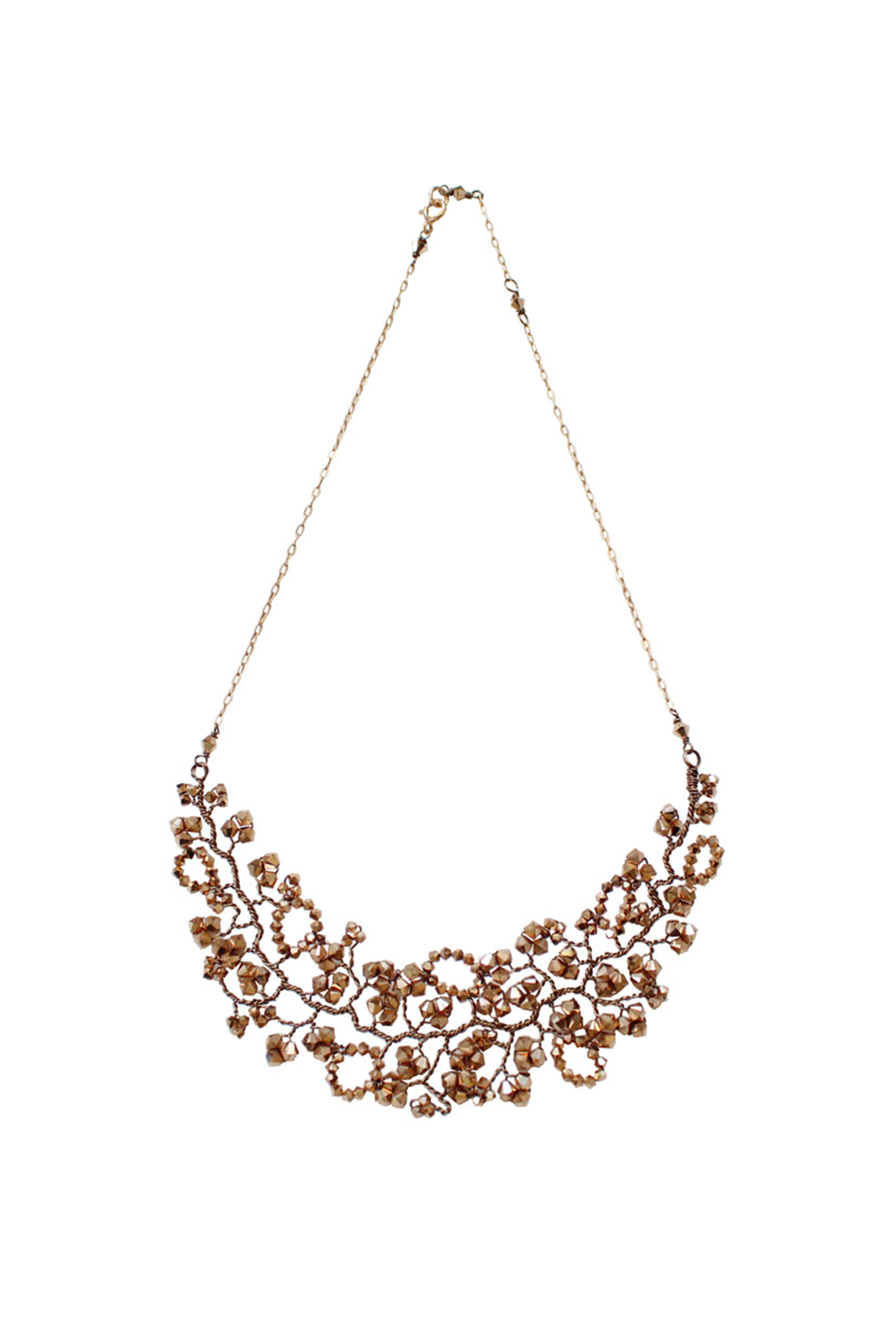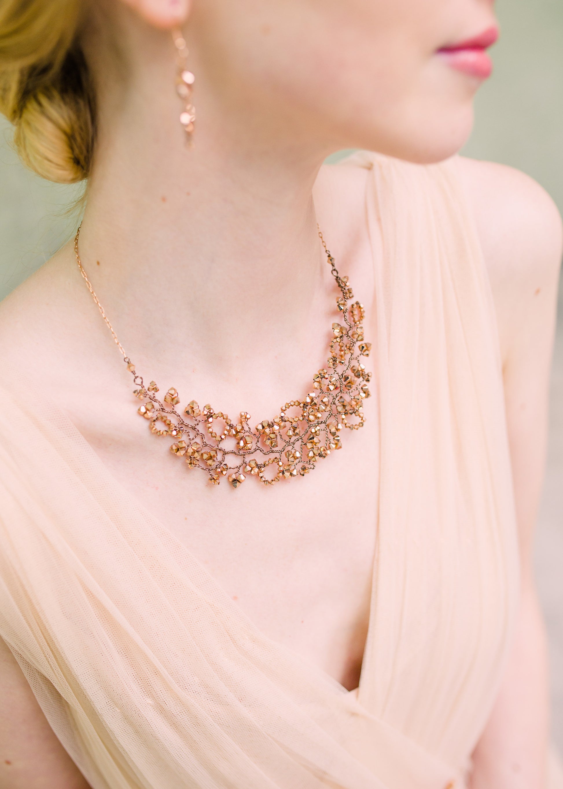 A gorgeous cluster of rose gold Swarovski crystals in vines of rose gold wire embellished with rose gold crystal leaves and blossoms, this adjustable chain necklace is the perfect neck adornment for any occasion.