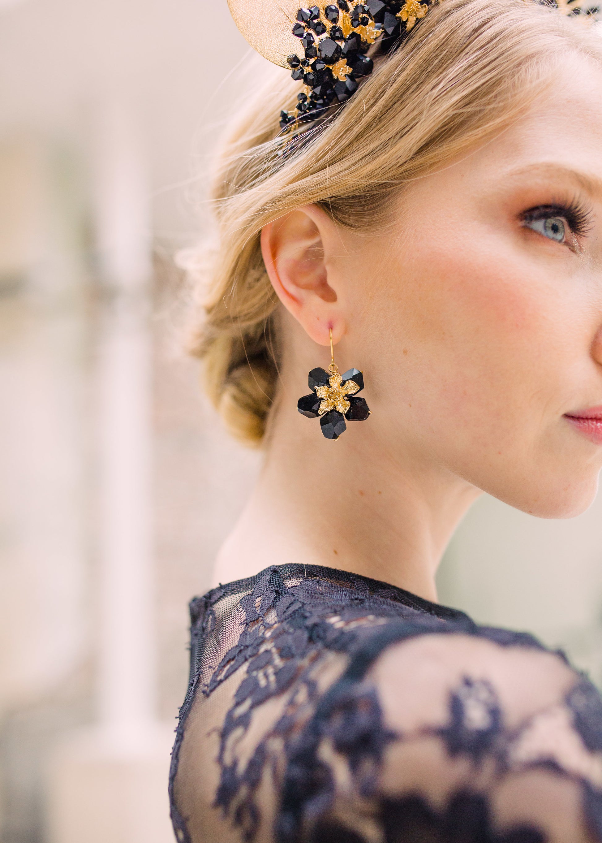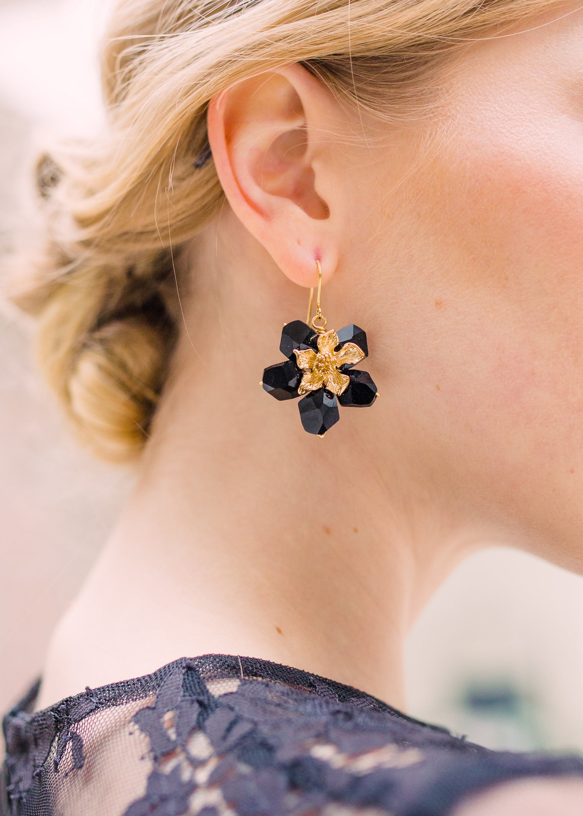 Black Swarovski flowers with 24k gold plated centres.
