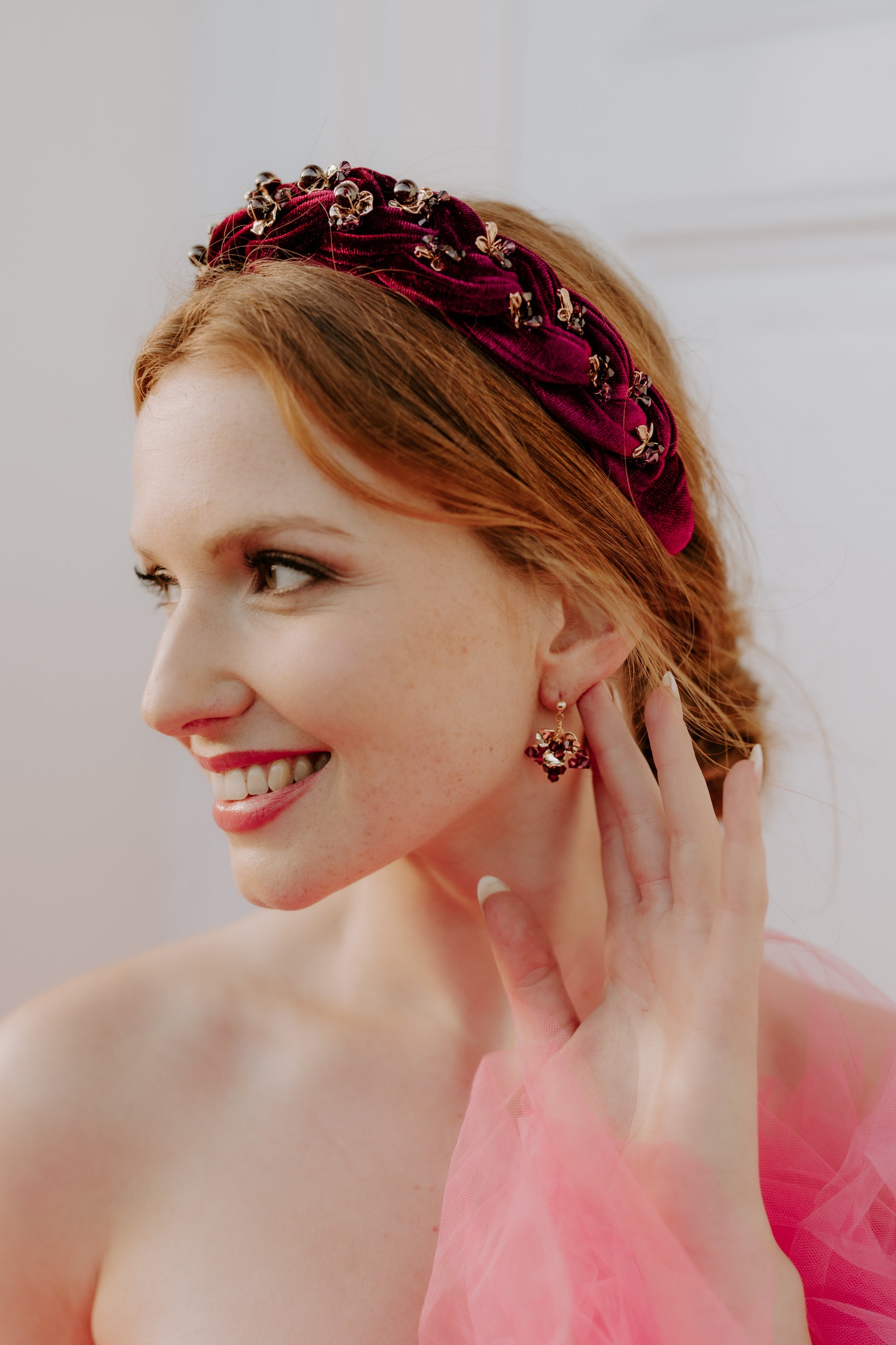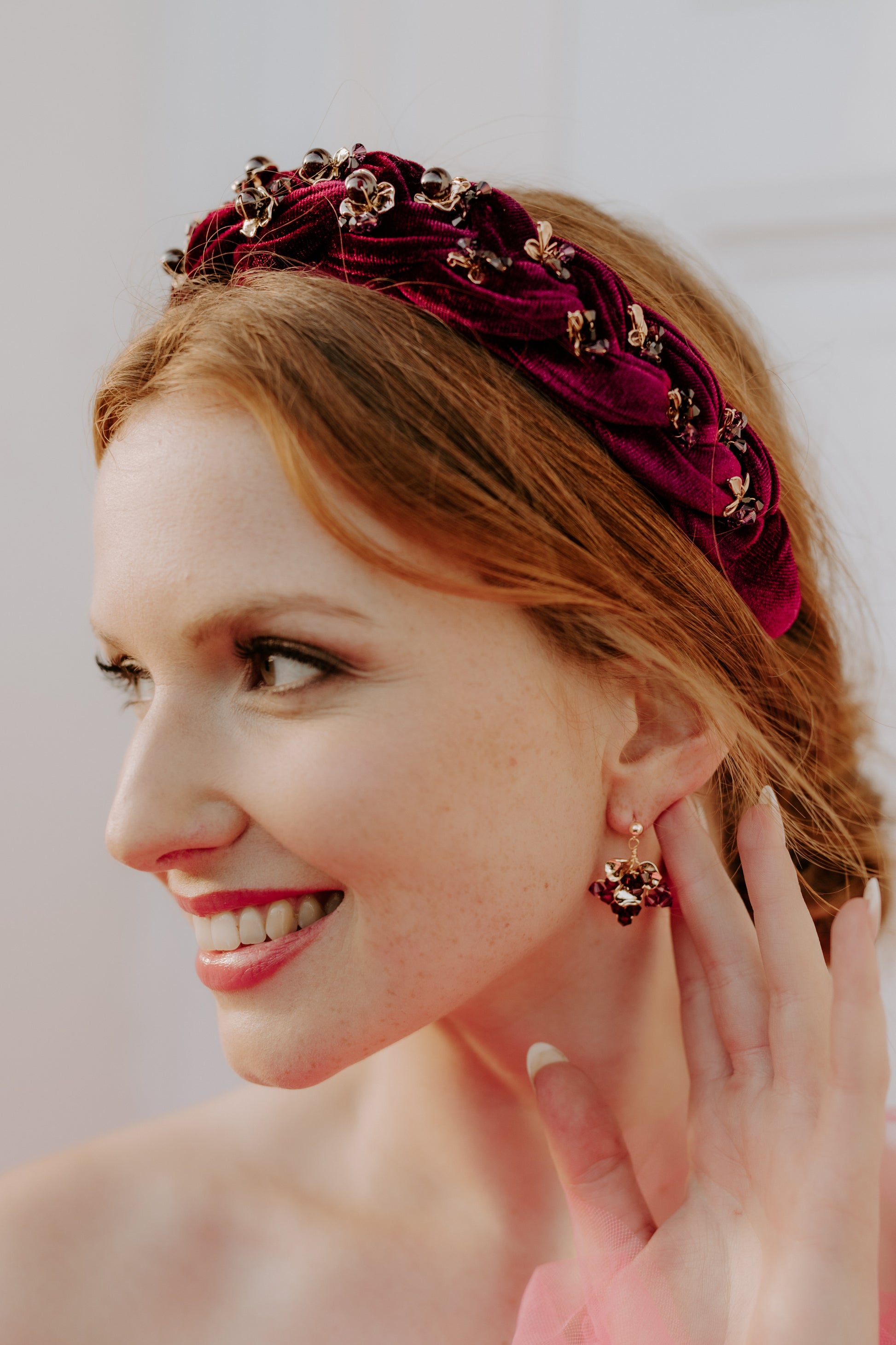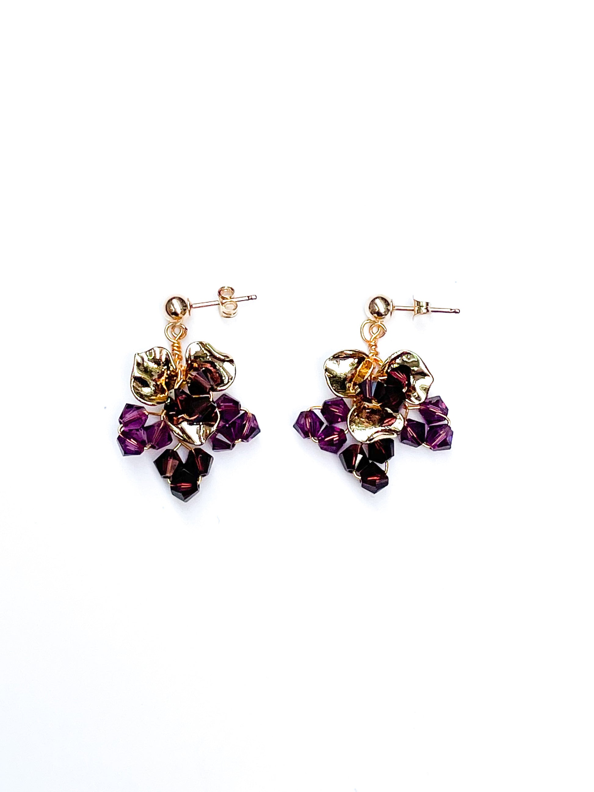 Golden flowers framed with Berry-tone Swarovski crystals and gemstones.