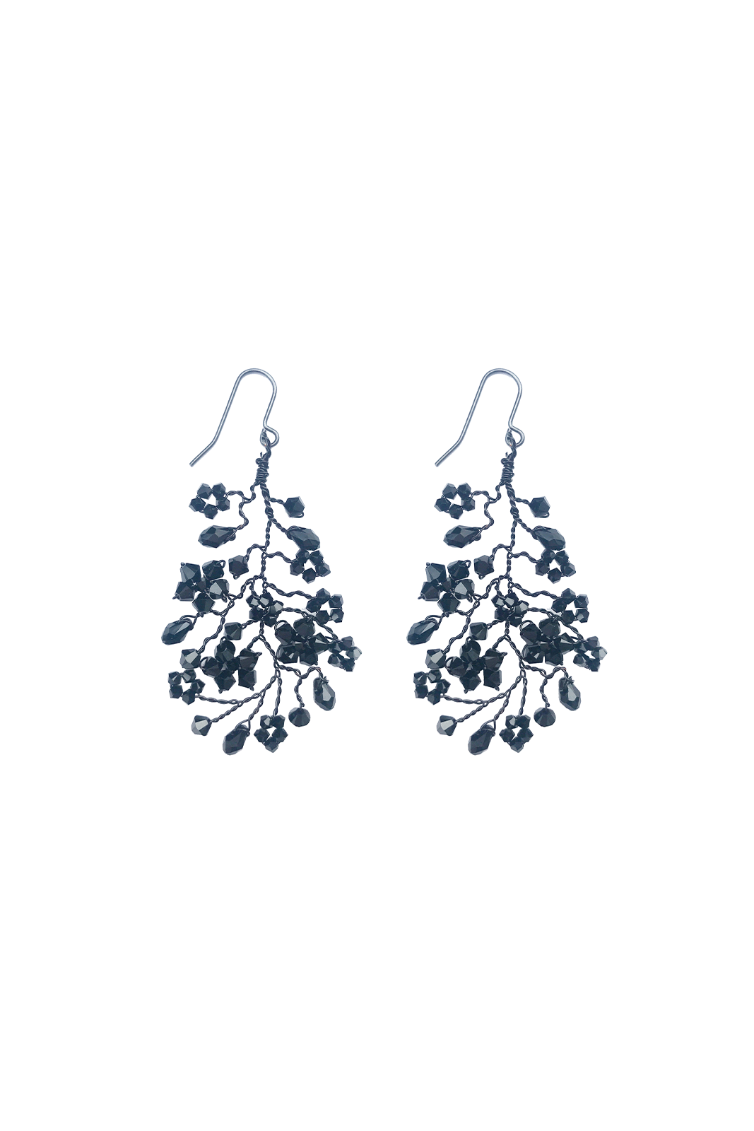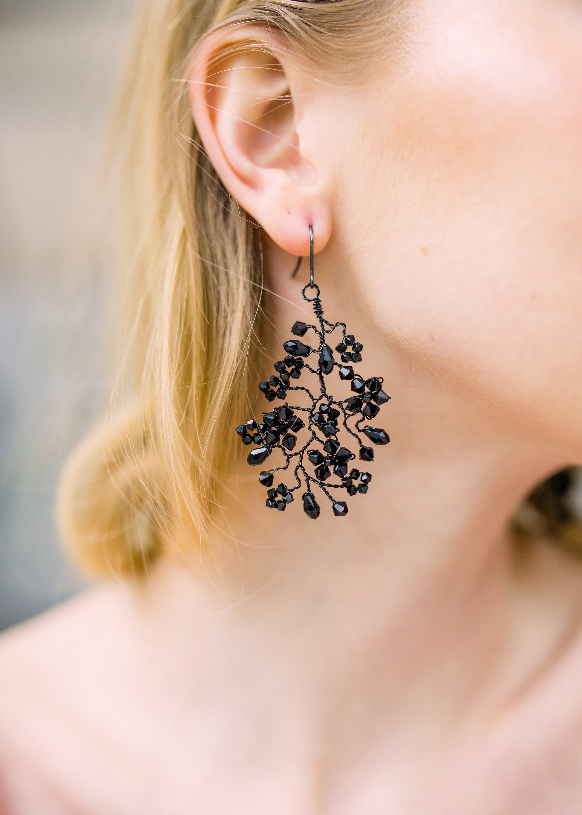 A beautiful clustered chandelier of black Swarovski crystals in vines and blossoms on a slim hook.