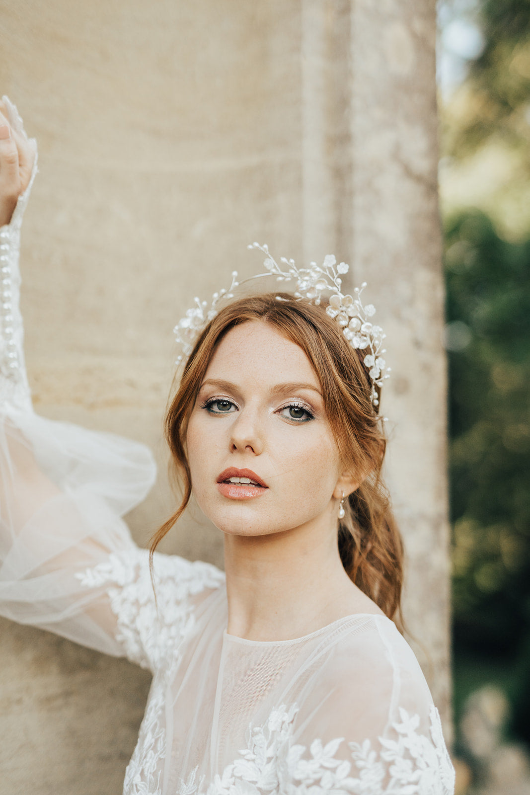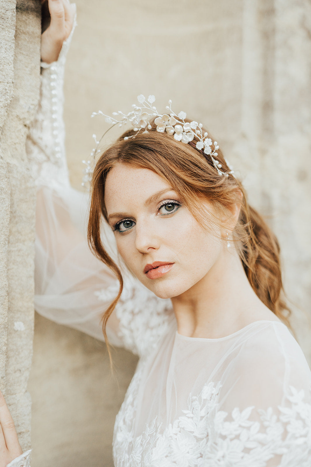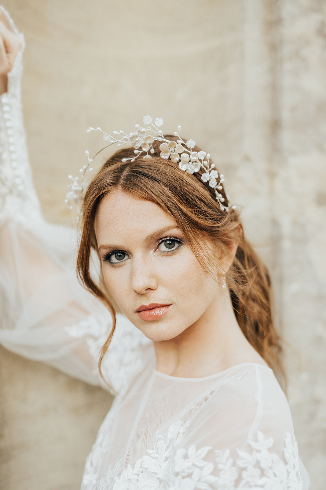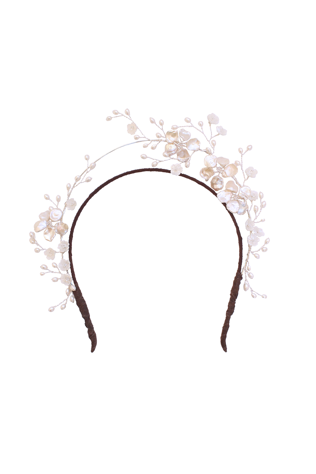 A floating halo of pearl flowers are embellished with clusters of freshwater pearls and Swarovski crystals. The comfortable band is ribboned to suit the hair tone to allow the beautiful details to appear floating in the hair.